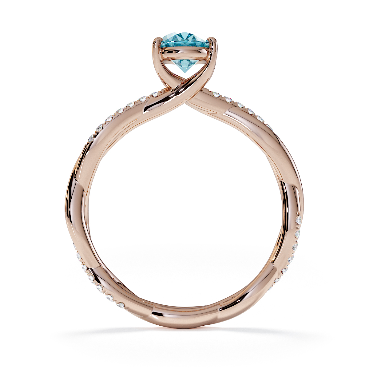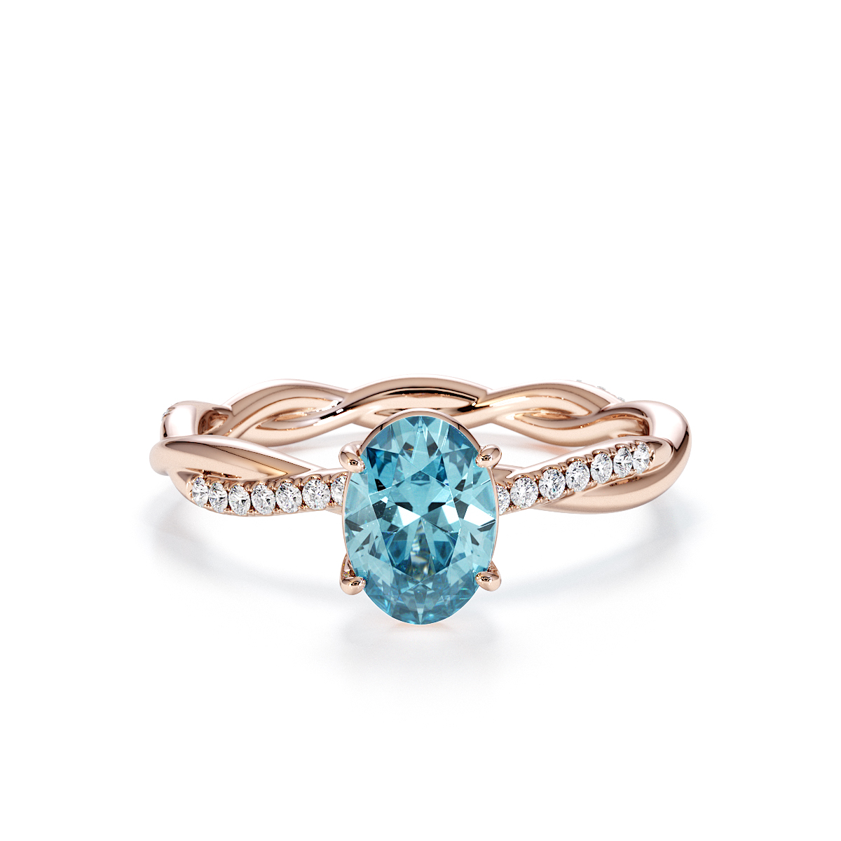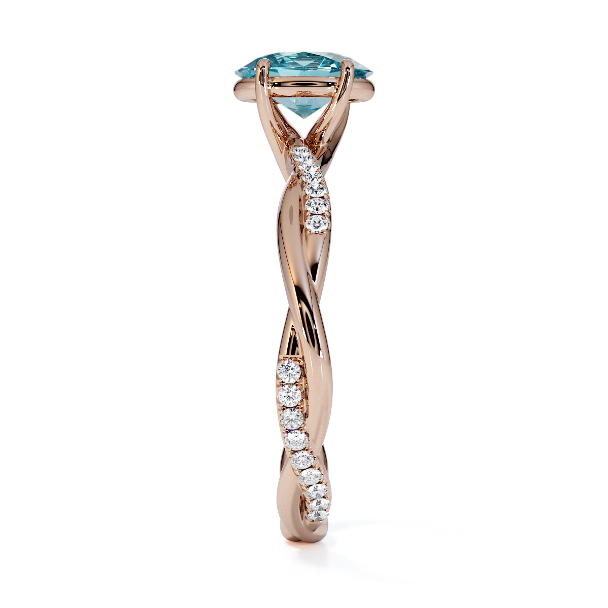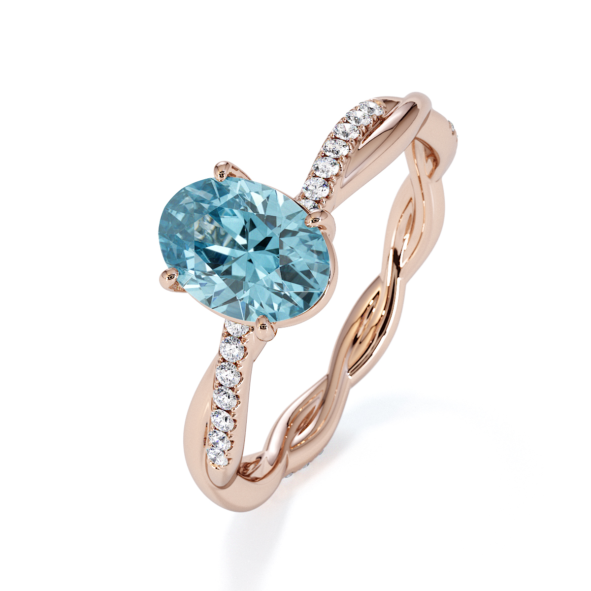Elevate your style with bold elegance with this stunning oval-cut Aquamarine and Diamond Engagement Ring. Featuring twist designs along the shoulders and delicate prong-set diamonds, it adds a touch of sparkle.