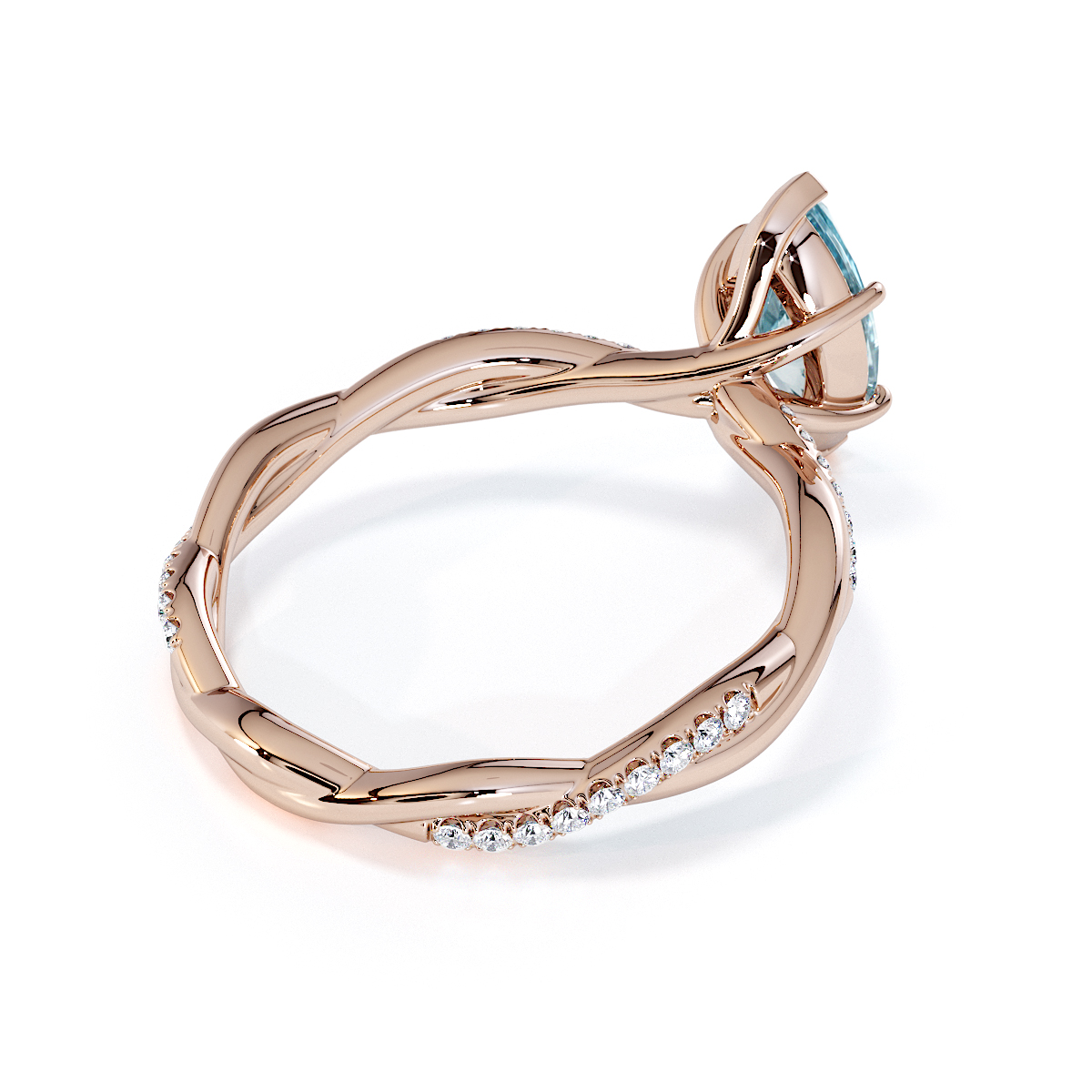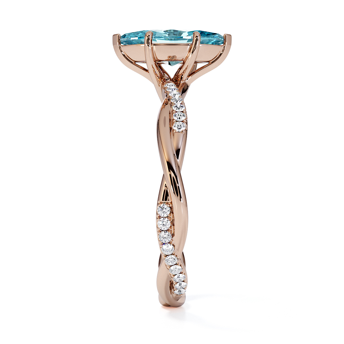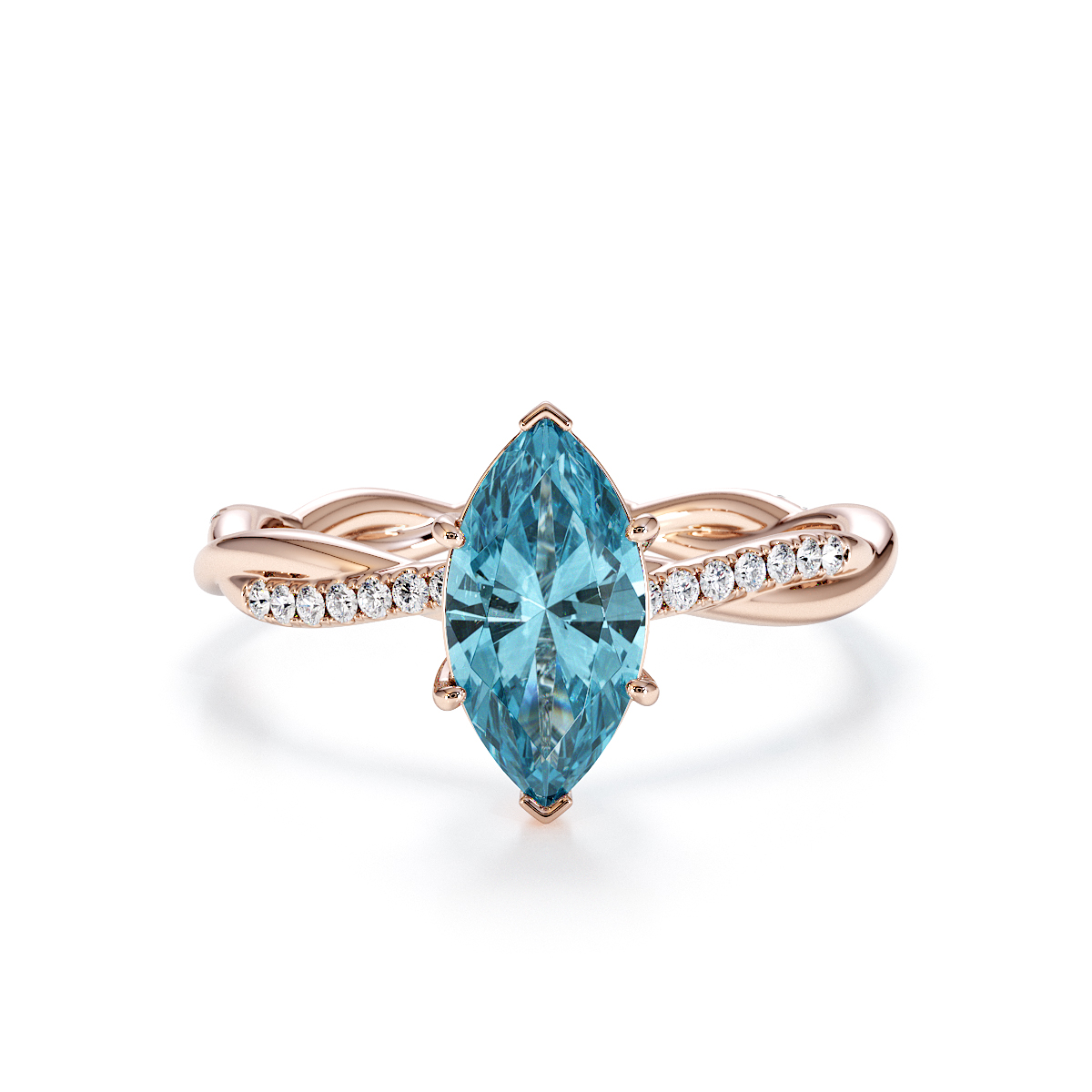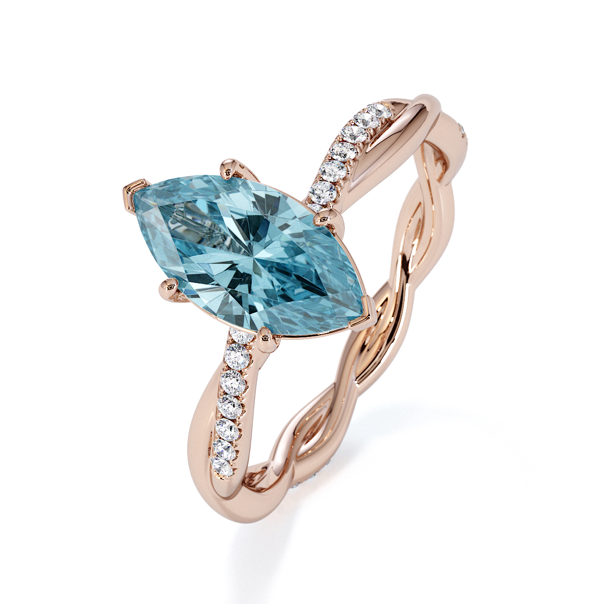 Presenting our stunning Marquise Cut Aquamarine and Diamond Engagement Ring. The ring is further adorned with prong-set diamonds running up the twisted shoulders. It perfectly complements the wedding ring of your choice.