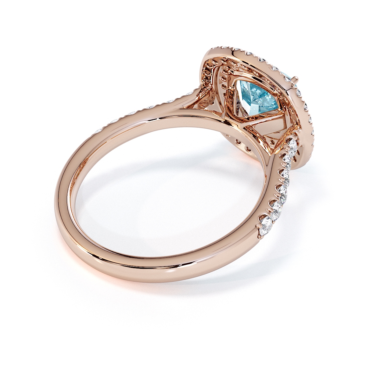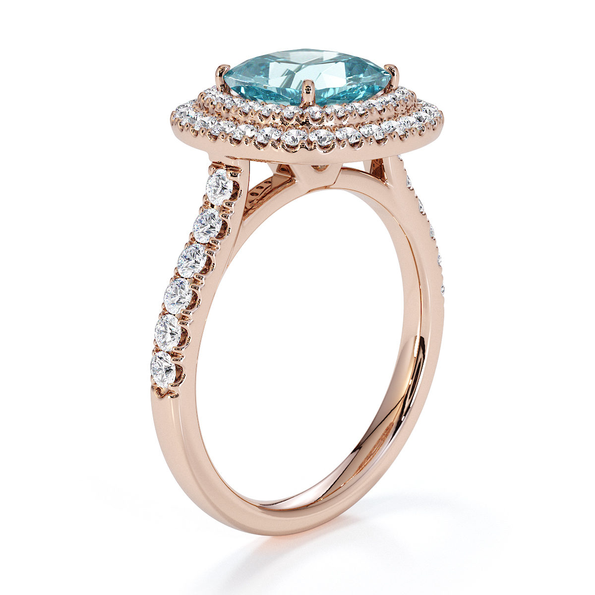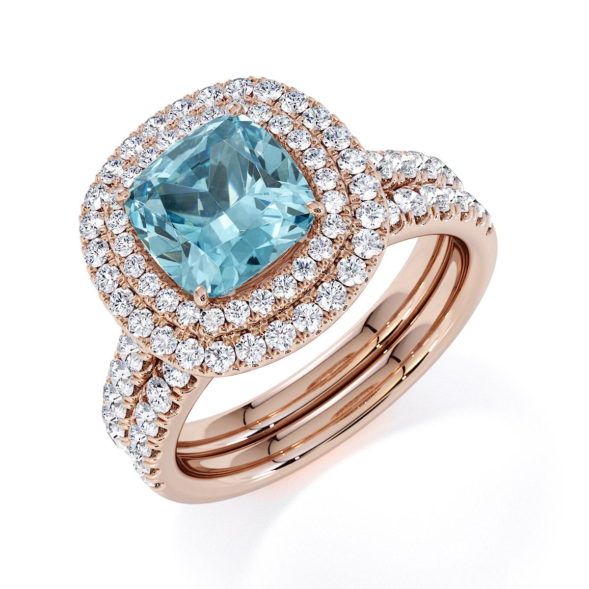 We are presenting our stunning Cushion Cut Aquamarine and Diamond Engagement Ring, showcasing a double halo design and prong-set stones for exceptional brilliance.