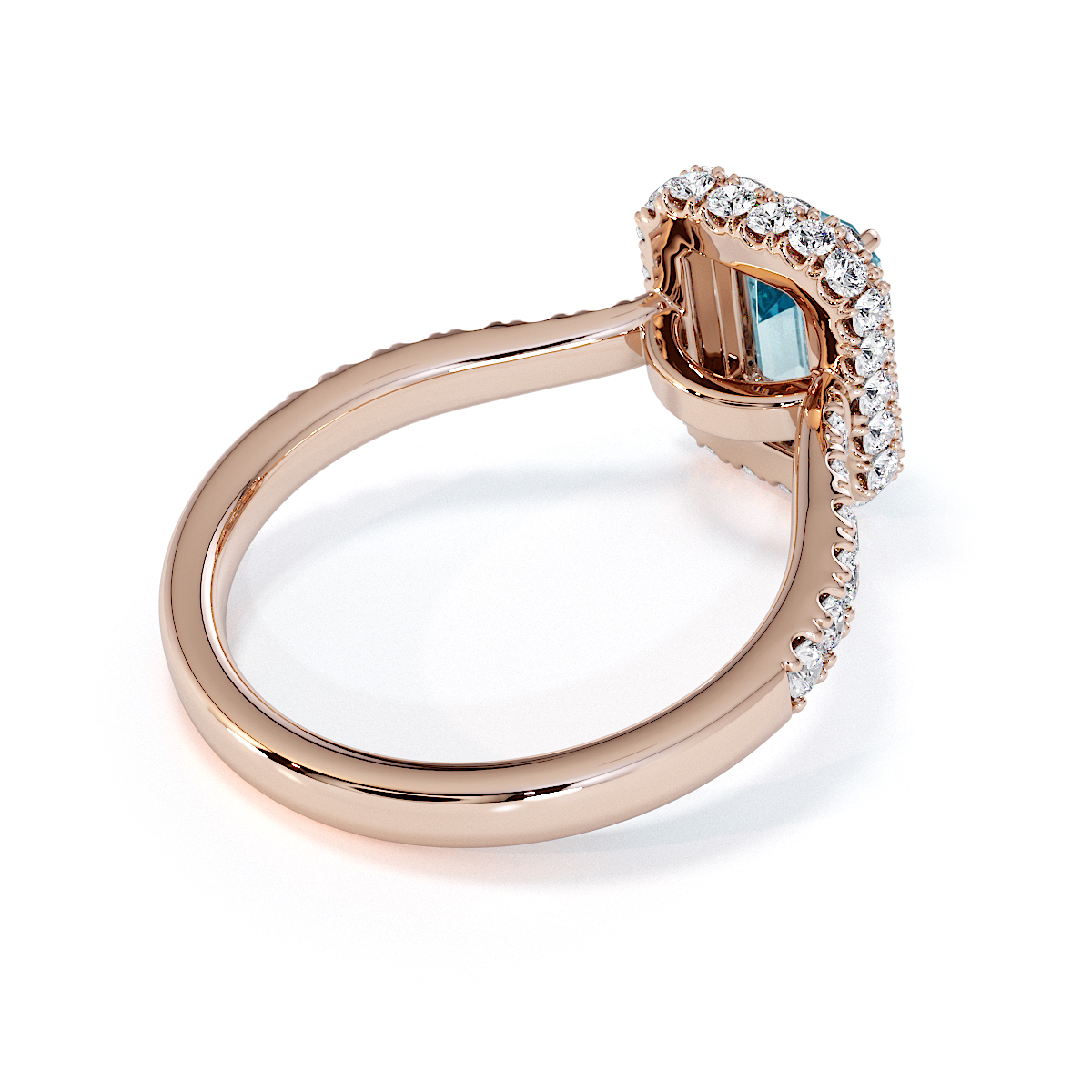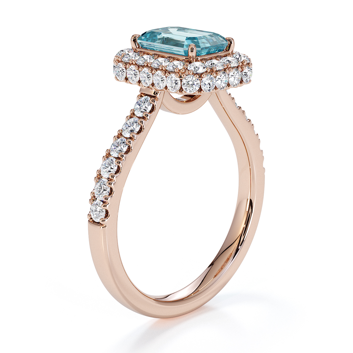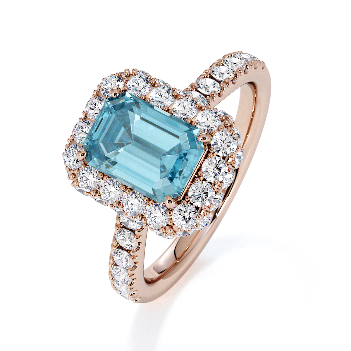 Experience timeless elegance with our exquisite Emerald Cut Aquamarine and Diamond Engagement Ring, featuring a halo of diamonds and prong-set stones. A perfect symbol of everlasting love and sophistication.