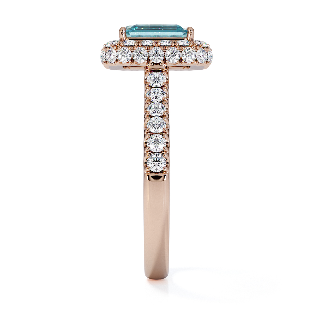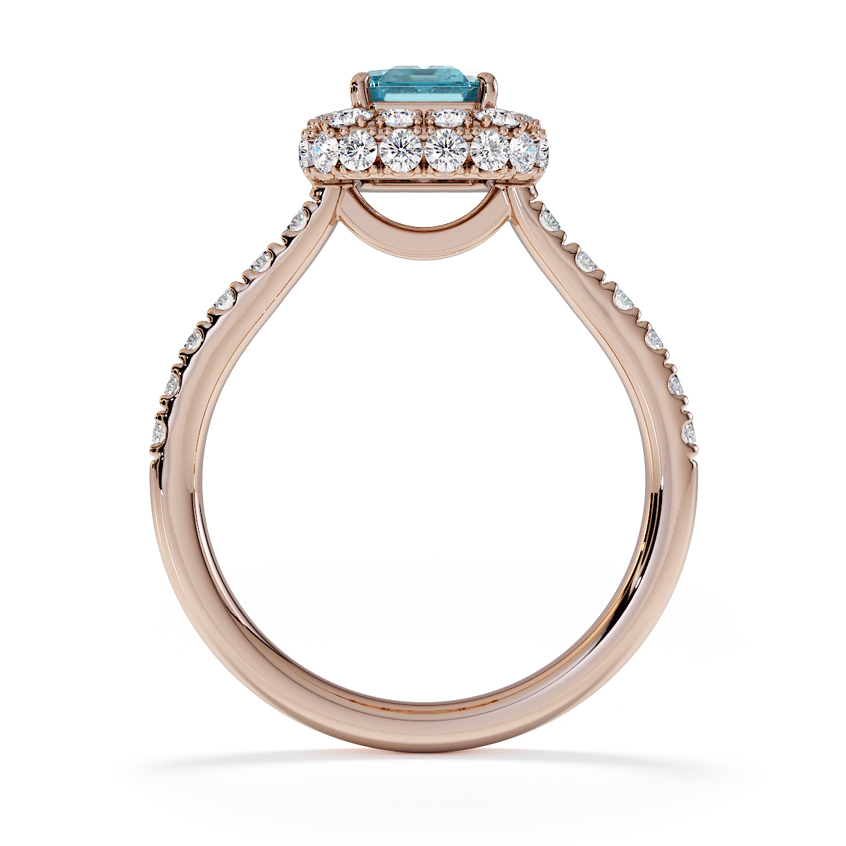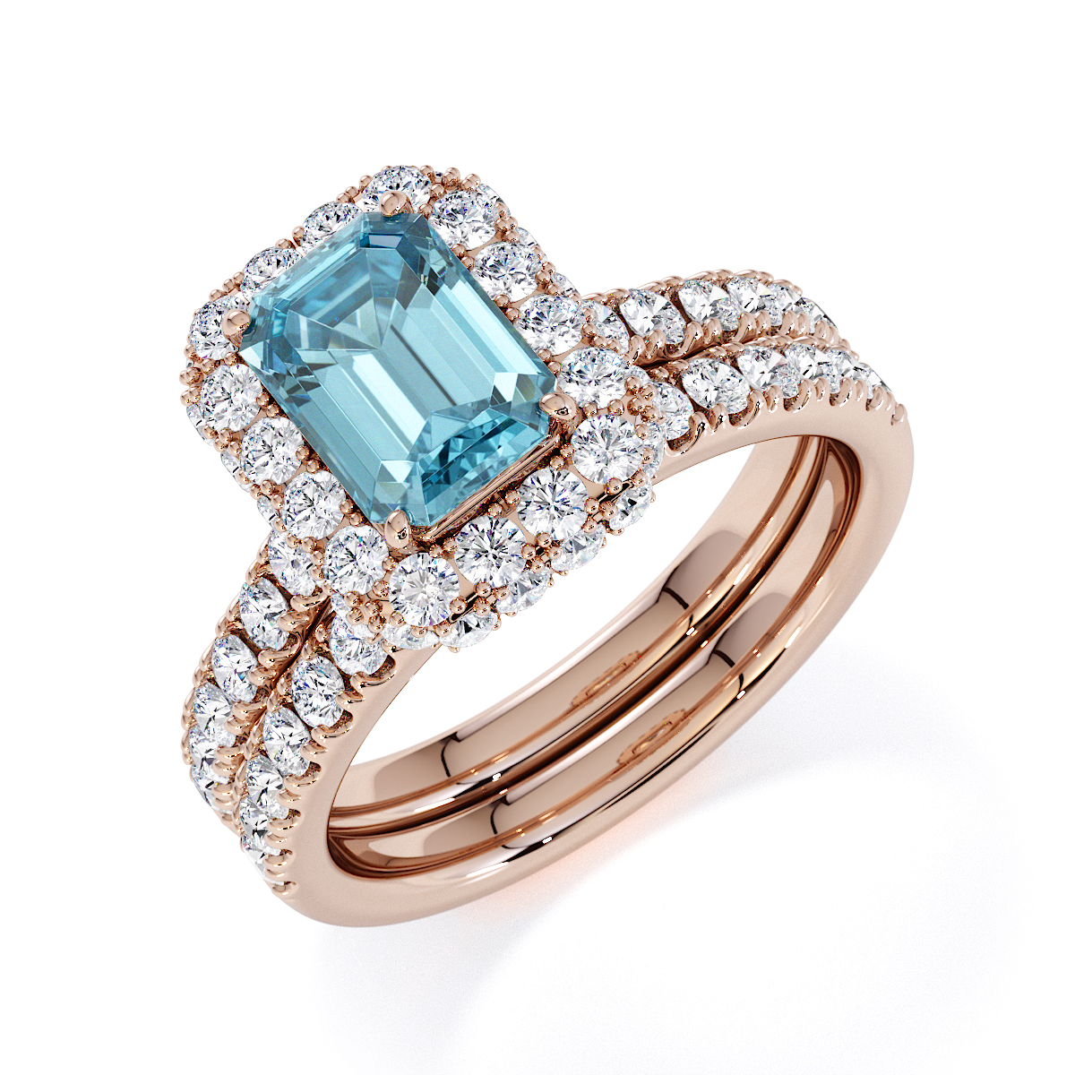 Experience timeless elegance with our exquisite Emerald Cut Aquamarine and Diamond Engagement Ring, featuring a halo of diamonds and prong-set stones. A perfect symbol of everlasting love and sophistication.