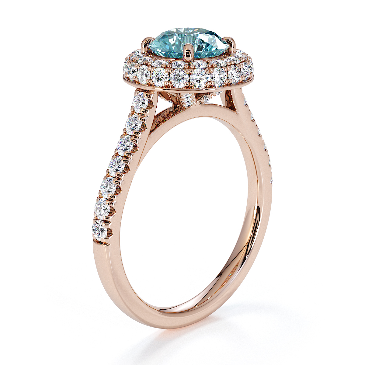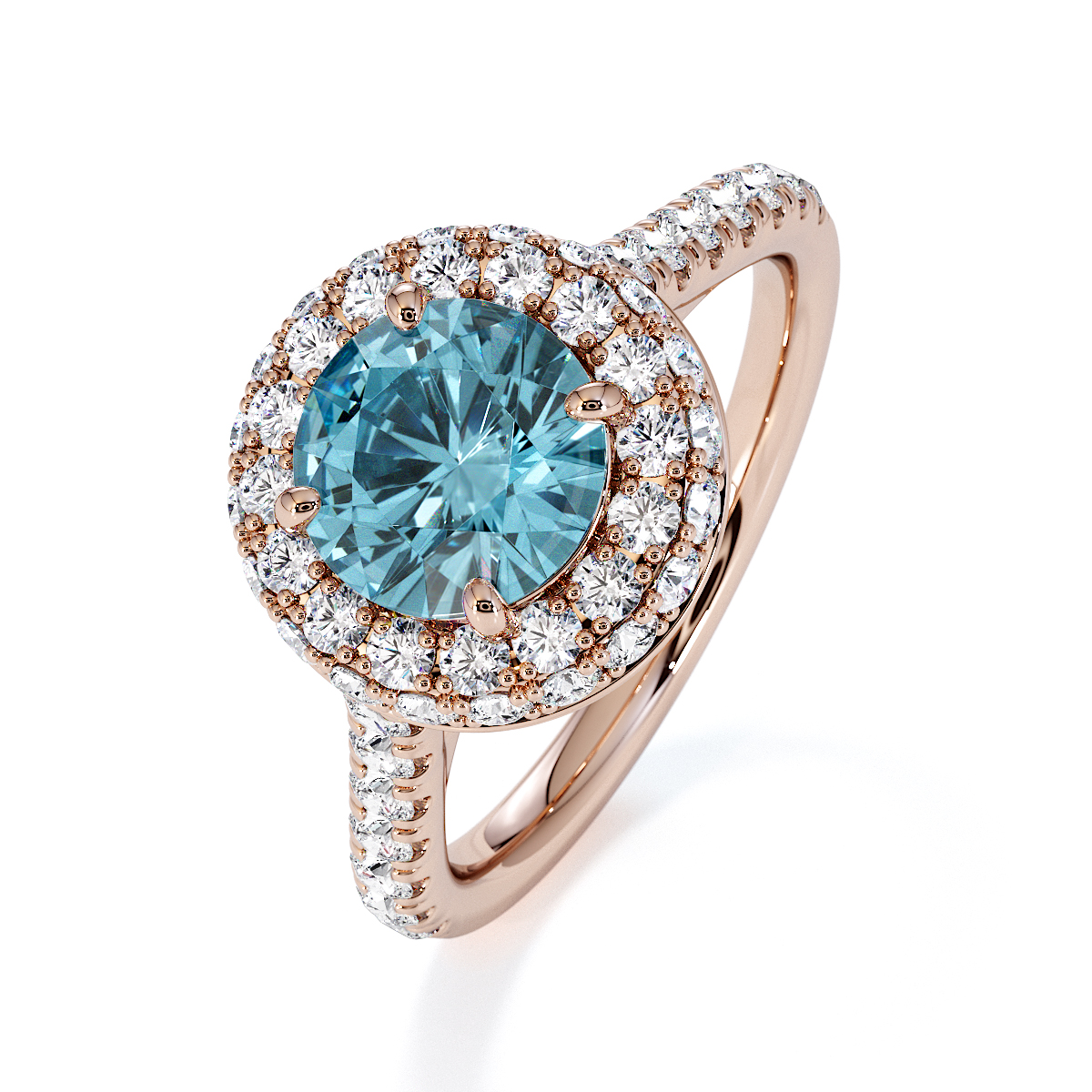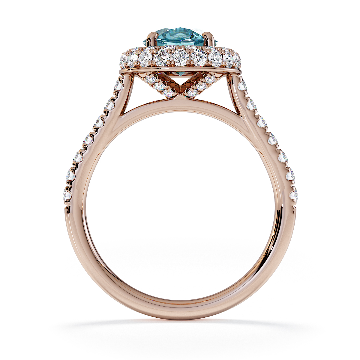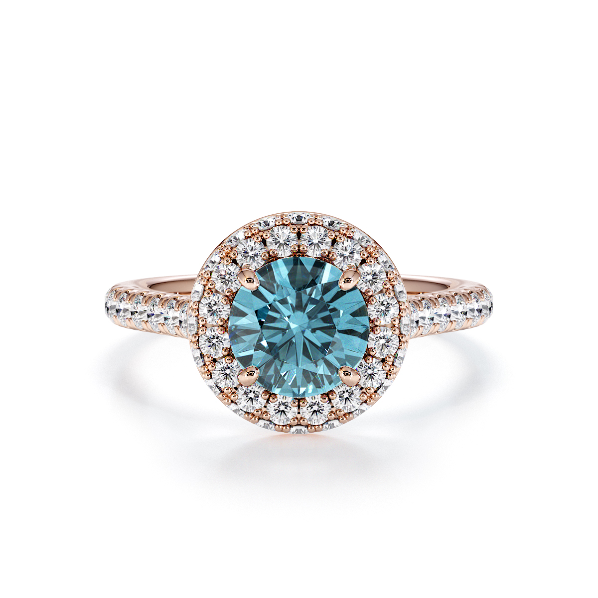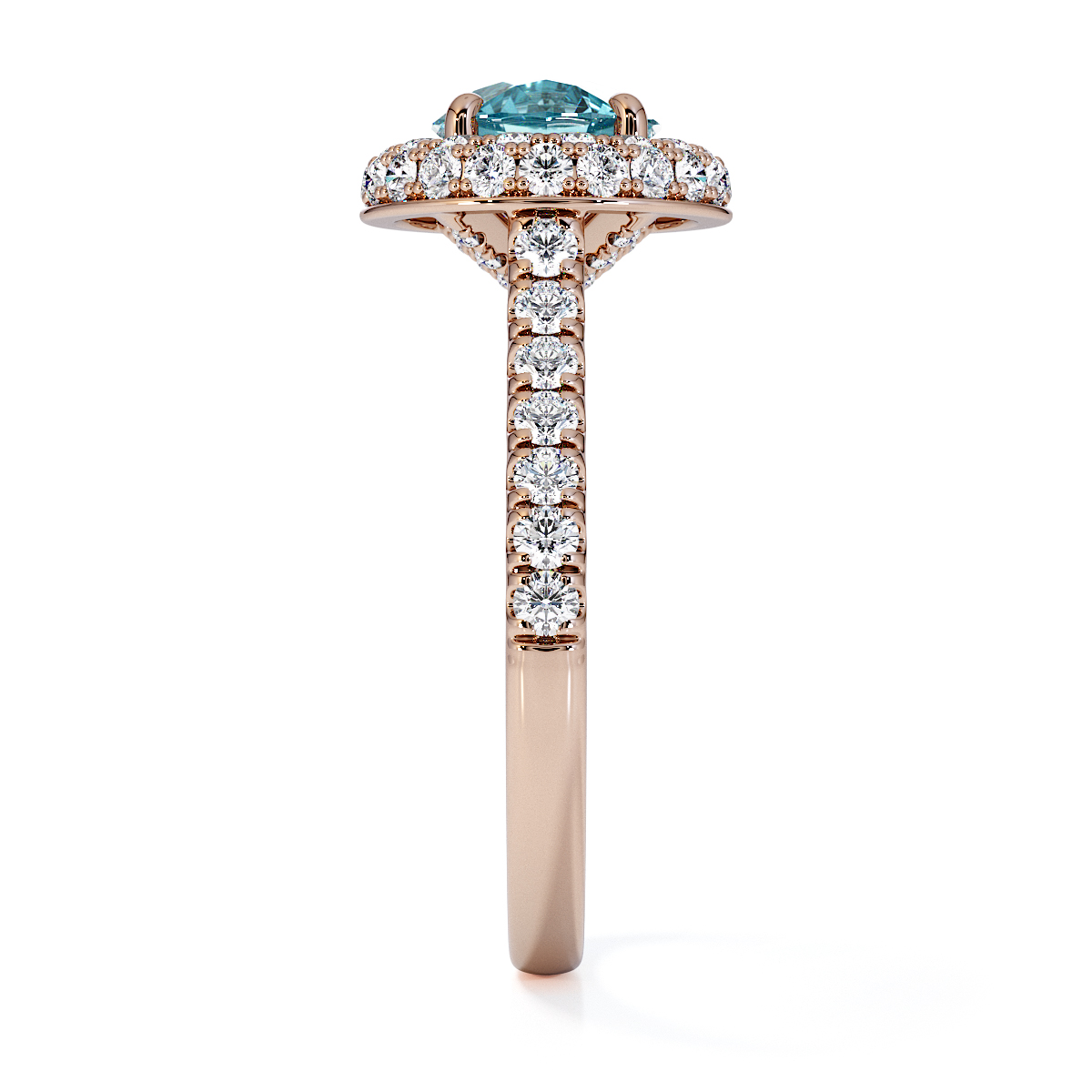 We are presenting our stunning round cut Aquamarine and Diamond Engagement Ring, showcasing a halo design and prong-set stones for exceptional brilliance.