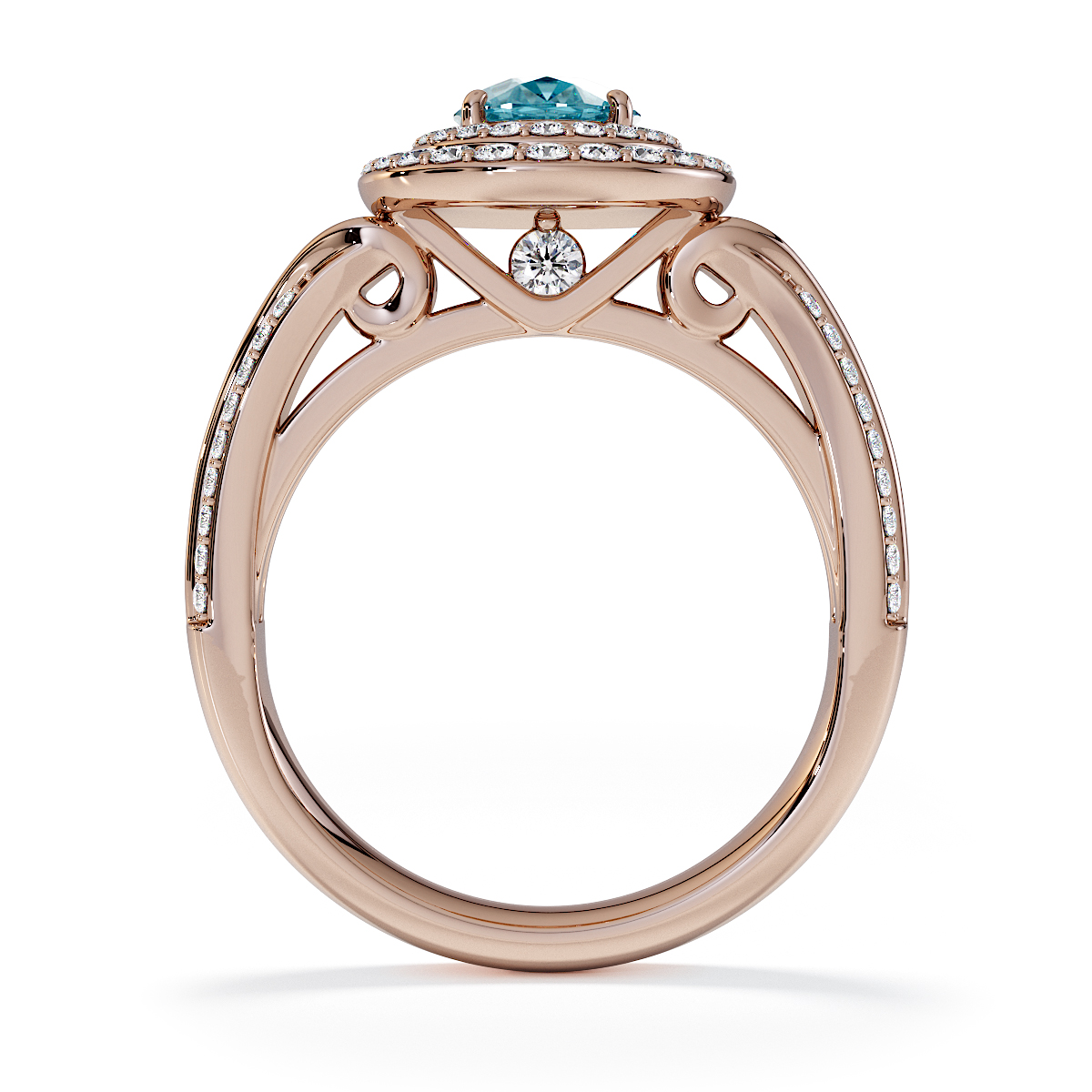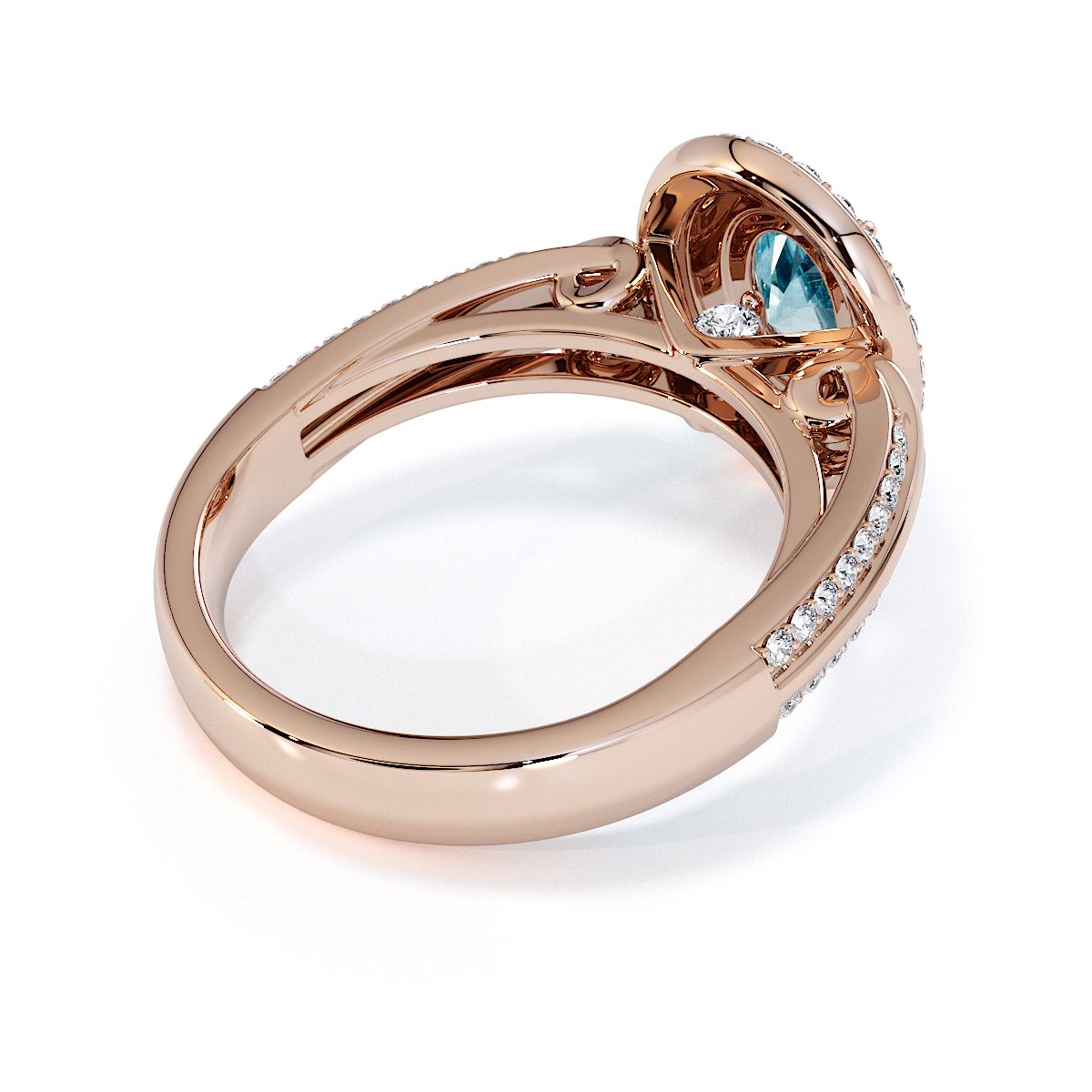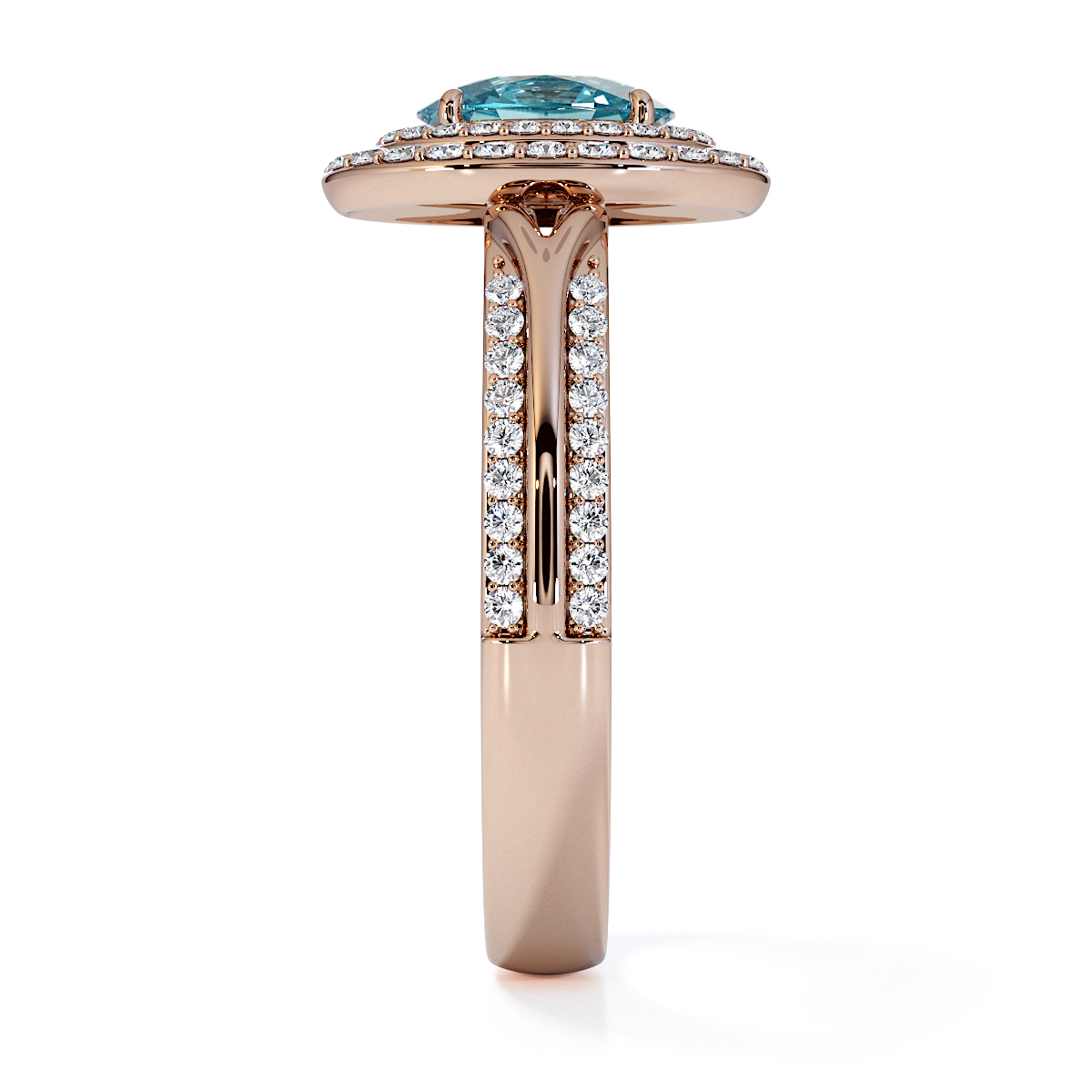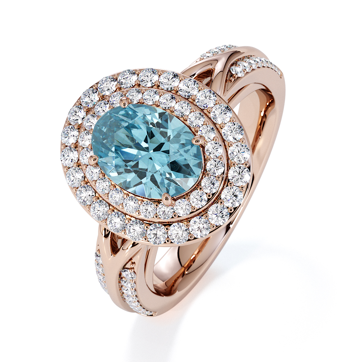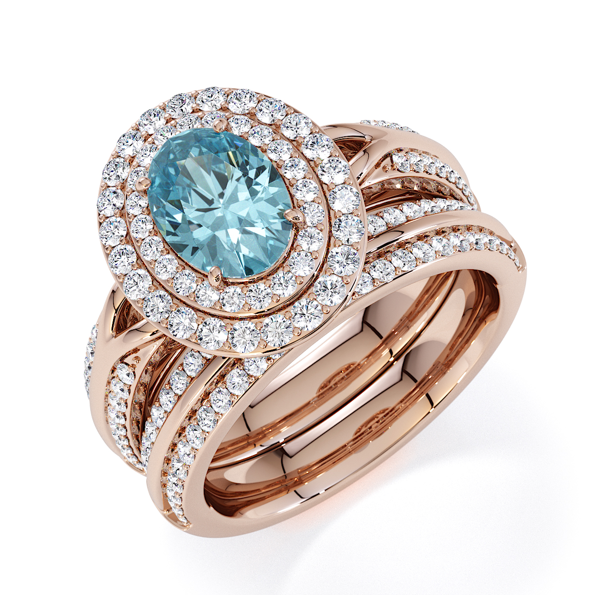 Featuring a gorgeous oval-shaped Aquamarine and Diamond Engagement Ring, centred and surrounded by a double halo of round brilliant stones, the ring is further adorned with prong-set diamonds running up the shoulders. This engagement ring sits beautifully with the wedding ring of your choice.