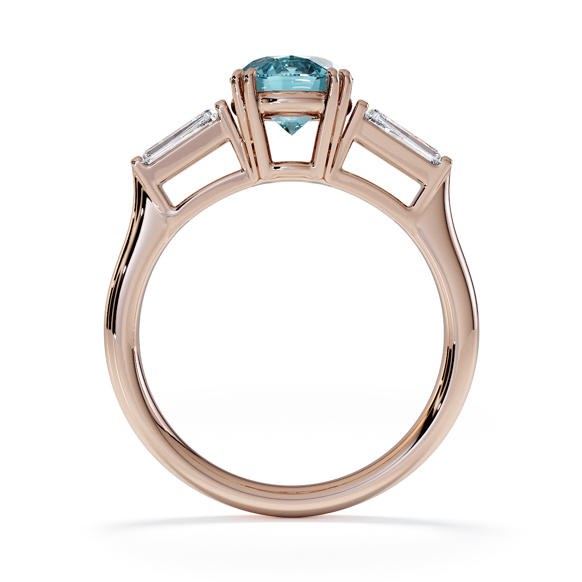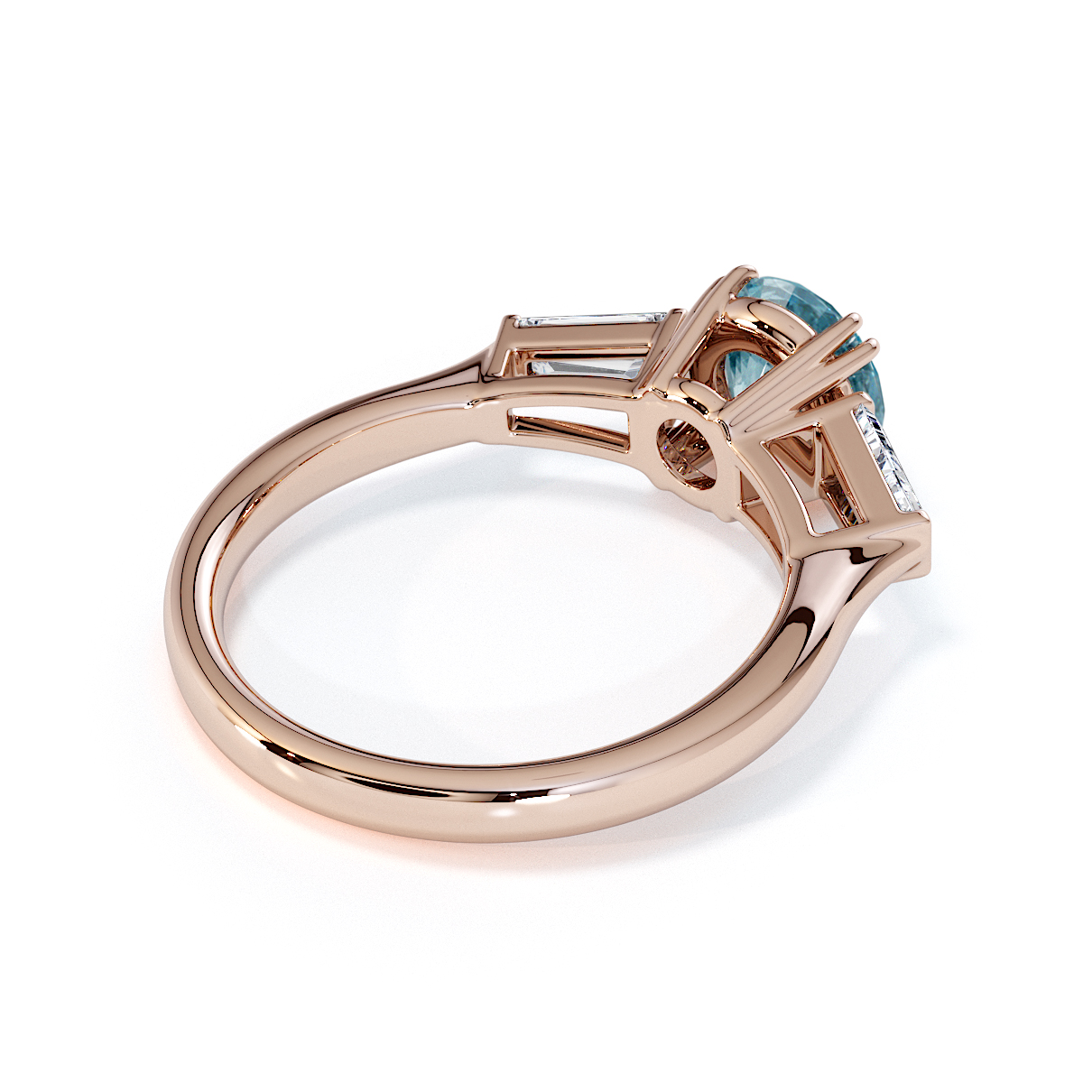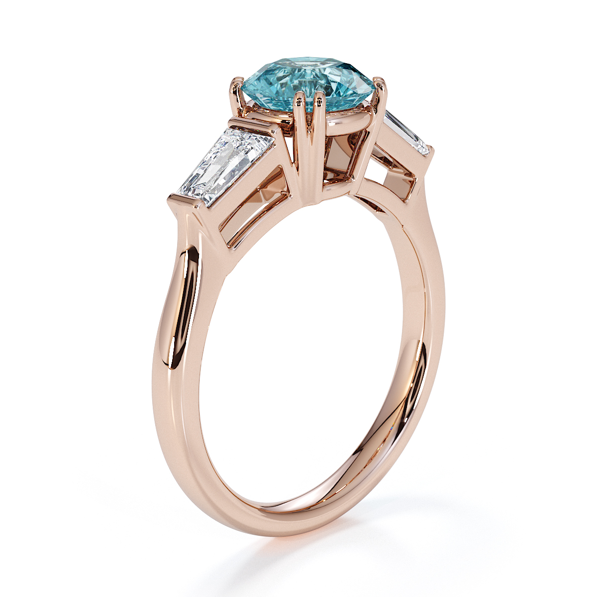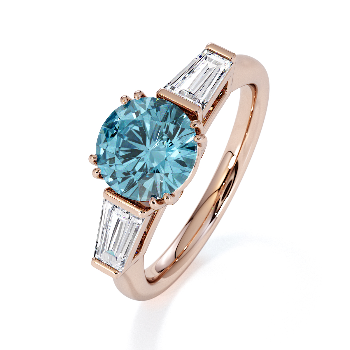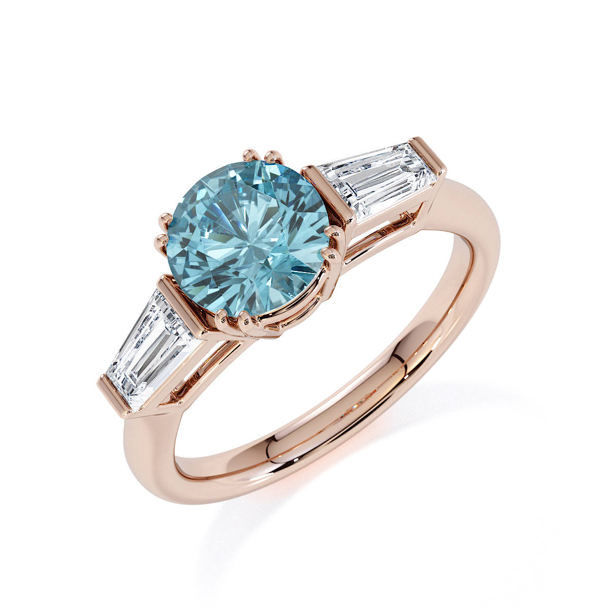 Introducing our exquisite round cut Aquamarine and Diamond Engagement Ring, adorned with tapered baguette side stones delicately prong-set.