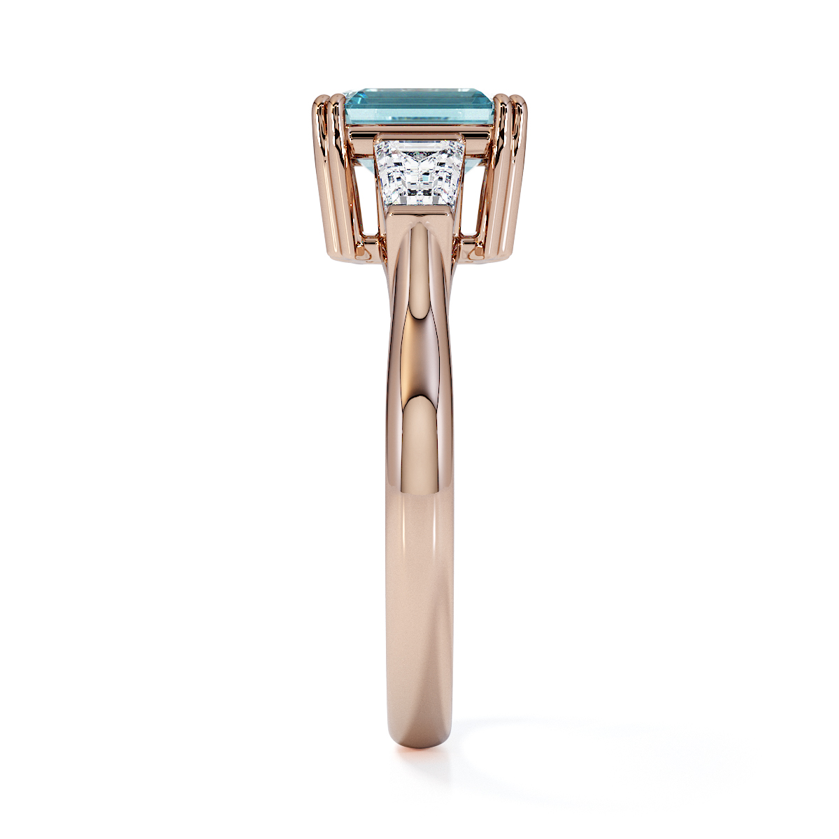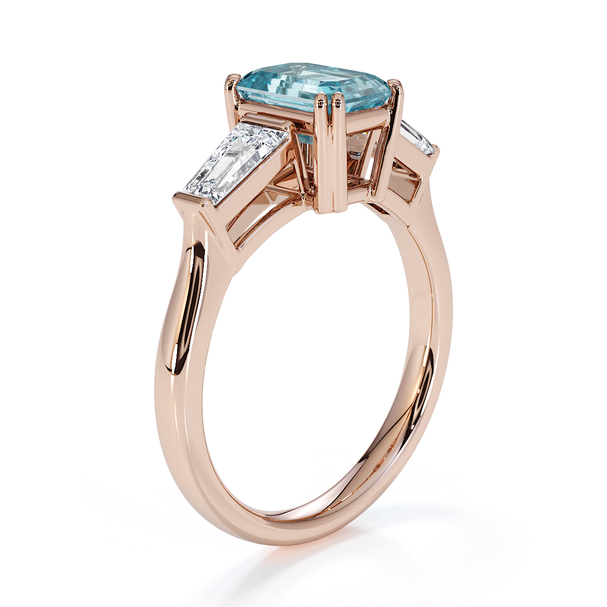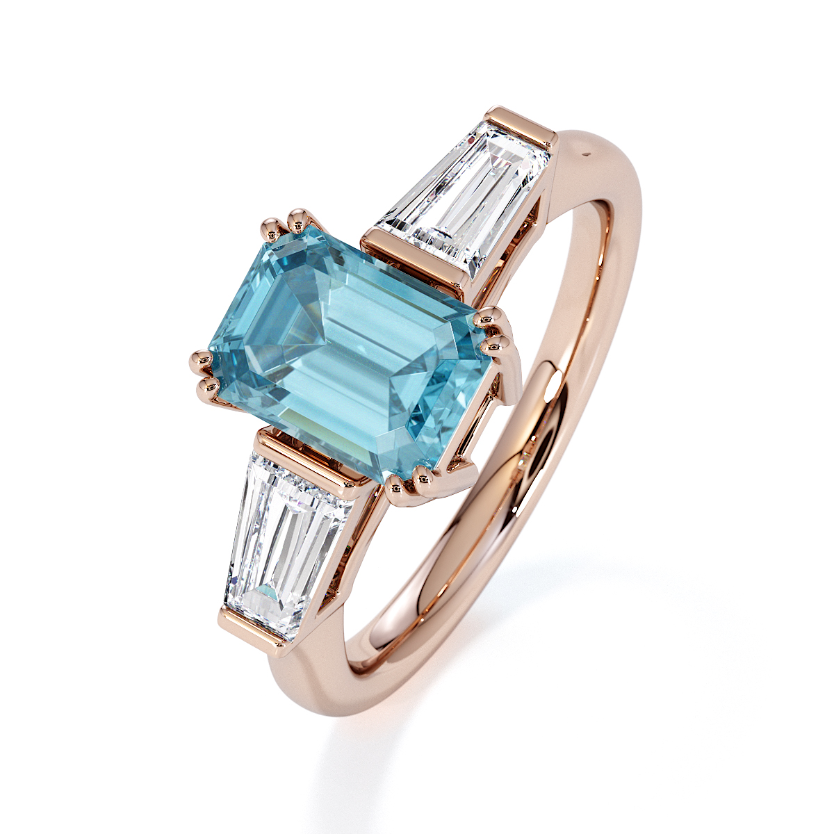 Introducing our exquisite Emerald-Cut Aquamarine and Diamond Engagement Ring, featuring elegant side-tapered baguette diamonds intricately prong-set.
