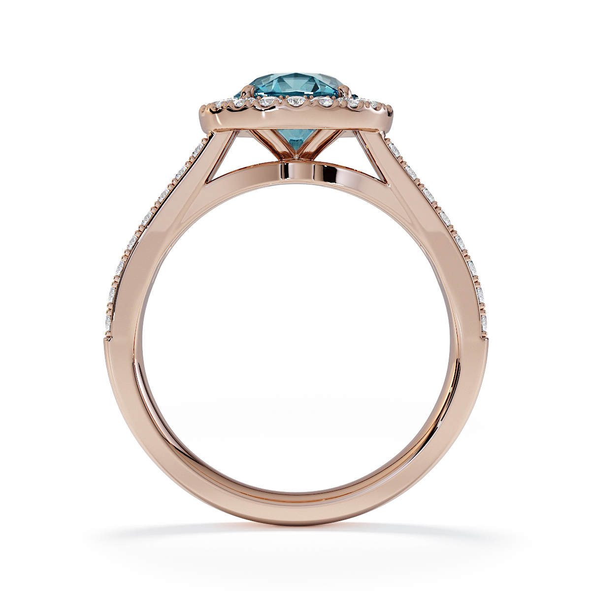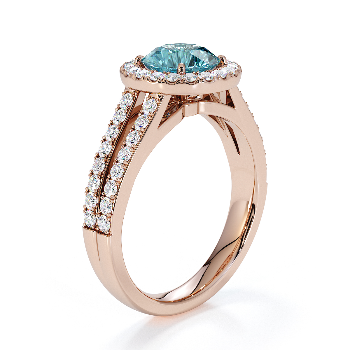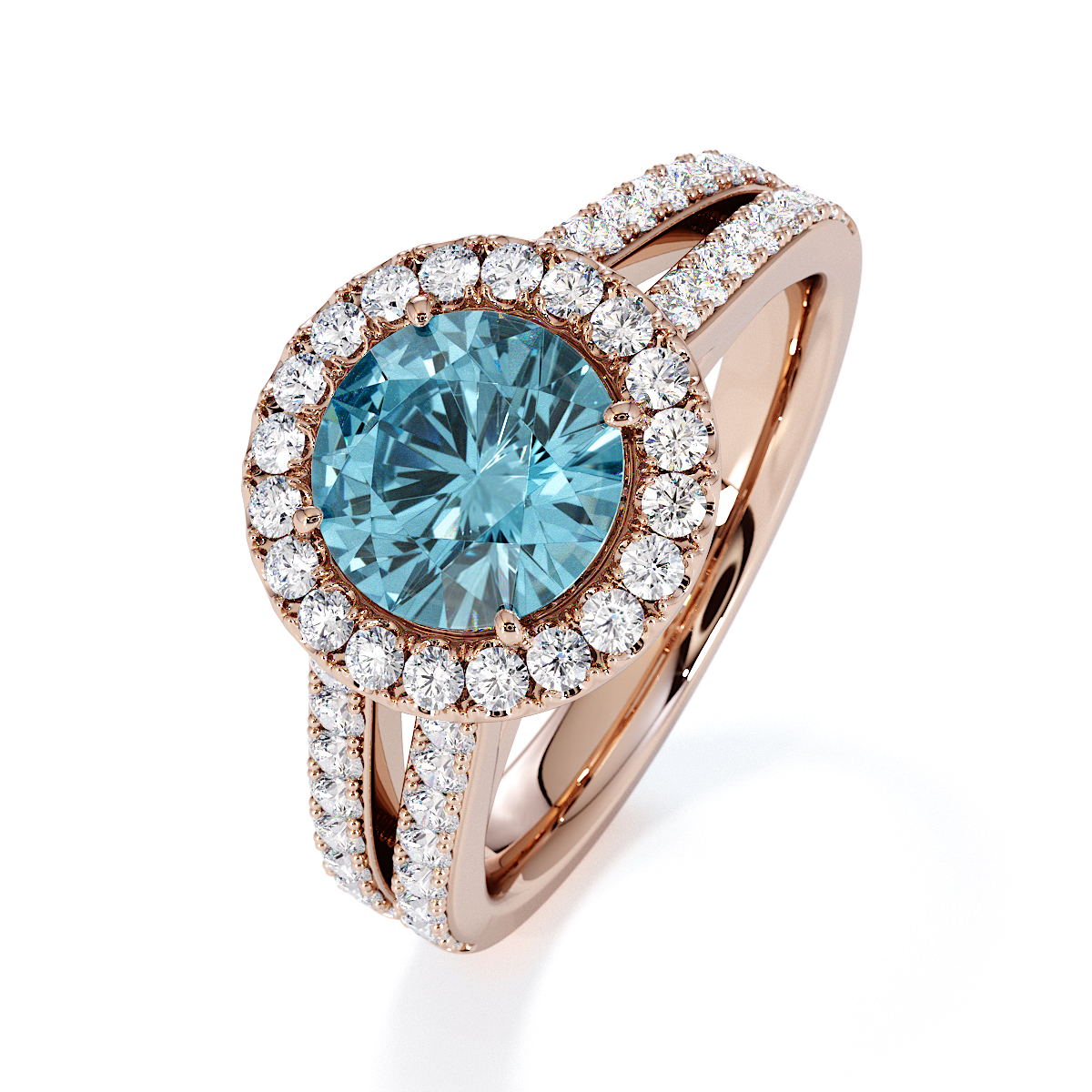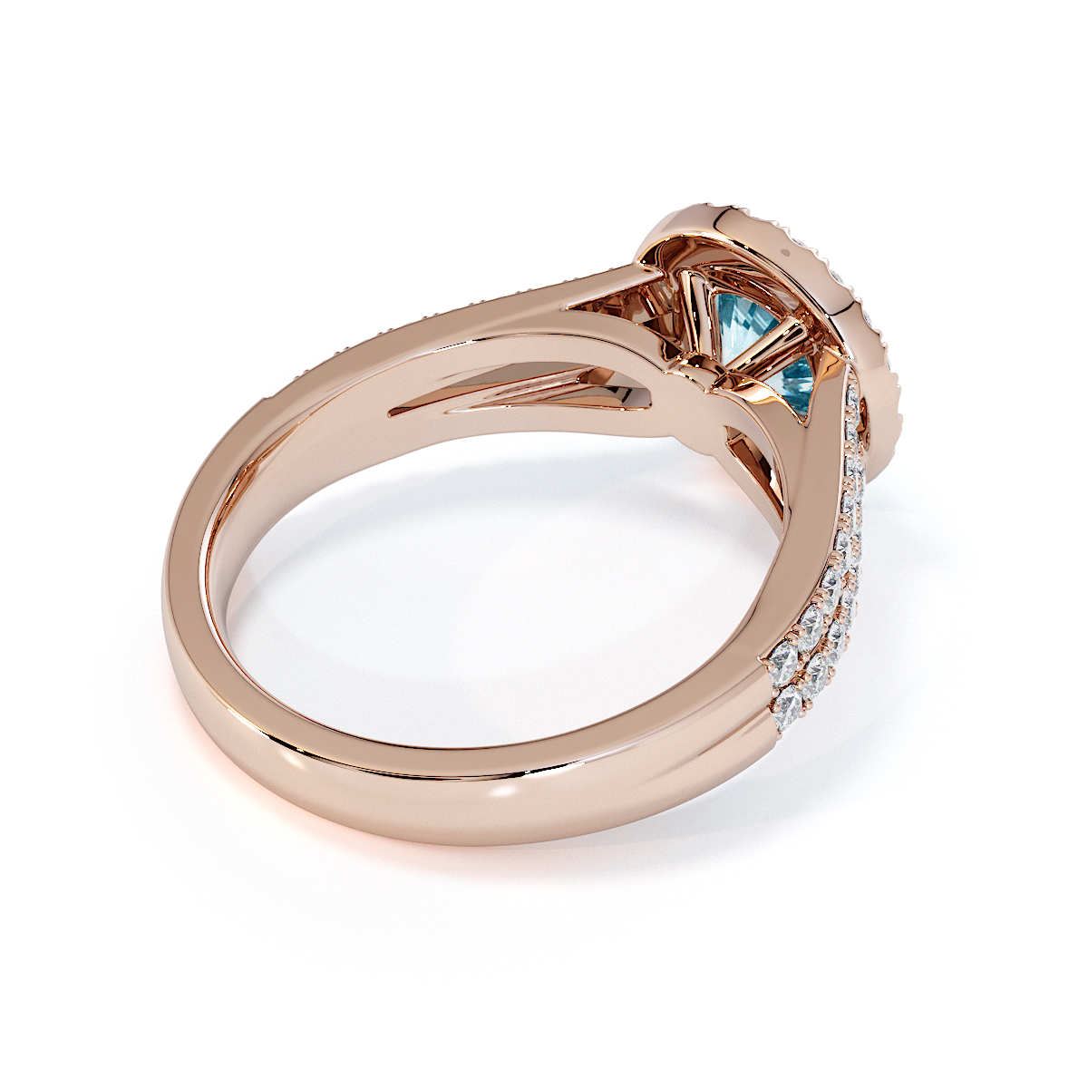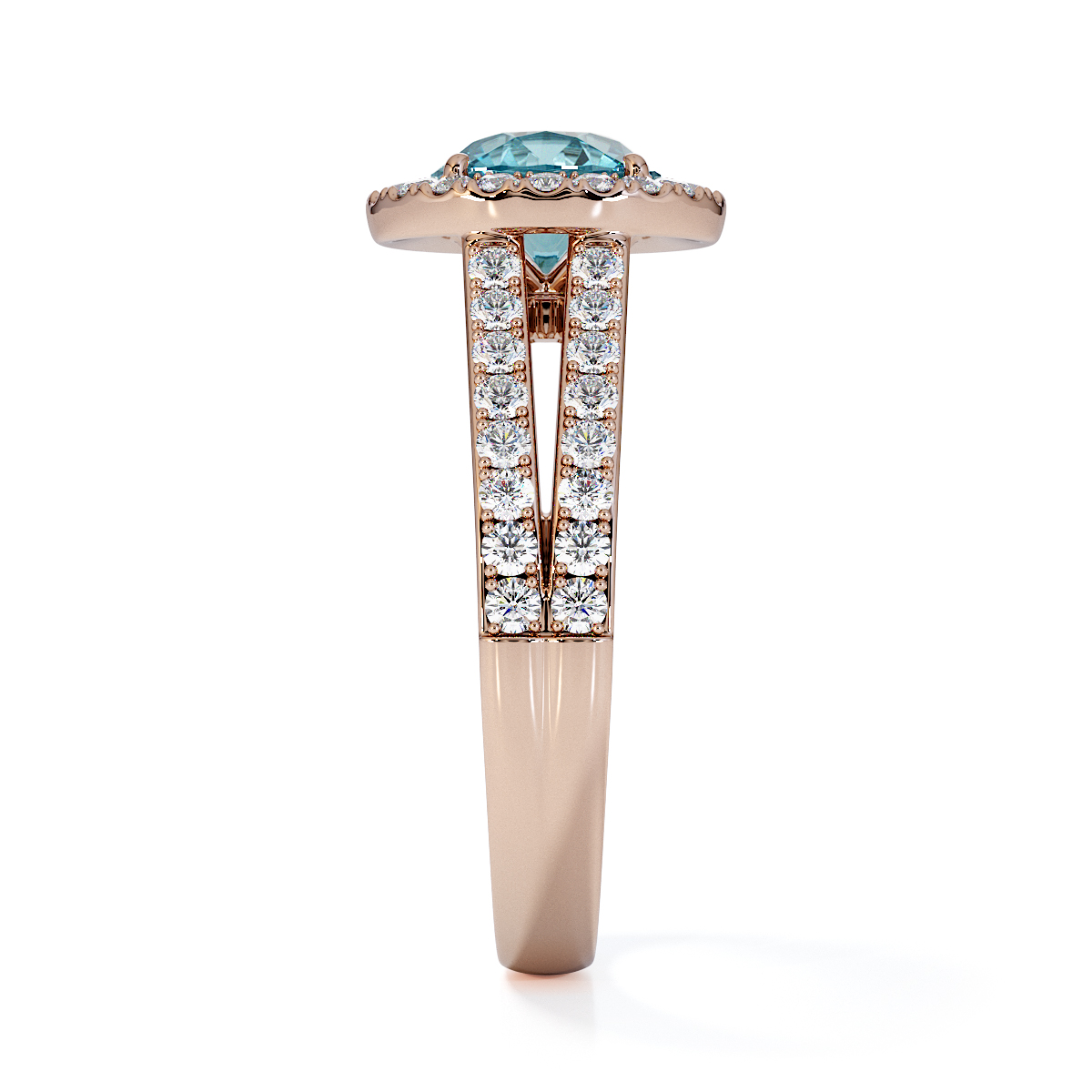 Featuring a gorgeous round-shaped Aquamarine and Diamond Engagement Ring surrounded by a halo of round brilliant stones, the ring is further adorned with prong-set diamonds running up the split shank shoulders. This engagement ring beautifully complements the wedding ring of your choice.