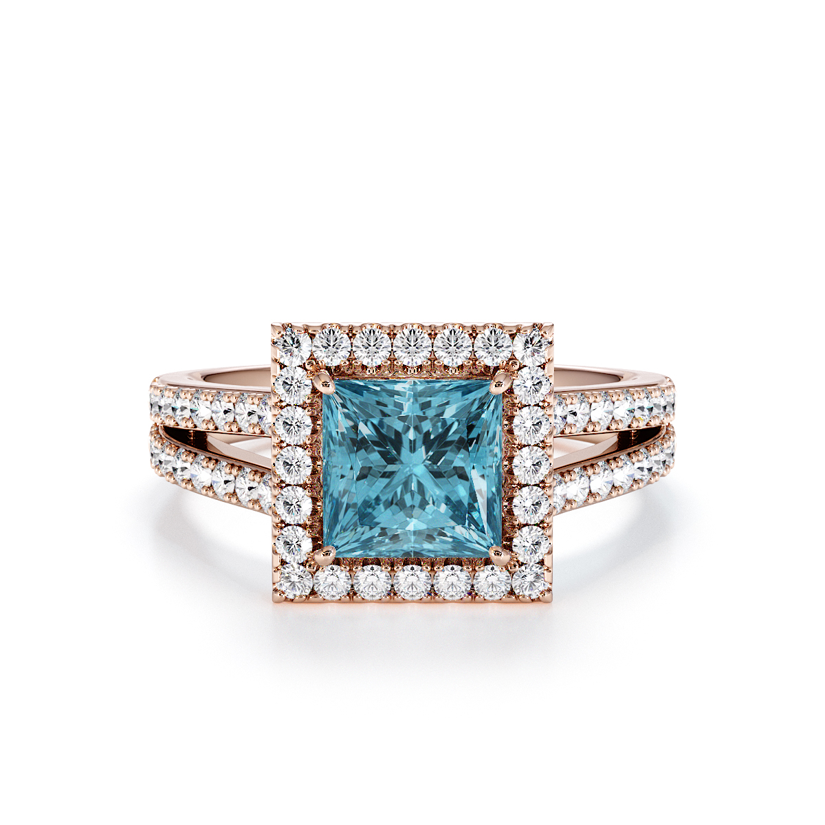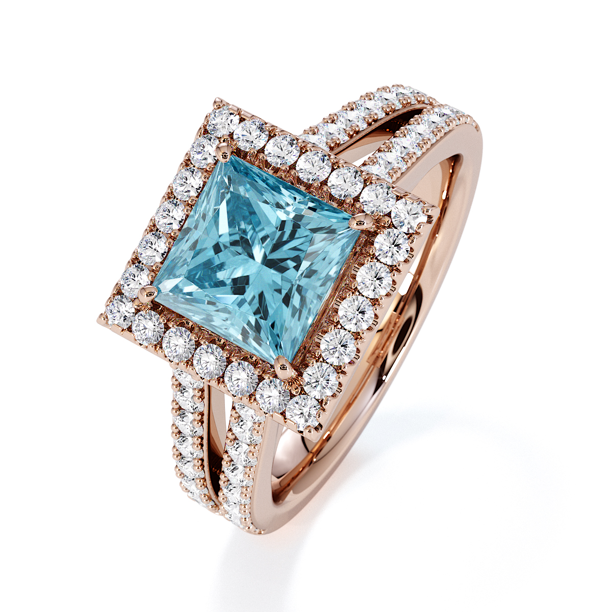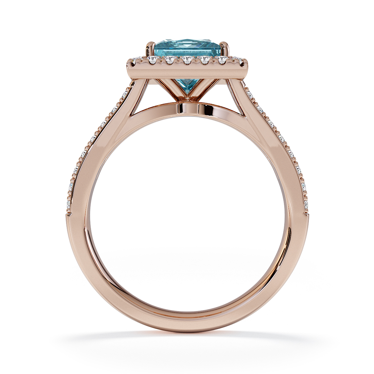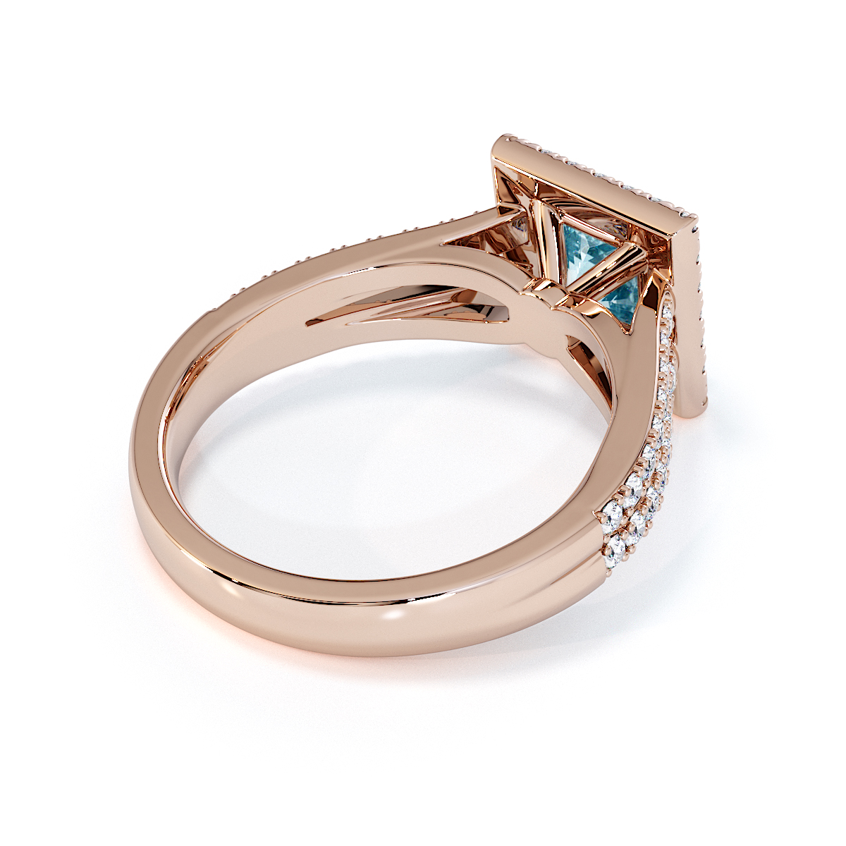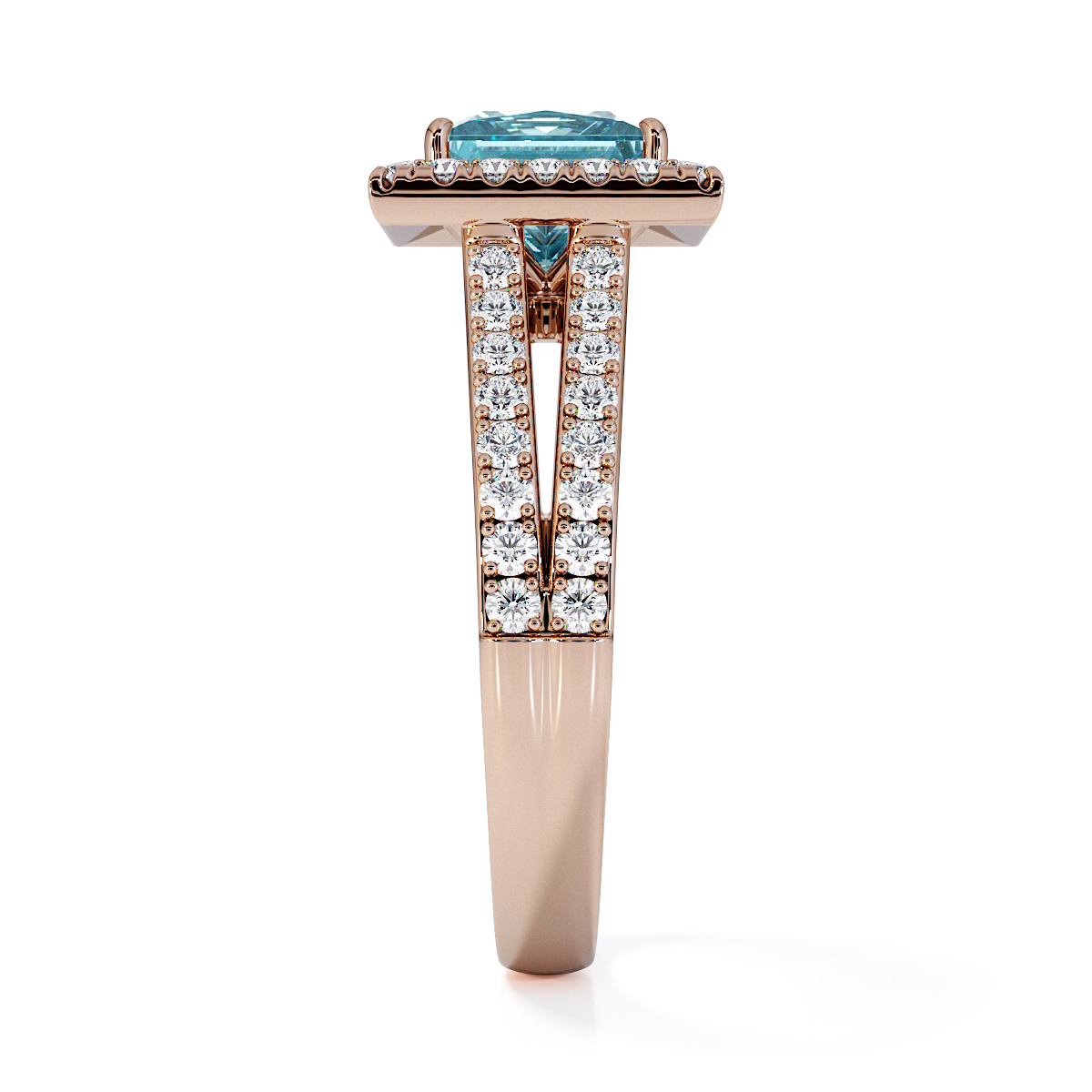Featuring a gorgeous princess-cut Aquamarine and Diamond Engagement Ring surrounded by a halo of round brilliant stones, the ring is further adorned with prong-set diamonds running up the split shank shoulders. This engagement ring beautifully complements the wedding ring of your choice.