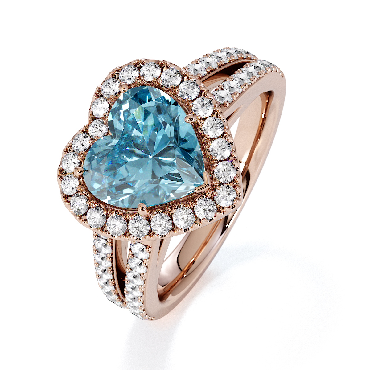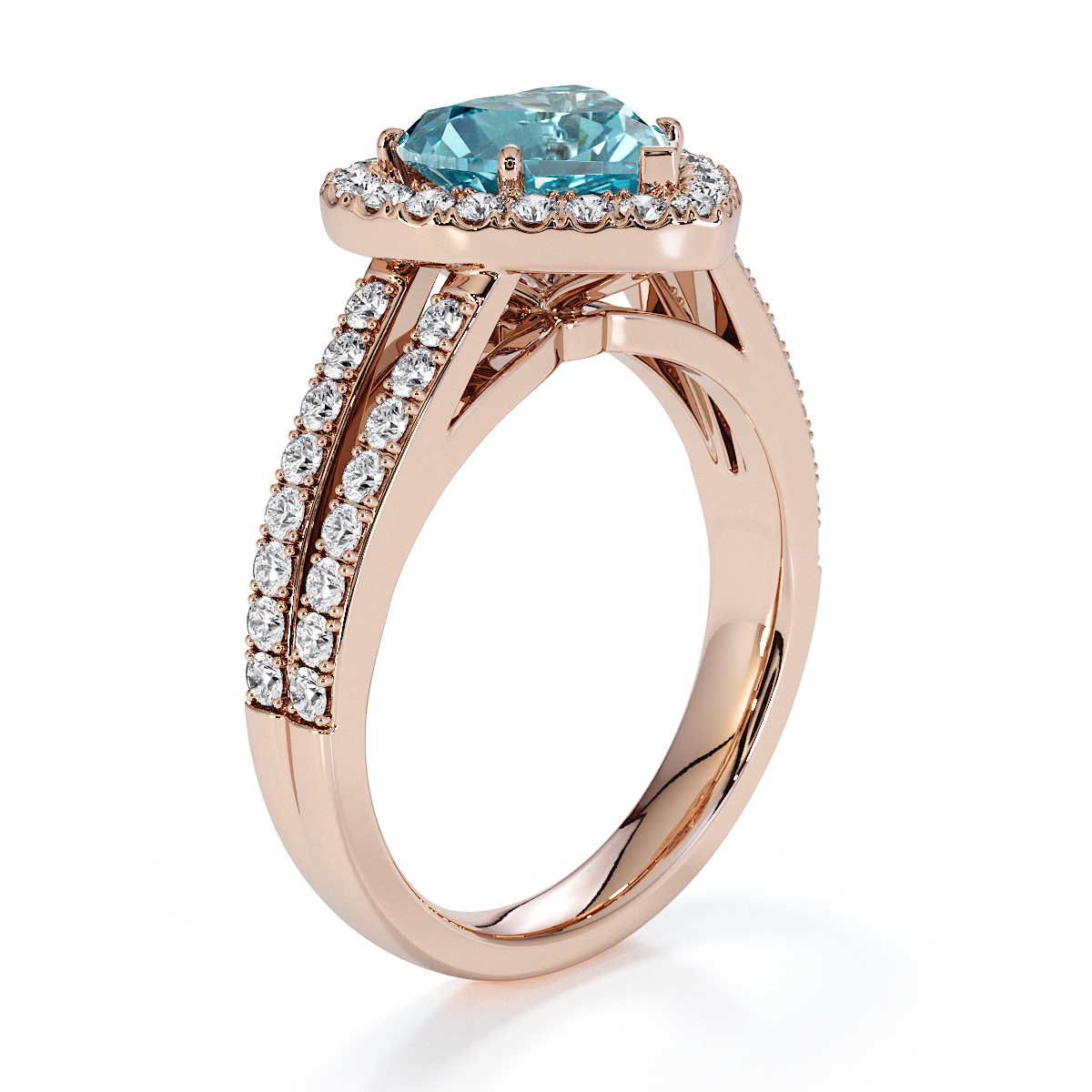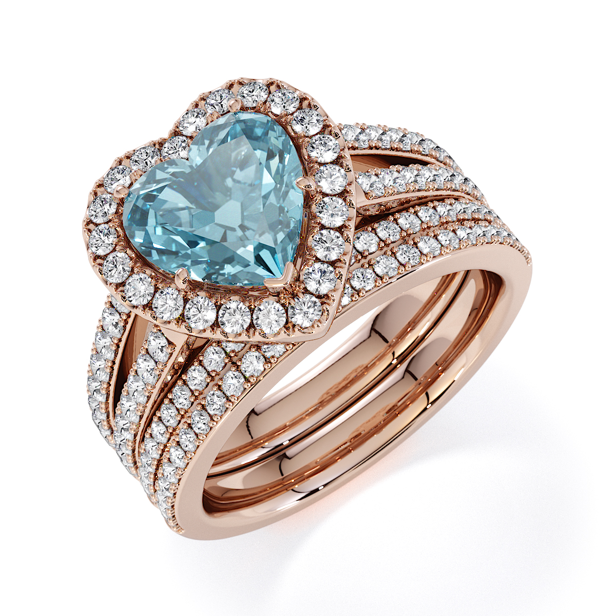 We are presenting our stunning Heart cut Aquamarine and Diamond Engagement Ring, featuring a sparkling halo of round-cut diamonds delicately set in prongs.