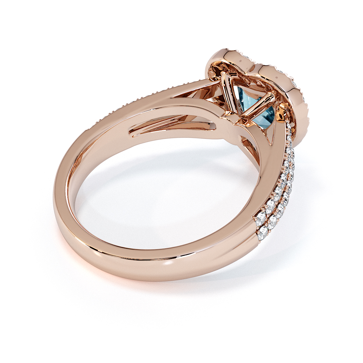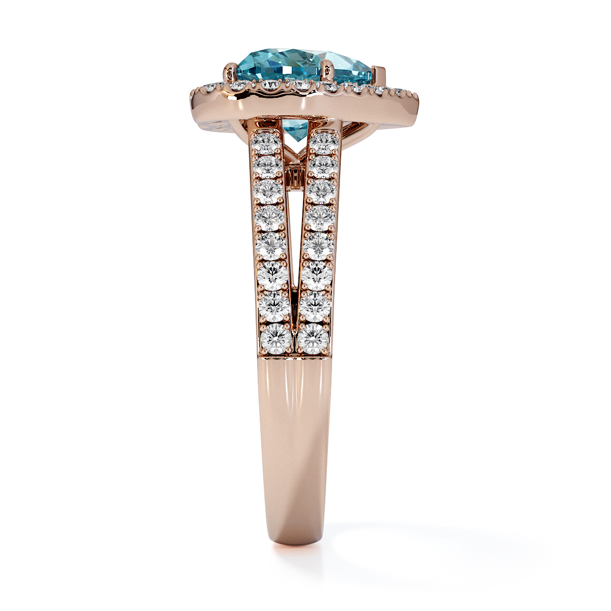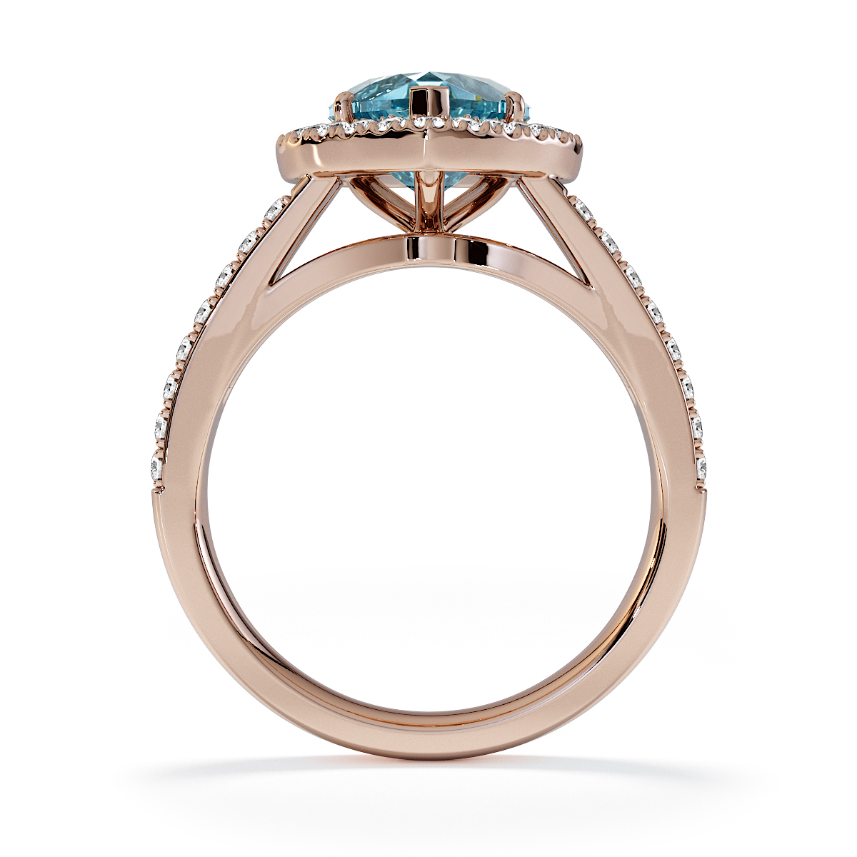 We are presenting our stunning Heart cut Aquamarine and Diamond Engagement Ring, featuring a sparkling halo of round-cut diamonds delicately set in prongs.