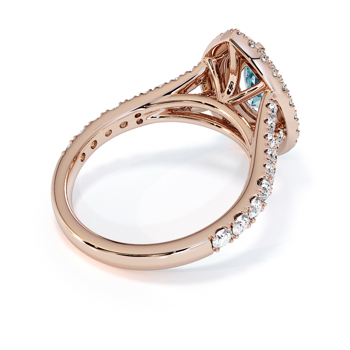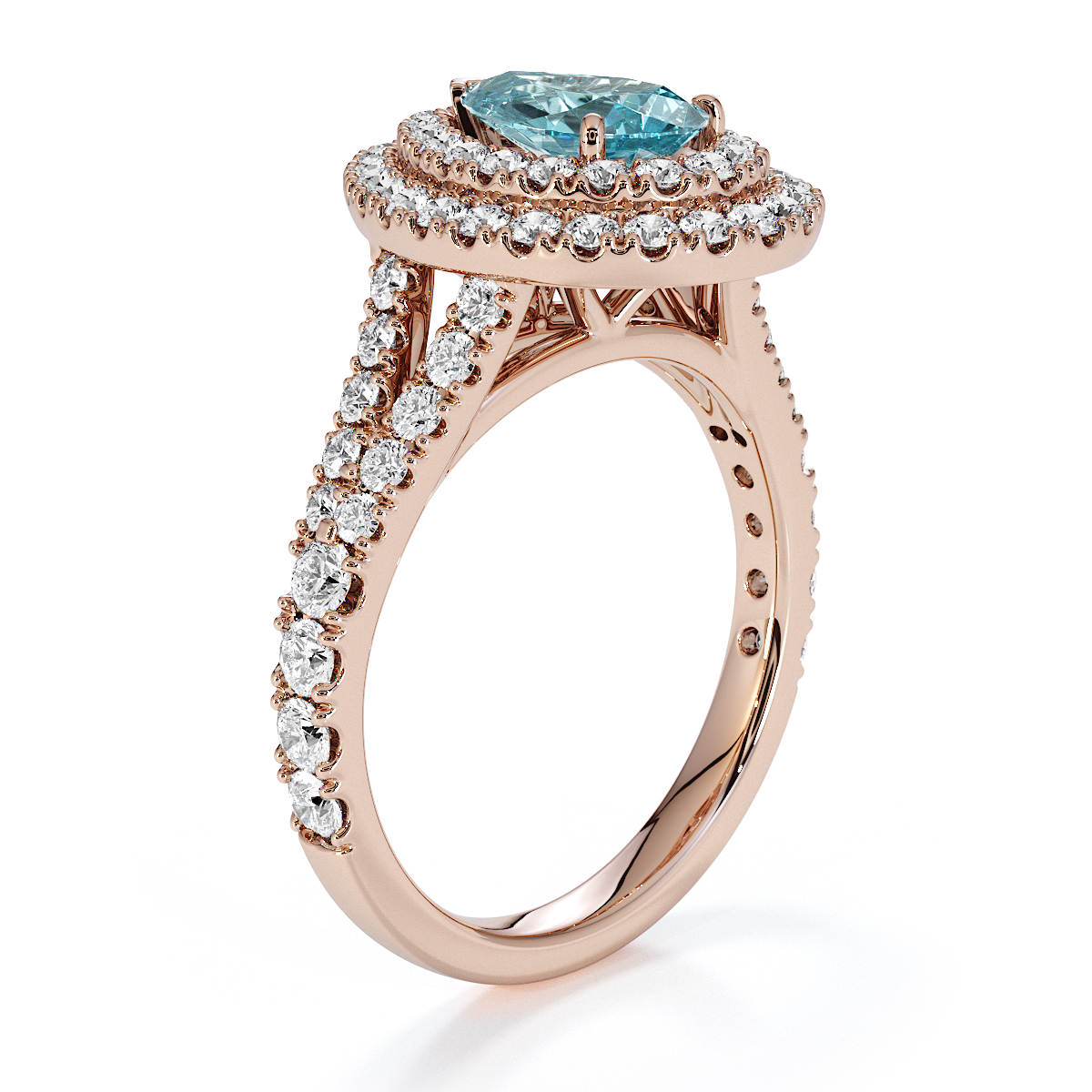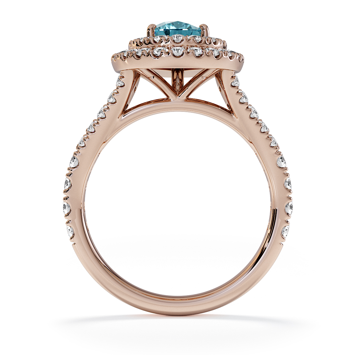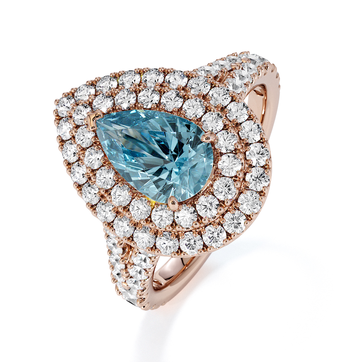 Featuring a gorgeous pear-shaped Aquamarine and Diamond Engagement Ring surrounded by a double halo of round brilliant stones, the ring is further adorned with prong-set diamonds running up the split shank shoulders. This engagement ring beautifully complements the wedding ring of your choice.