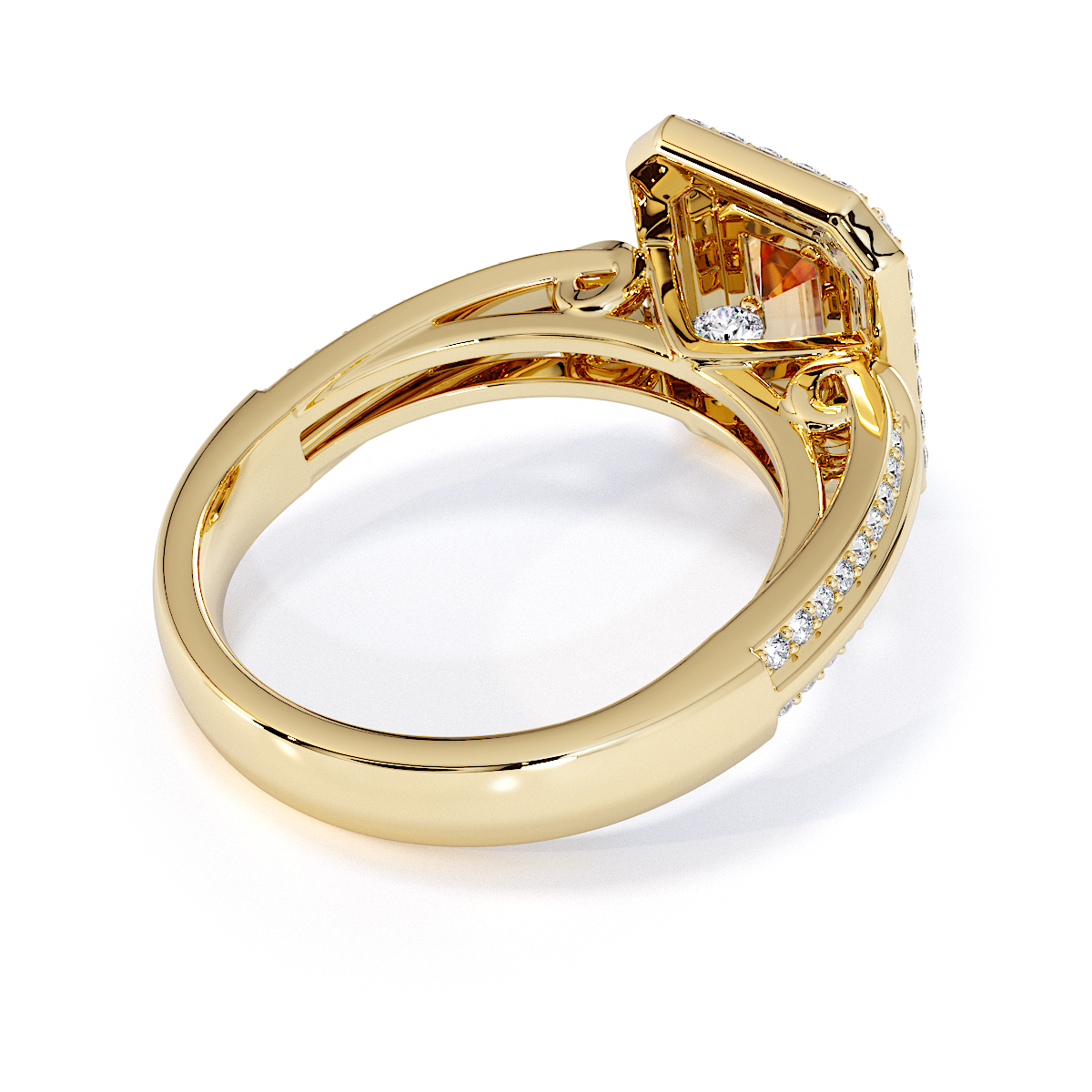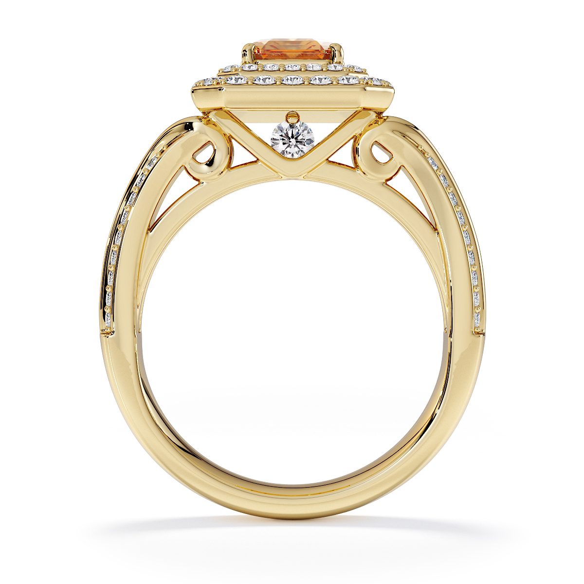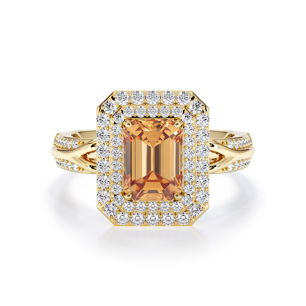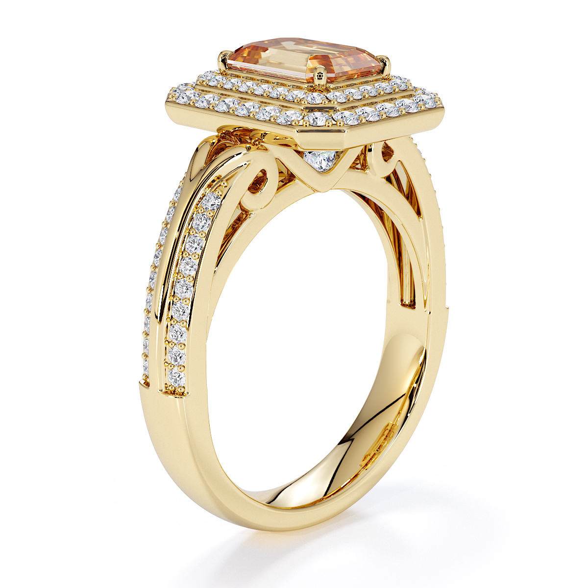 Introducing our stunning Emerald Cut Citrine and Diamond Engagement Ring , surrounded by a double halo of diamonds and prong-set stones.