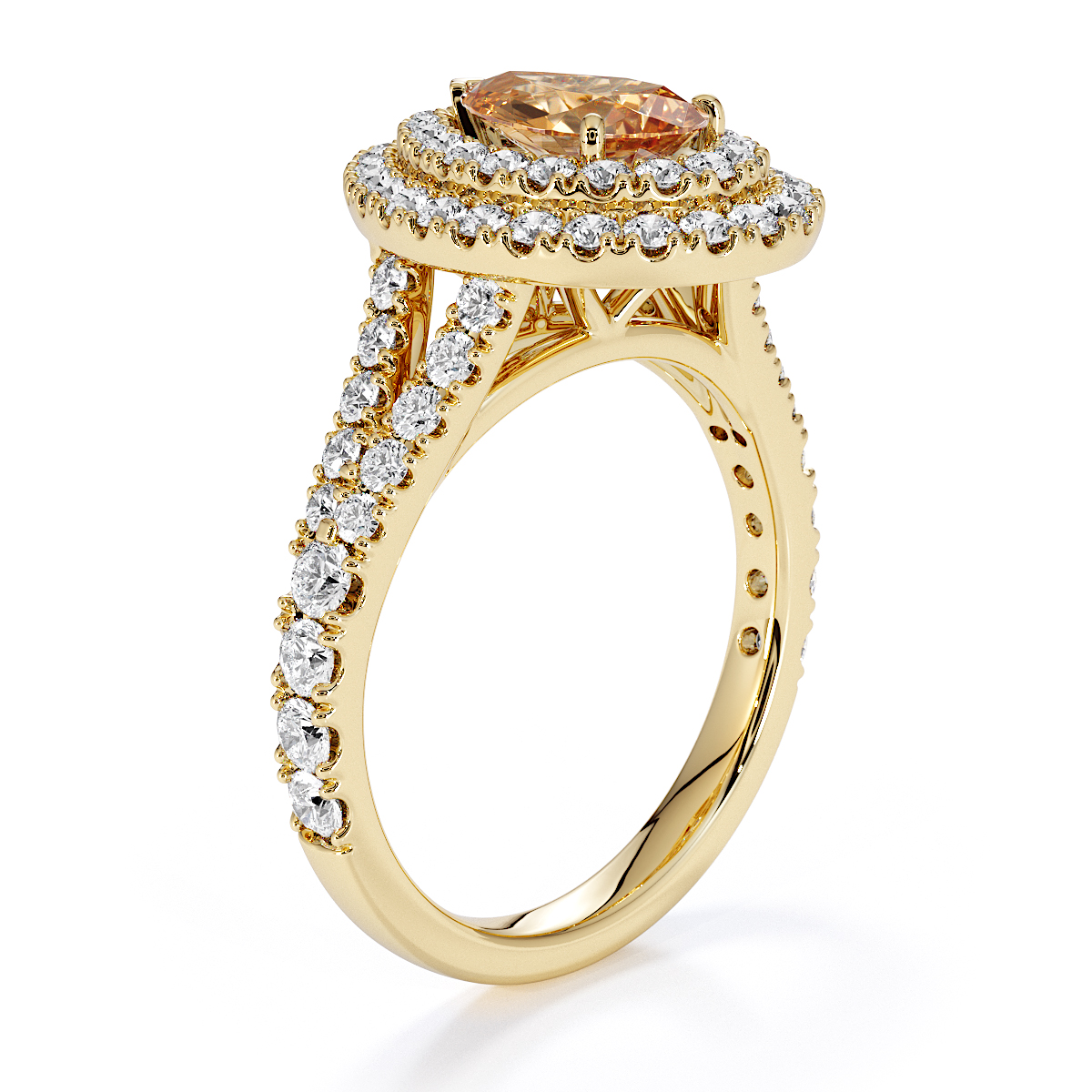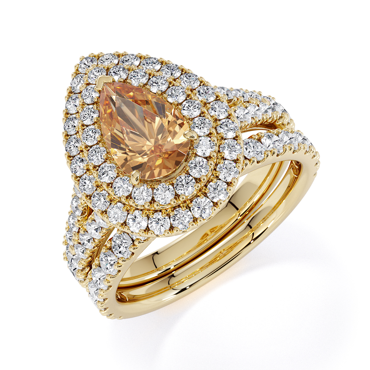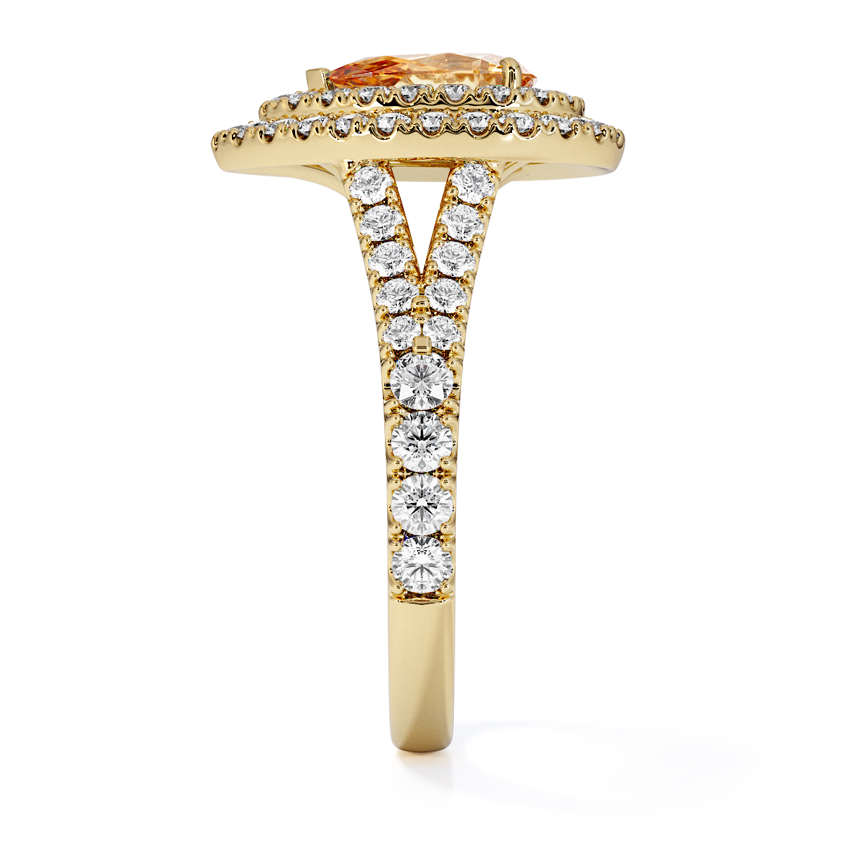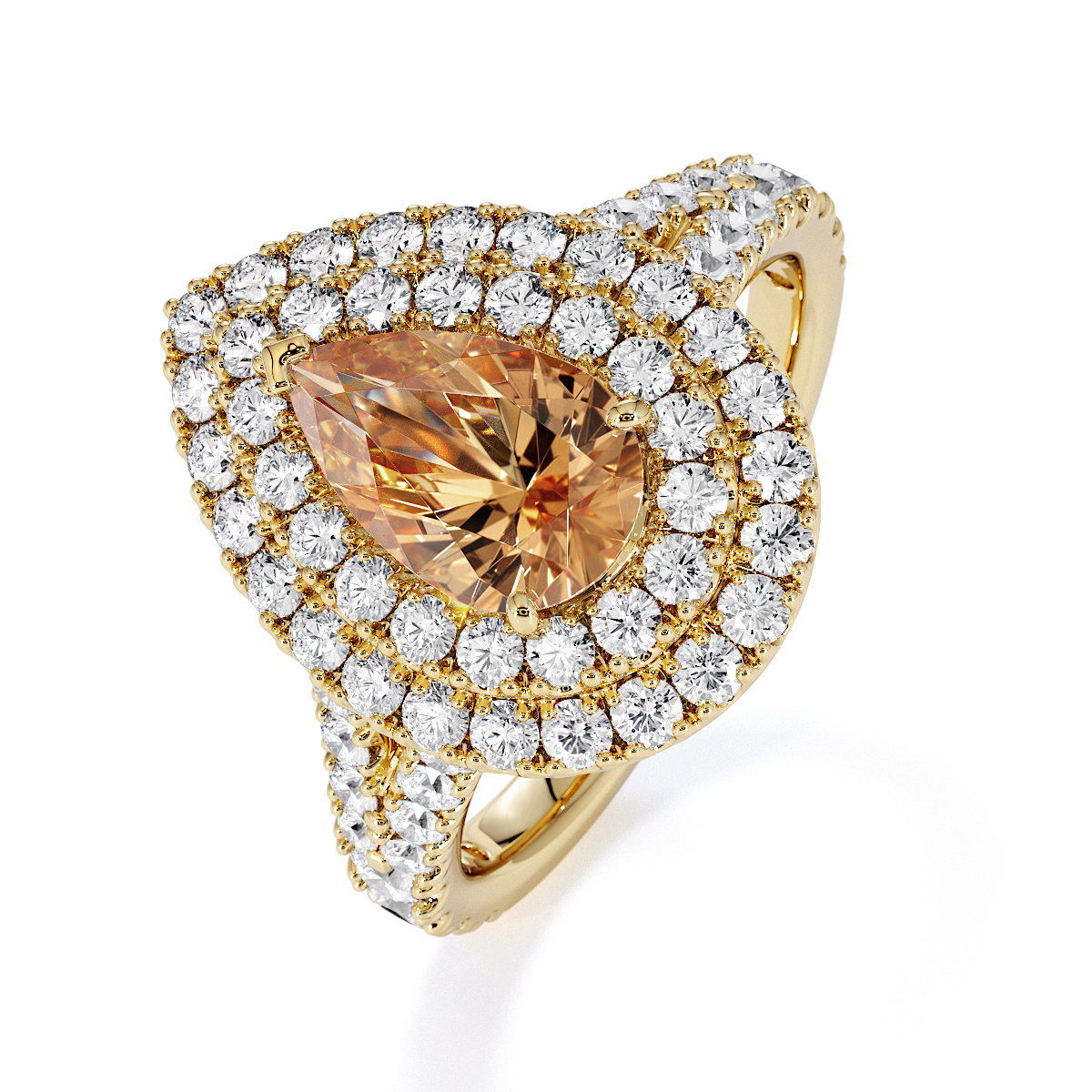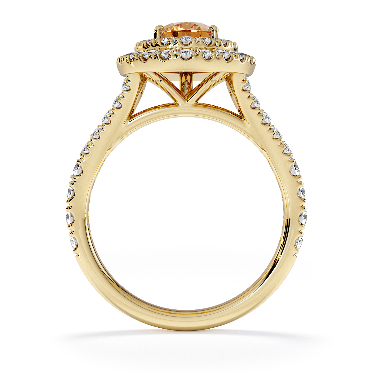 Featuring a gorgeous pear-shaped Citrine and Diamond Engagement Ring surrounded by a double halo of round brilliant stones, the ring is further adorned with prong-set diamonds running up the split shank shoulders. This engagement ring beautifully complements the wedding ring of your choice.