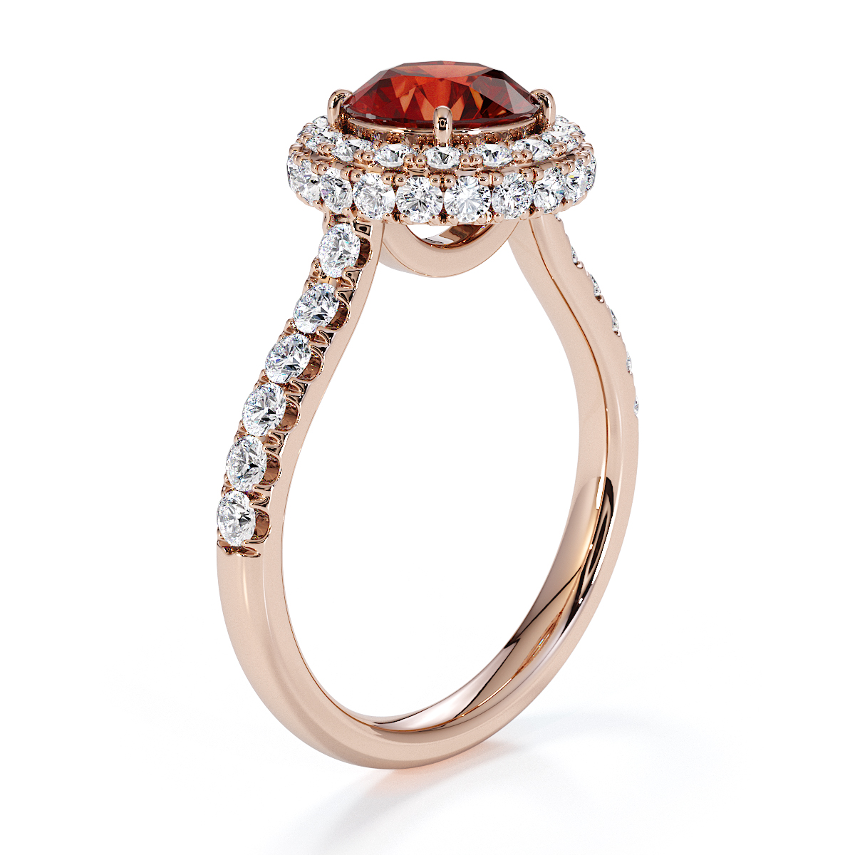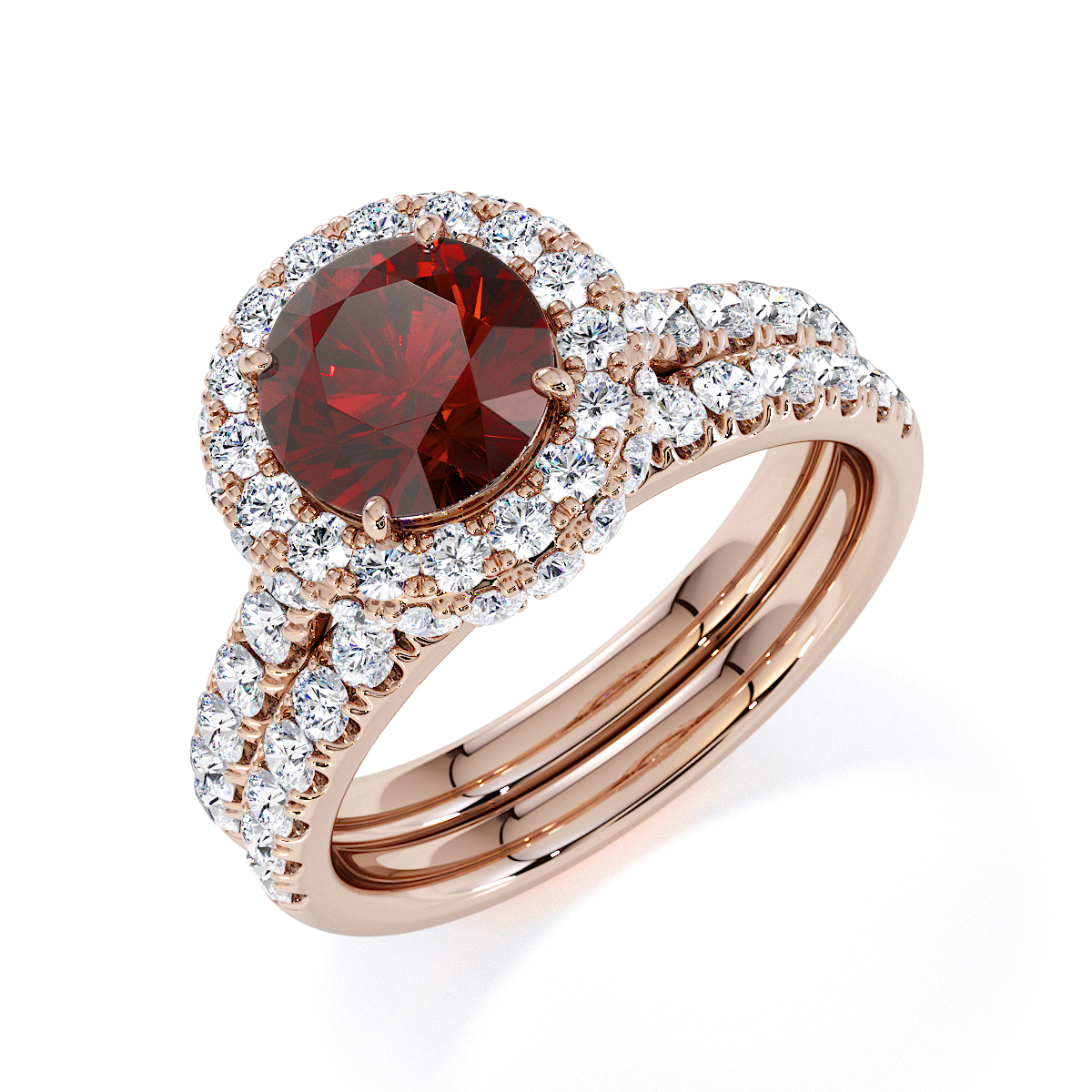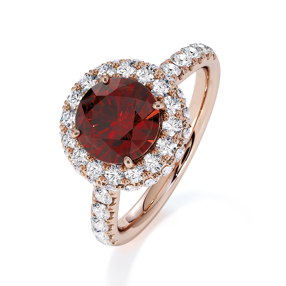 Experience timeless elegance with our exquisite Round Cut Garnet and Diamond Engagement Ring, featuring a halo of diamonds and prong-set stones. A perfect symbol of everlasting love and sophistication.