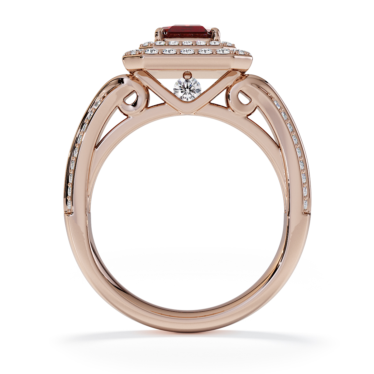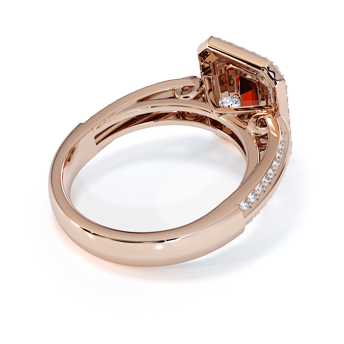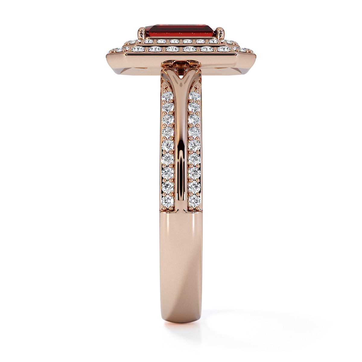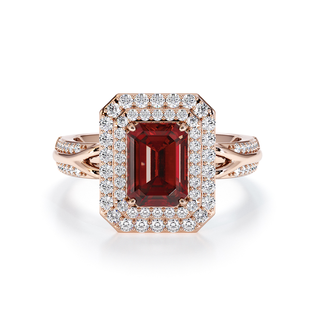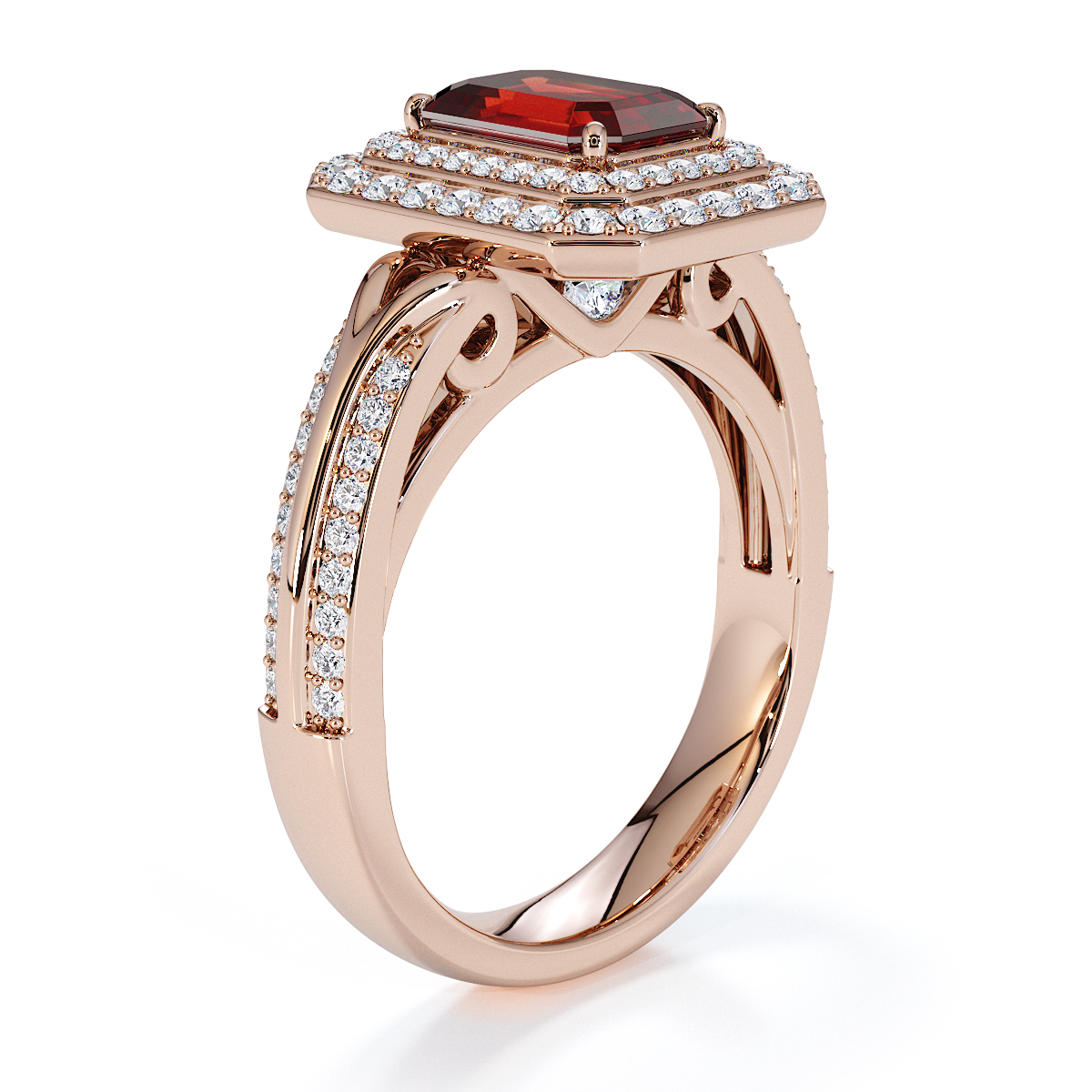 Introducing our stunning Emerald Cut Garnet and Diamond Engagement Ring , surrounded by a double halo of diamonds and prong-set stones.