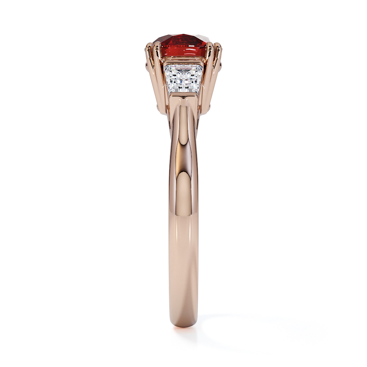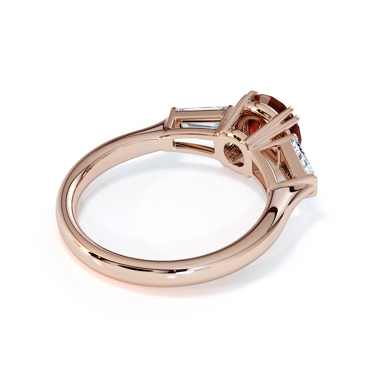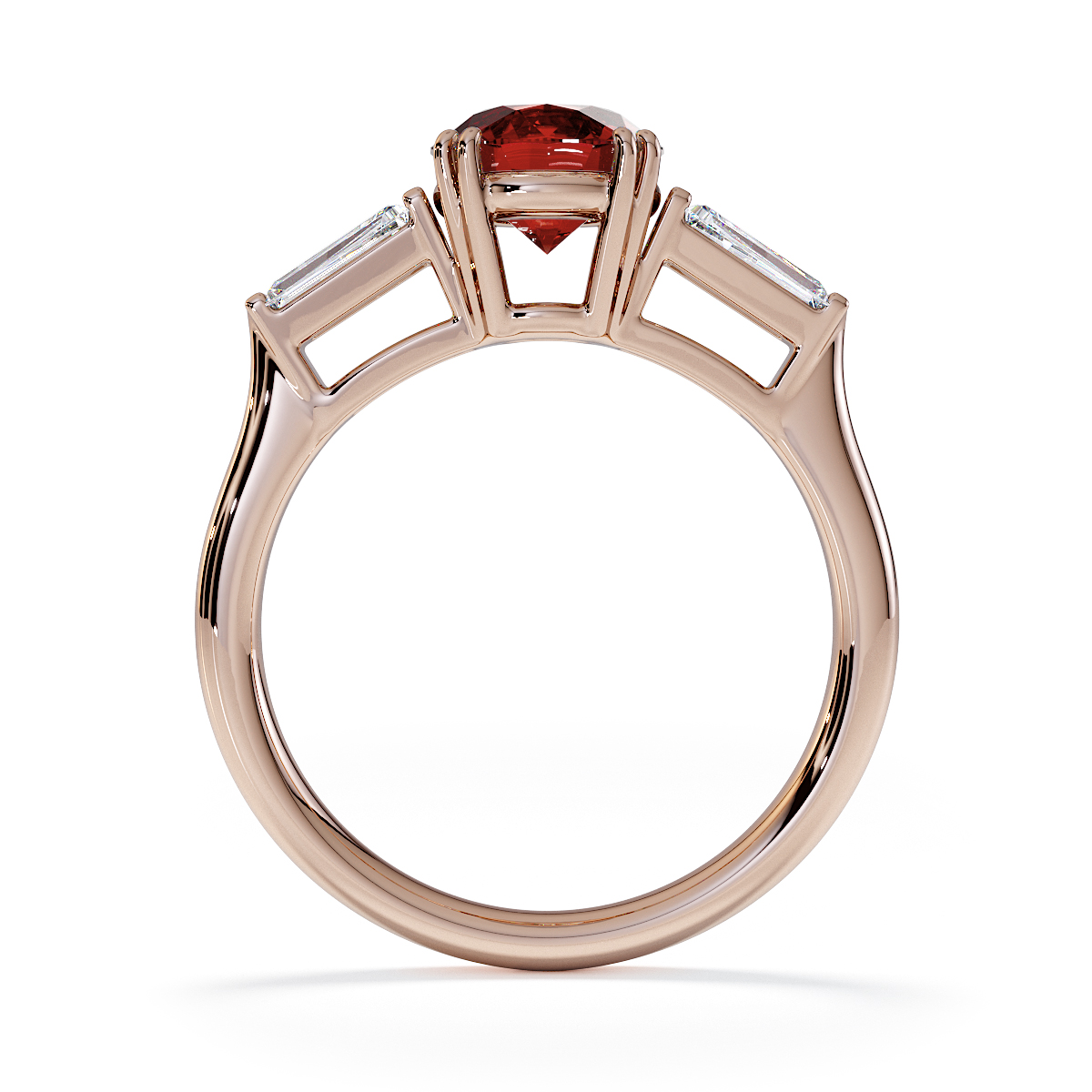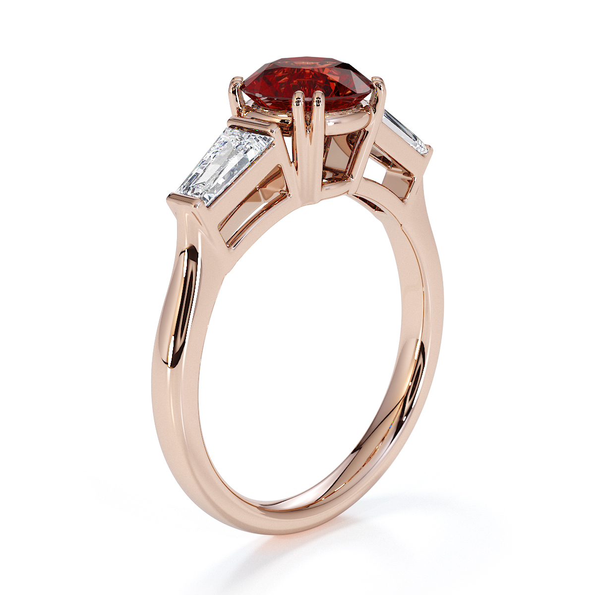 Introducing our exquisite round cut Garnet and Diamond Engagement Ring, adorned with tapered baguette side stones delicately prong-set.