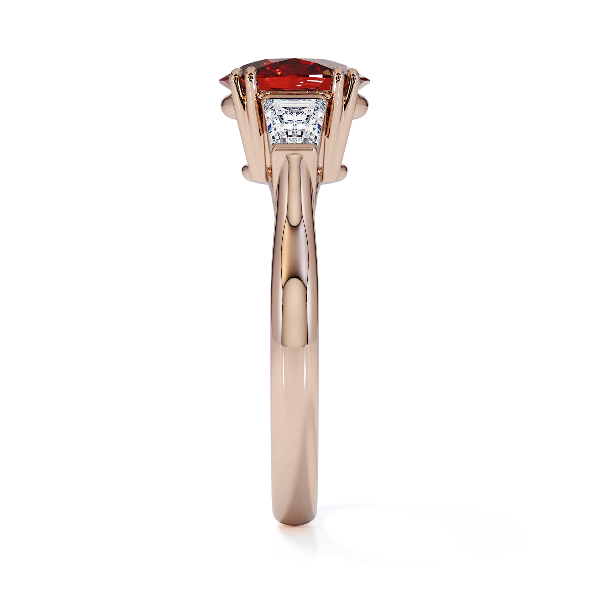 Introducing our exquisite oval-cut Garnet and Diamond Engagement Ring, featuring elegant side-tapered baguette diamonds intricately prong-set.
