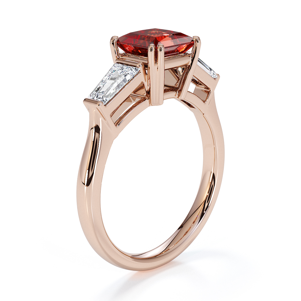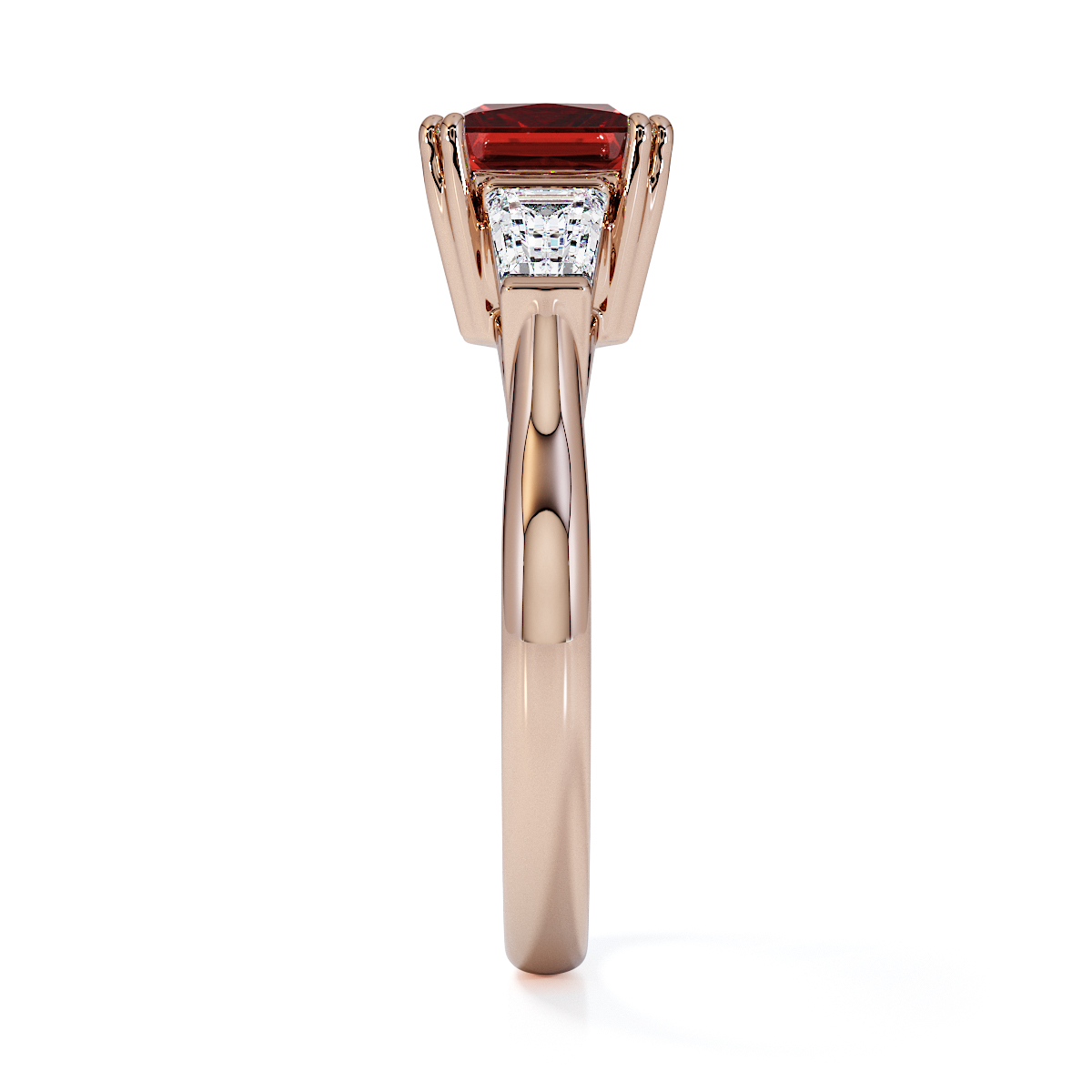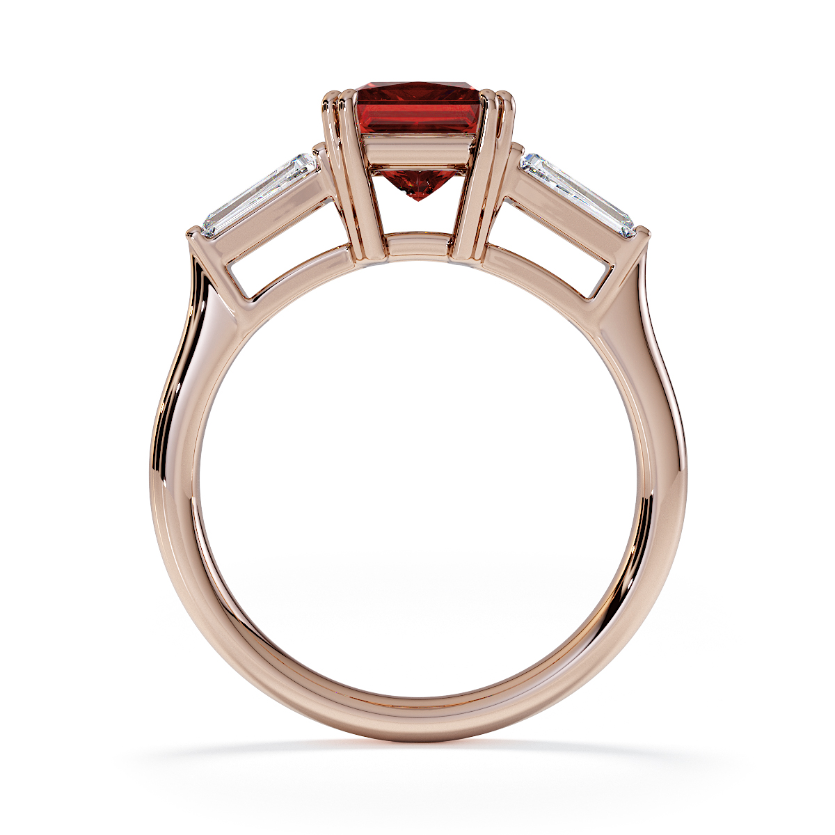 Introducing our exquisite Princess Cut Garnet and Diamond Engagement Ring, featuring elegant side-tapered baguette diamonds intricately prong-set.