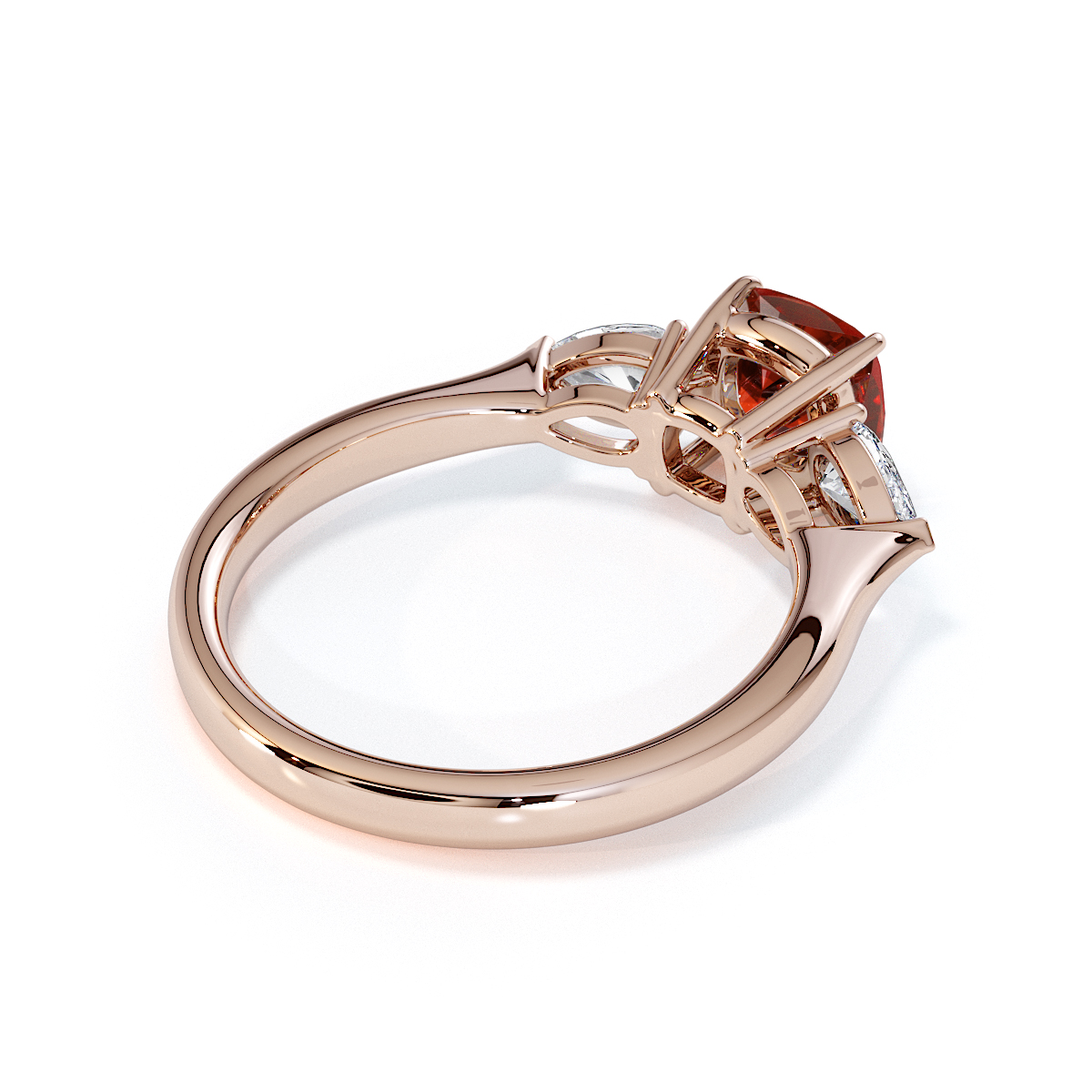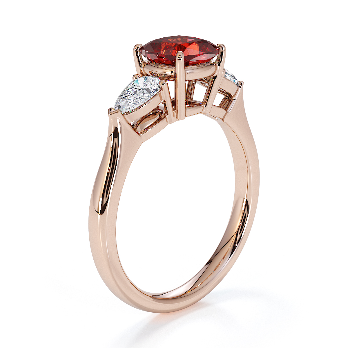 We are presenting our enchanting Cushion Cut Garnet and Diamond Engagement Ring, adorned with two stunning pear-shaped diamonds on either side, intricately set with prongs.