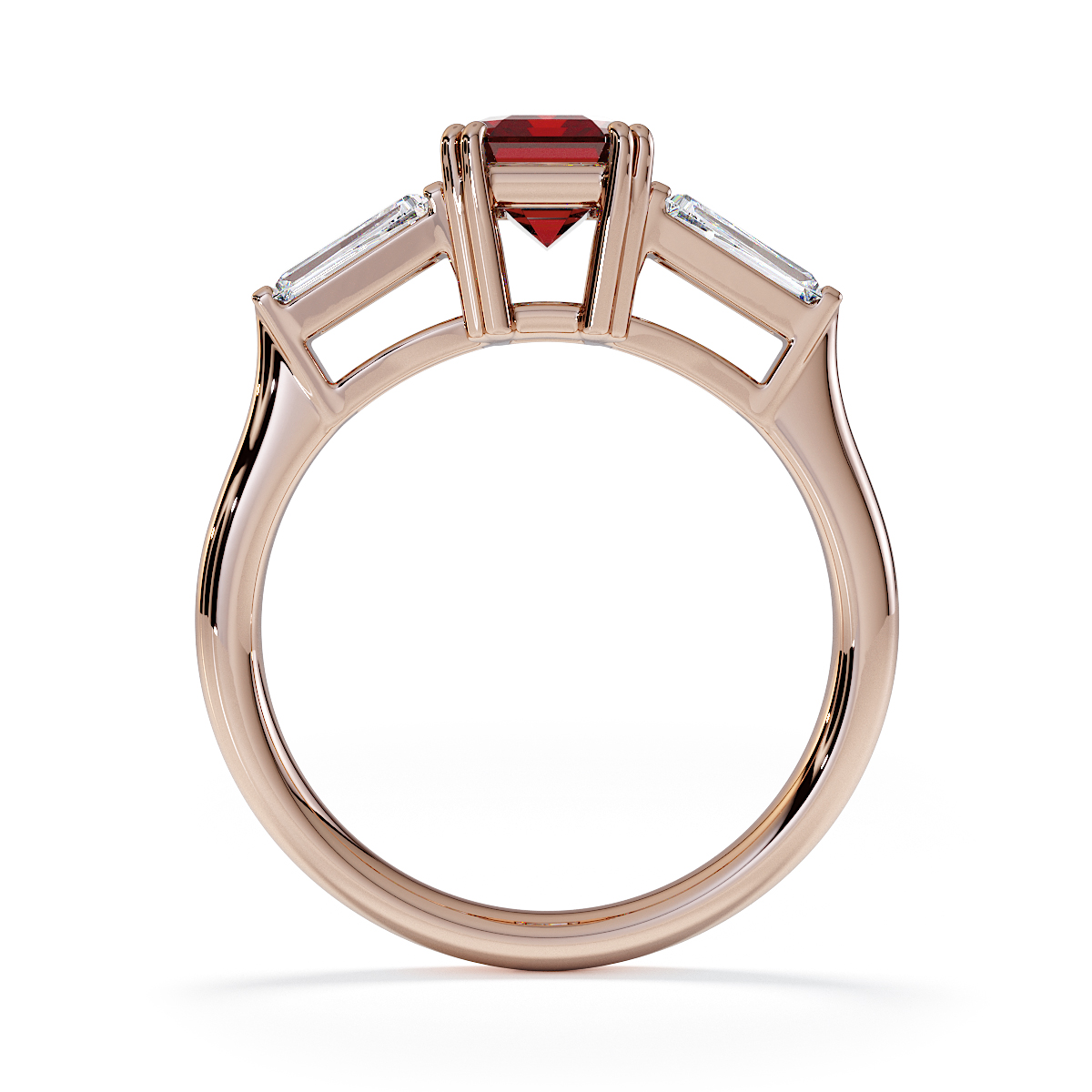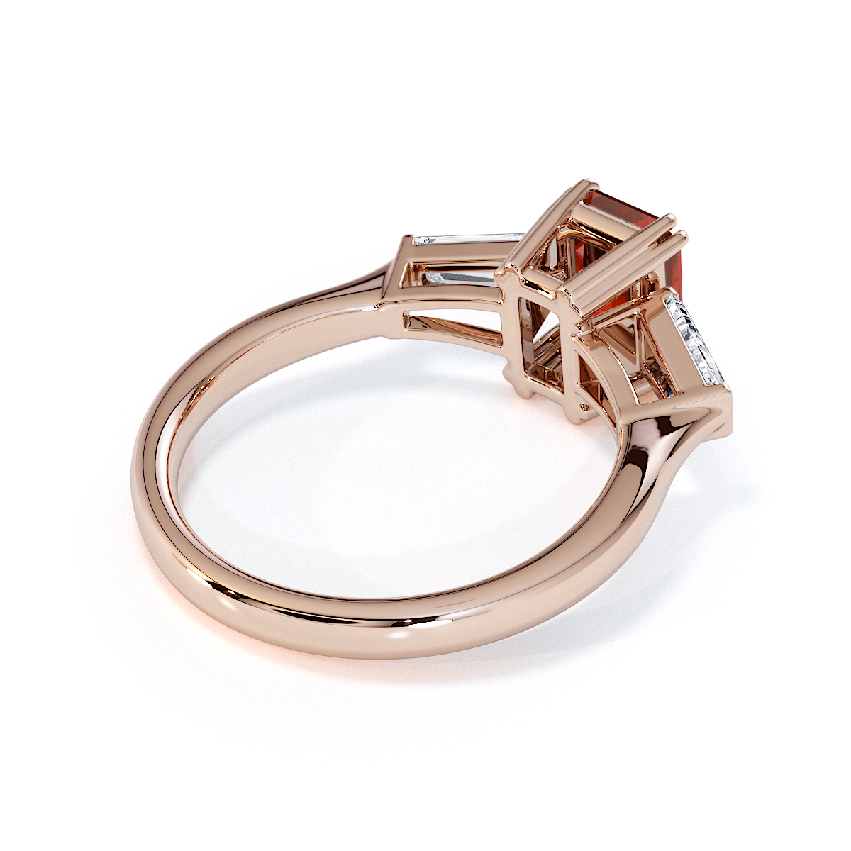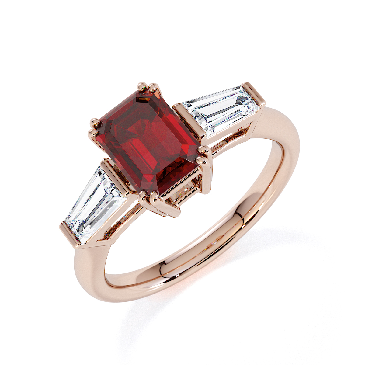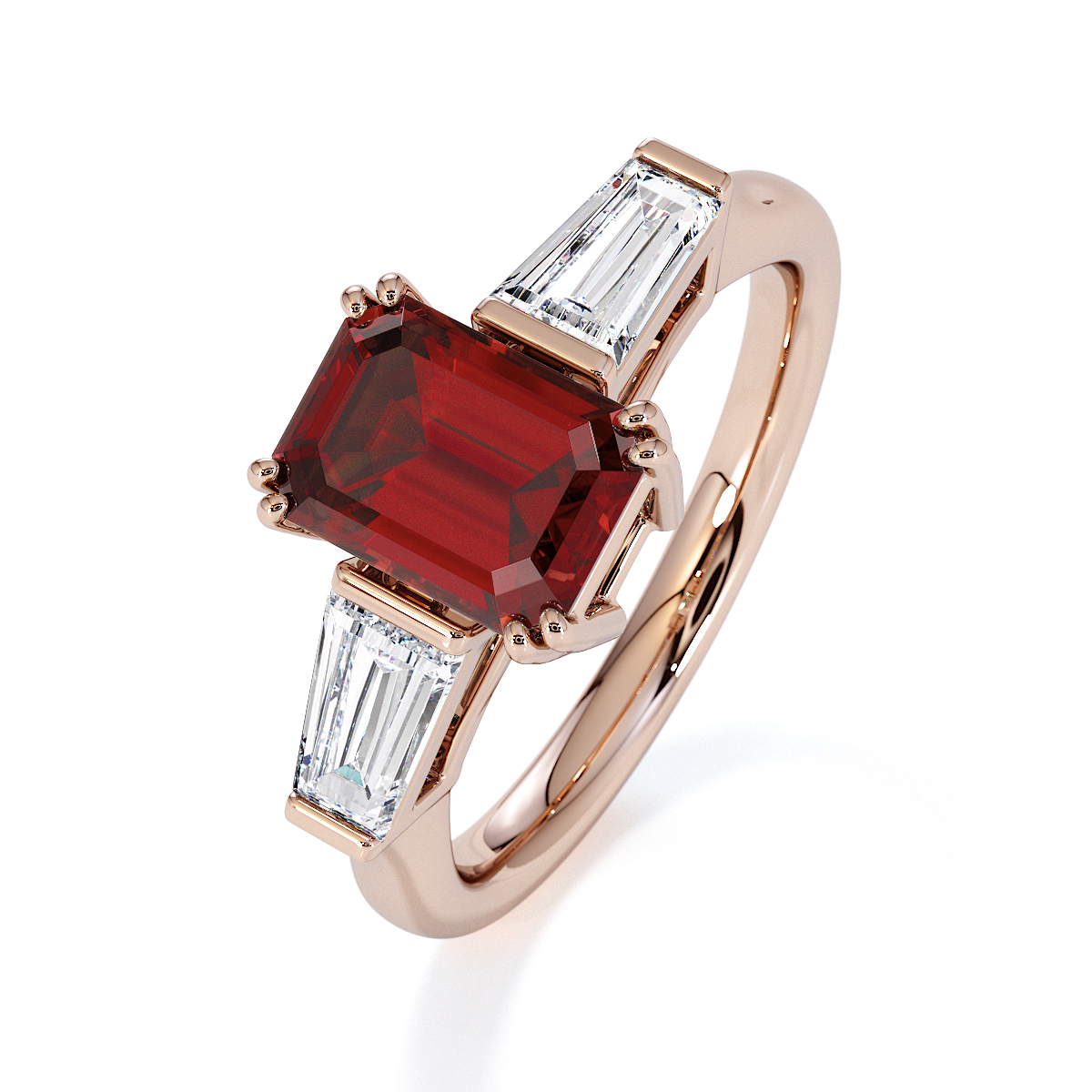 Introducing our exquisite Emerald-Cut Garnet and Diamond Engagement Ring, featuring elegant side-tapered baguette diamonds intricately prong-set.