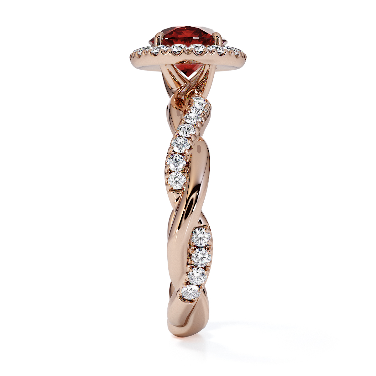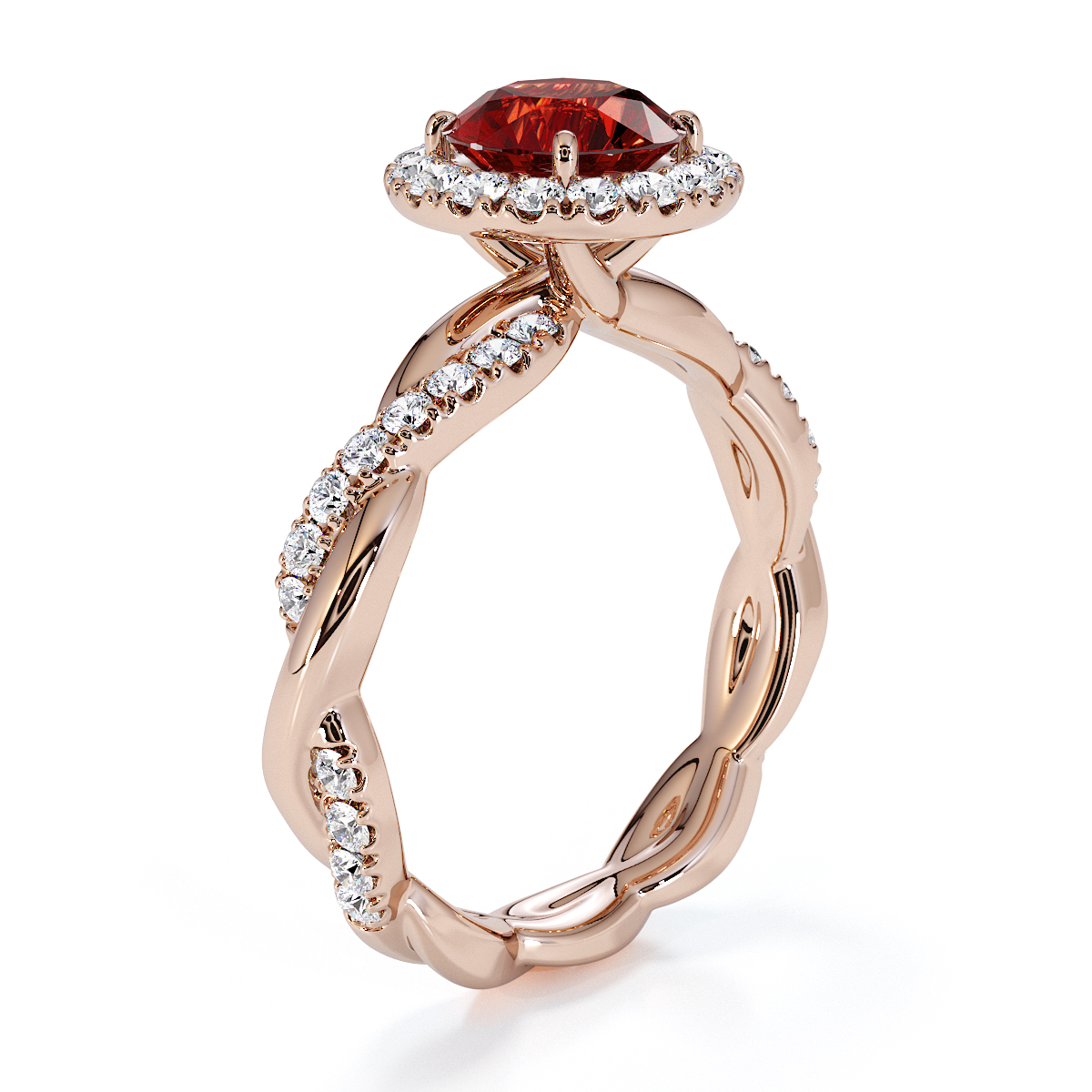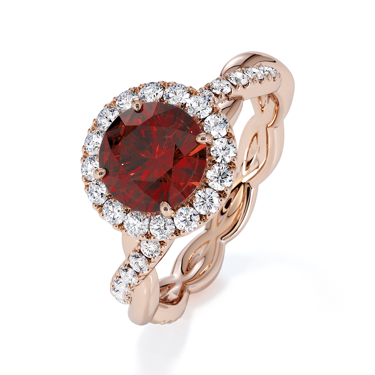 Presenting our stunning round cut Garnet and Diamond Engagement Ring. The ring is further adorned with a halo and prong-set diamonds running up the twisted shoulders. It perfectly complements the wedding ring of your choice.