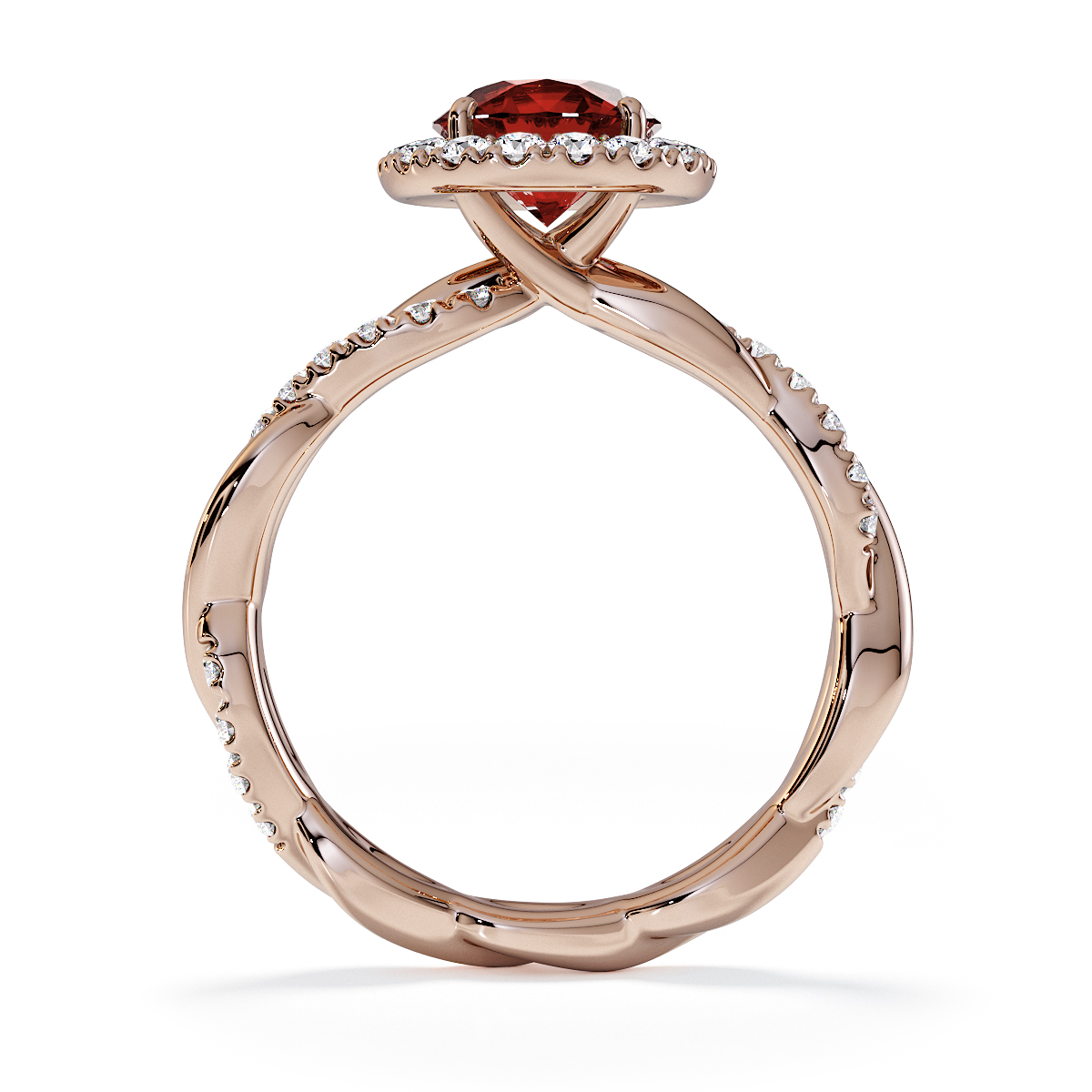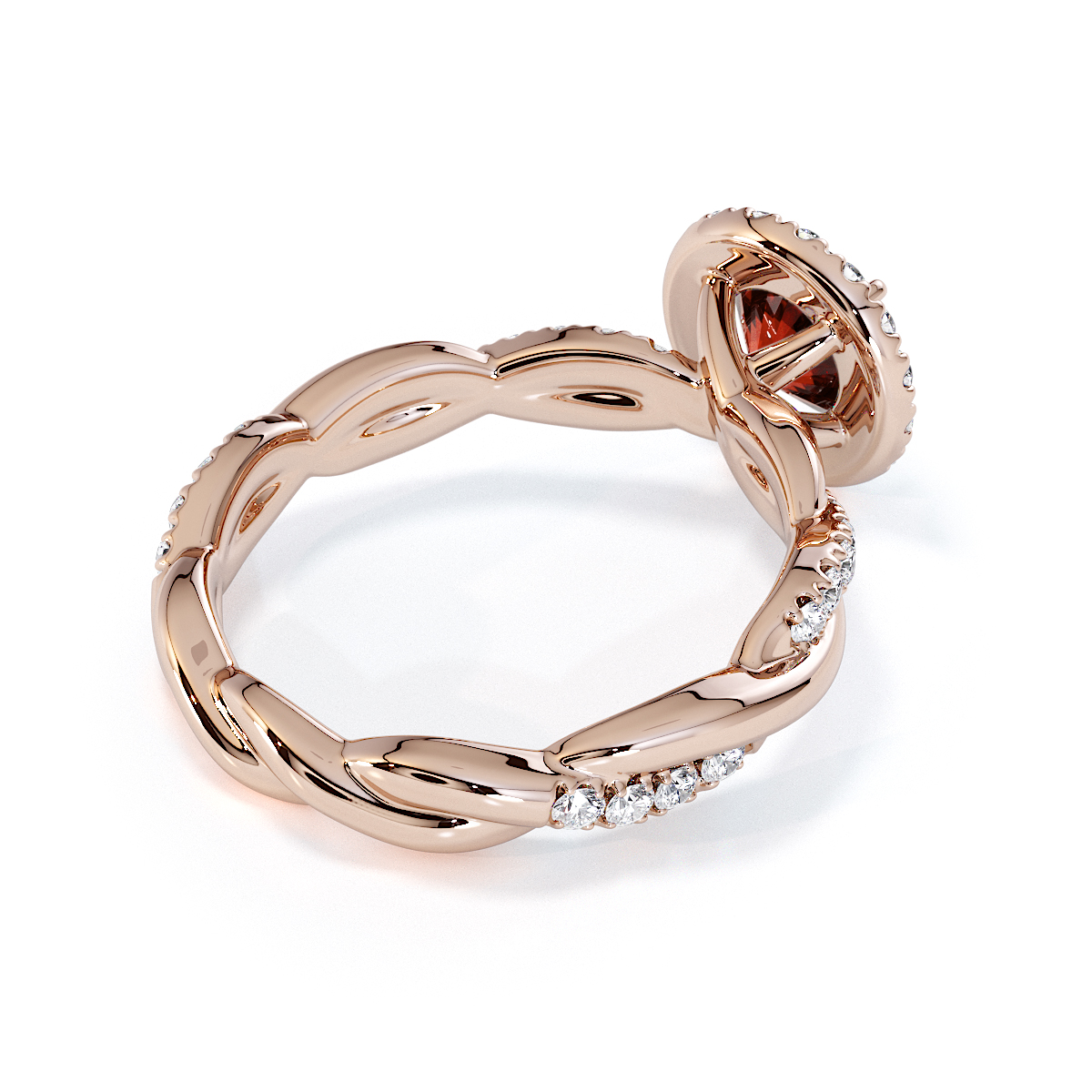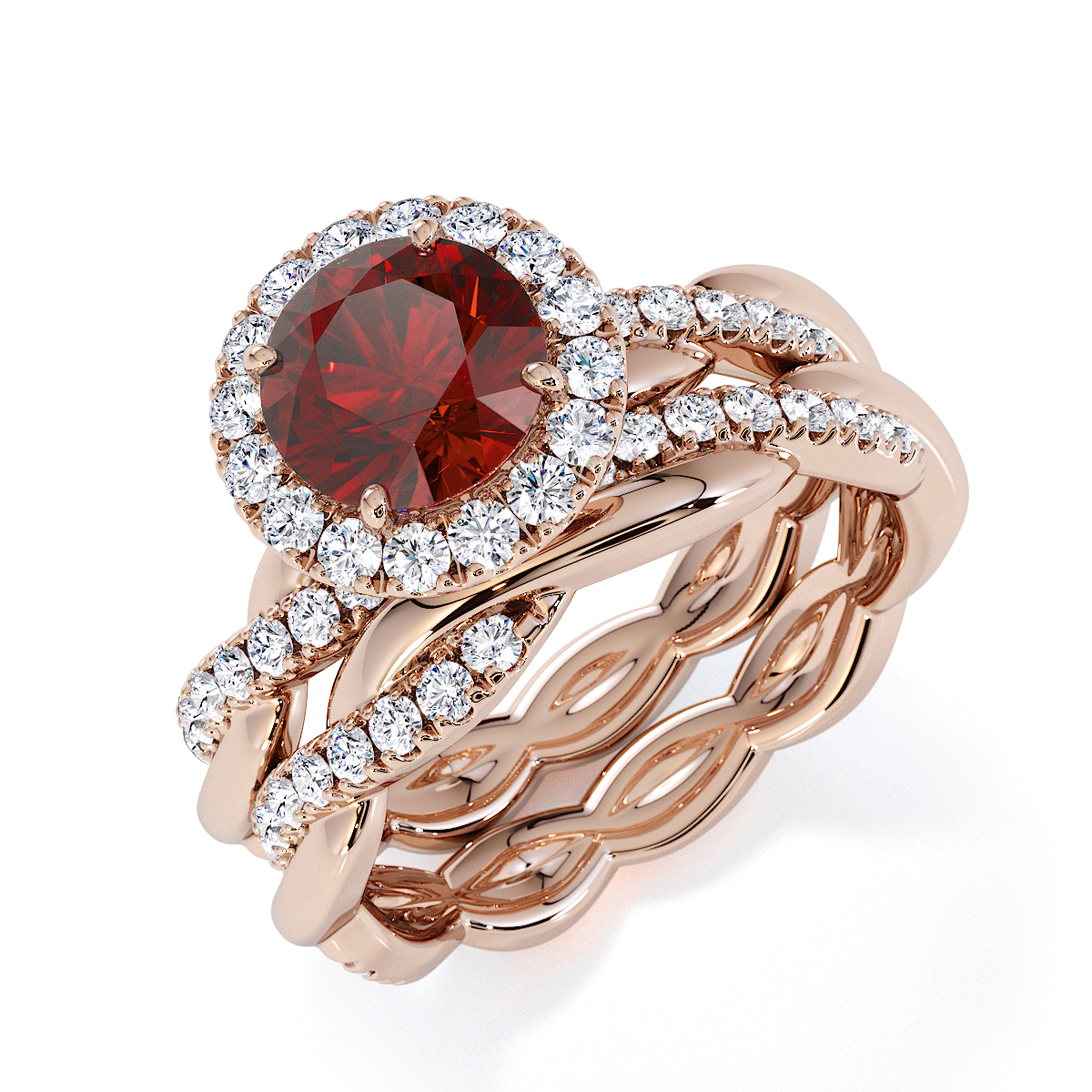 Presenting our stunning round cut Garnet and Diamond Engagement Ring. The ring is further adorned with a halo and prong-set diamonds running up the twisted shoulders. It perfectly complements the wedding ring of your choice.