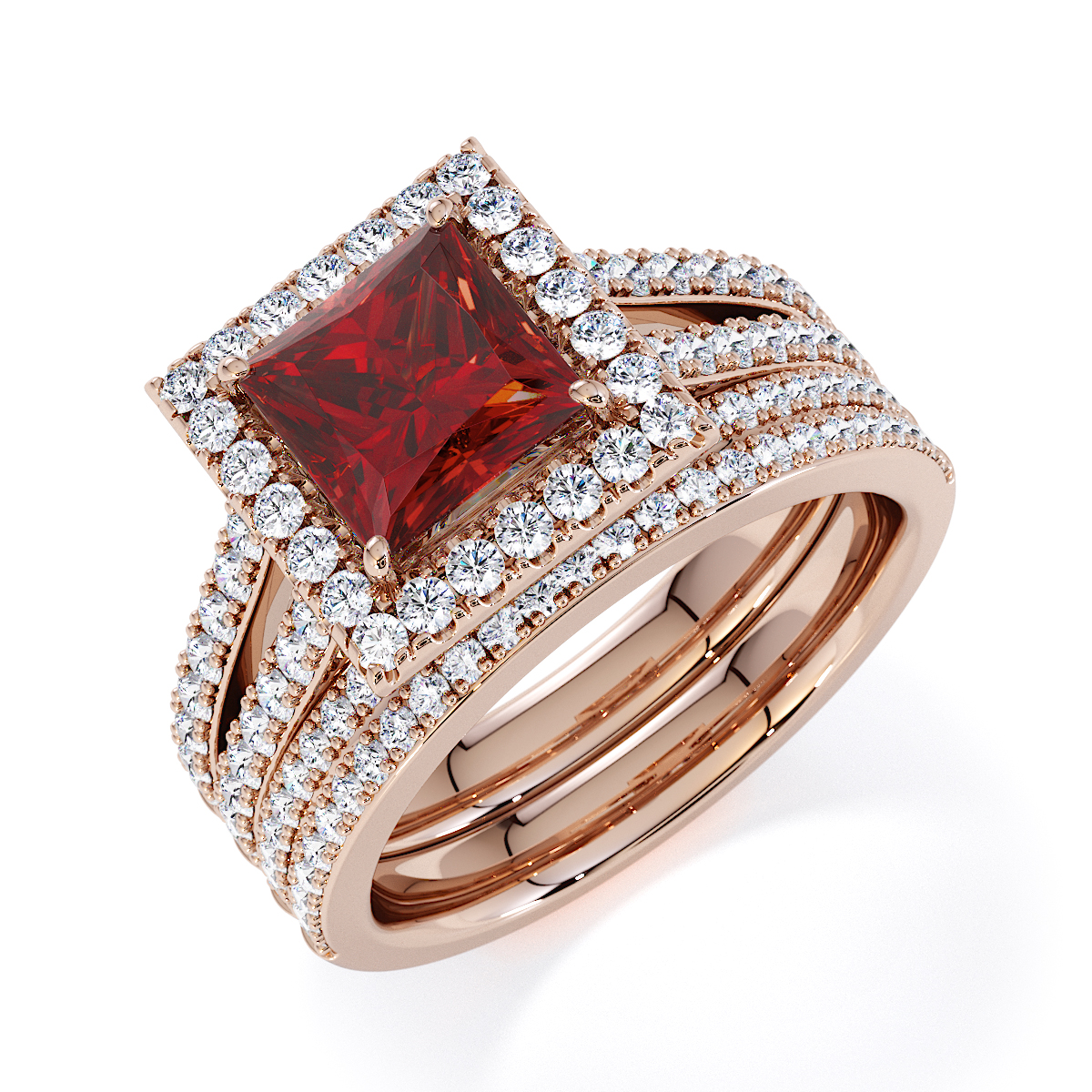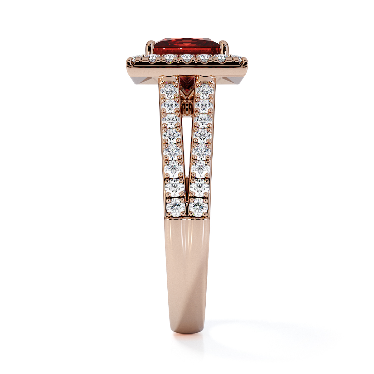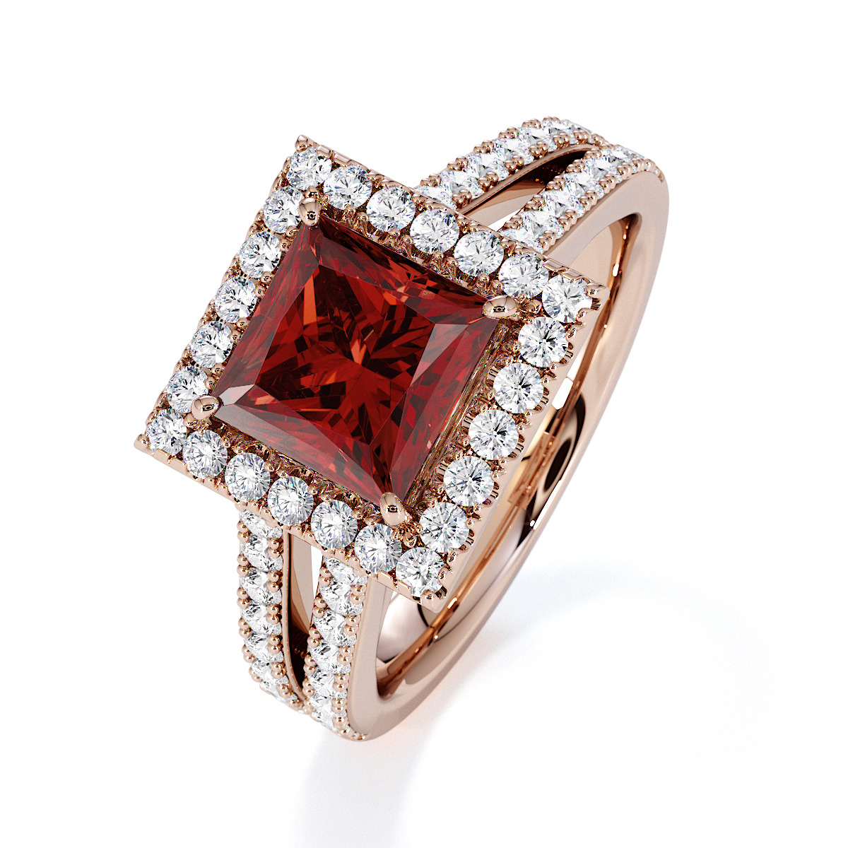 Featuring a gorgeous princess-cut Garnet and Diamond Engagement Ring surrounded by a halo of round brilliant stones, the ring is further adorned with prong-set diamonds running up the split shank shoulders. This engagement ring beautifully complements the wedding ring of your choice.