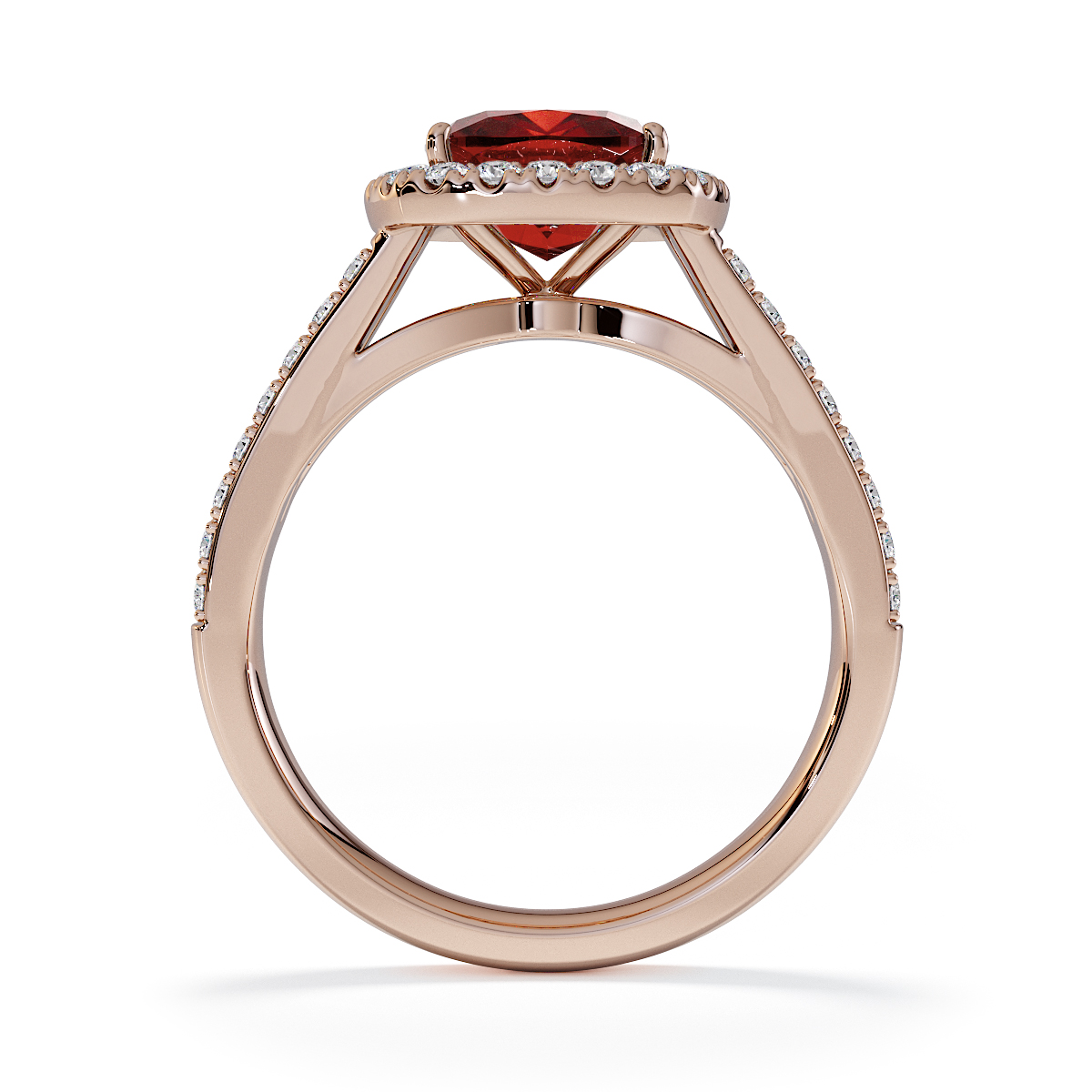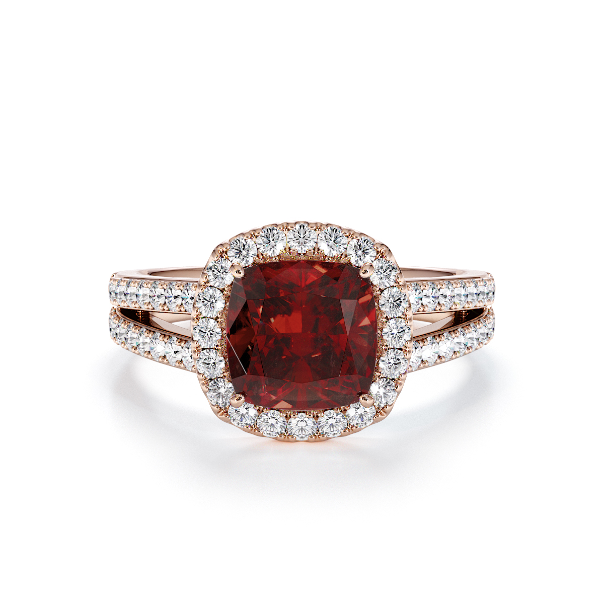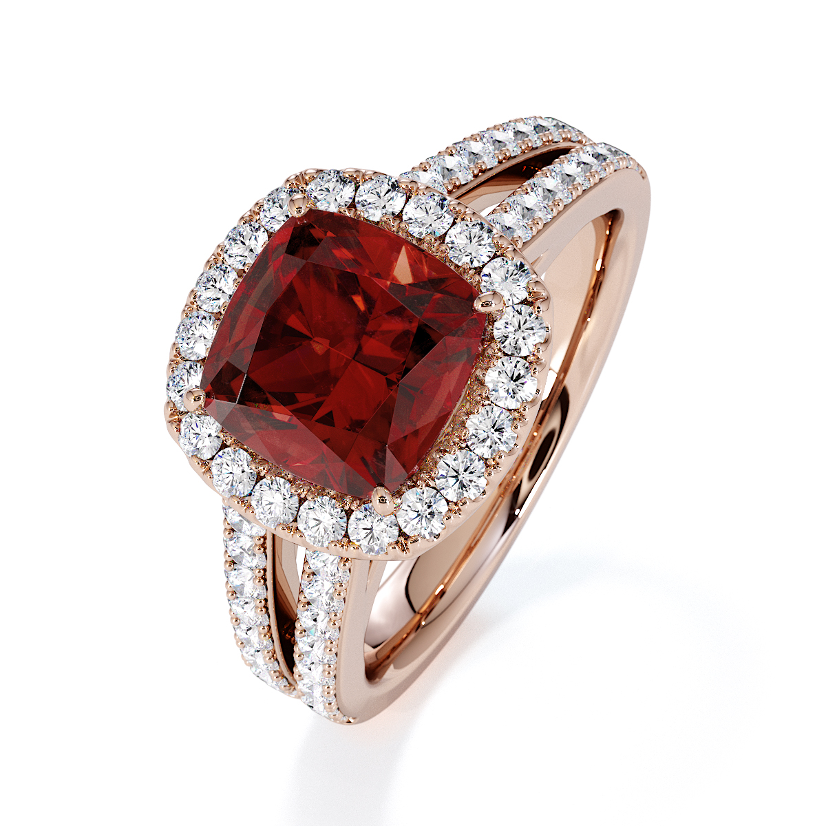 Introducing our mesmerizing Cushion Cut Garnet and Diamond Engagement Ring, boasting a breathtaking halo and split shank design.