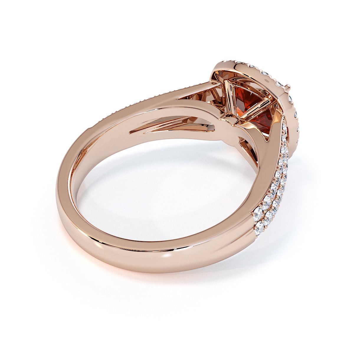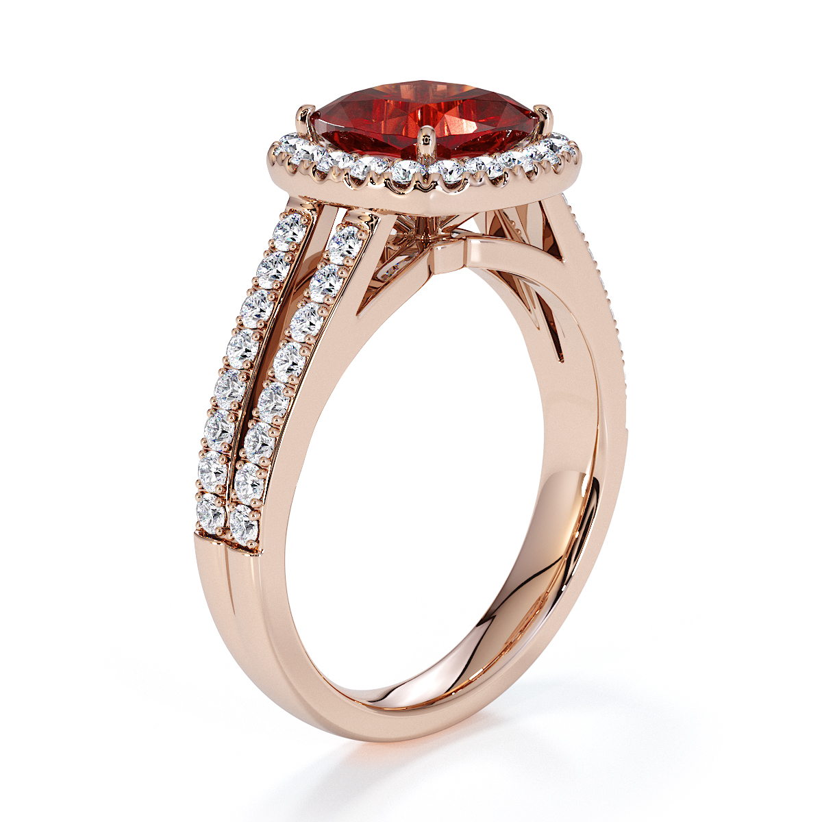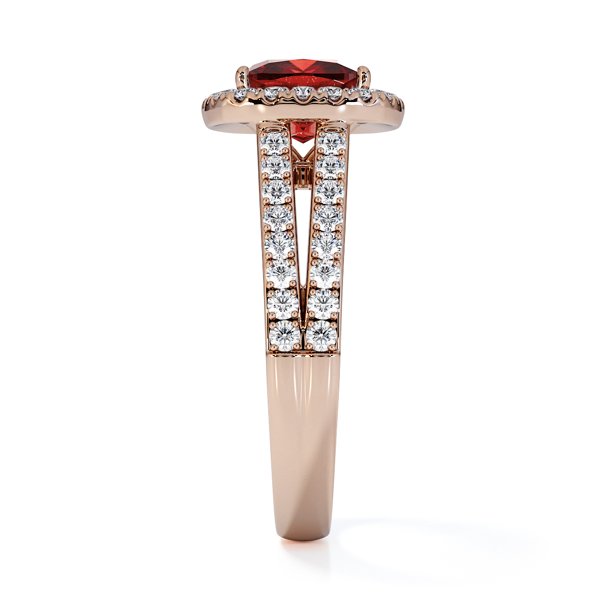 Introducing our mesmerizing Cushion Cut Garnet and Diamond Engagement Ring, boasting a breathtaking halo and split shank design.
