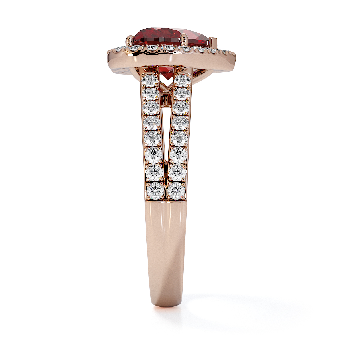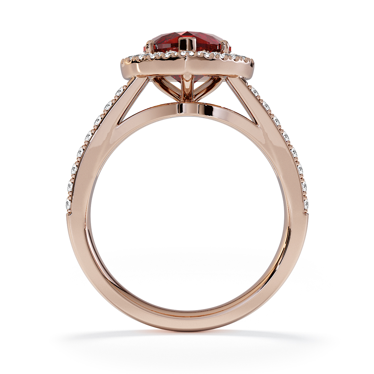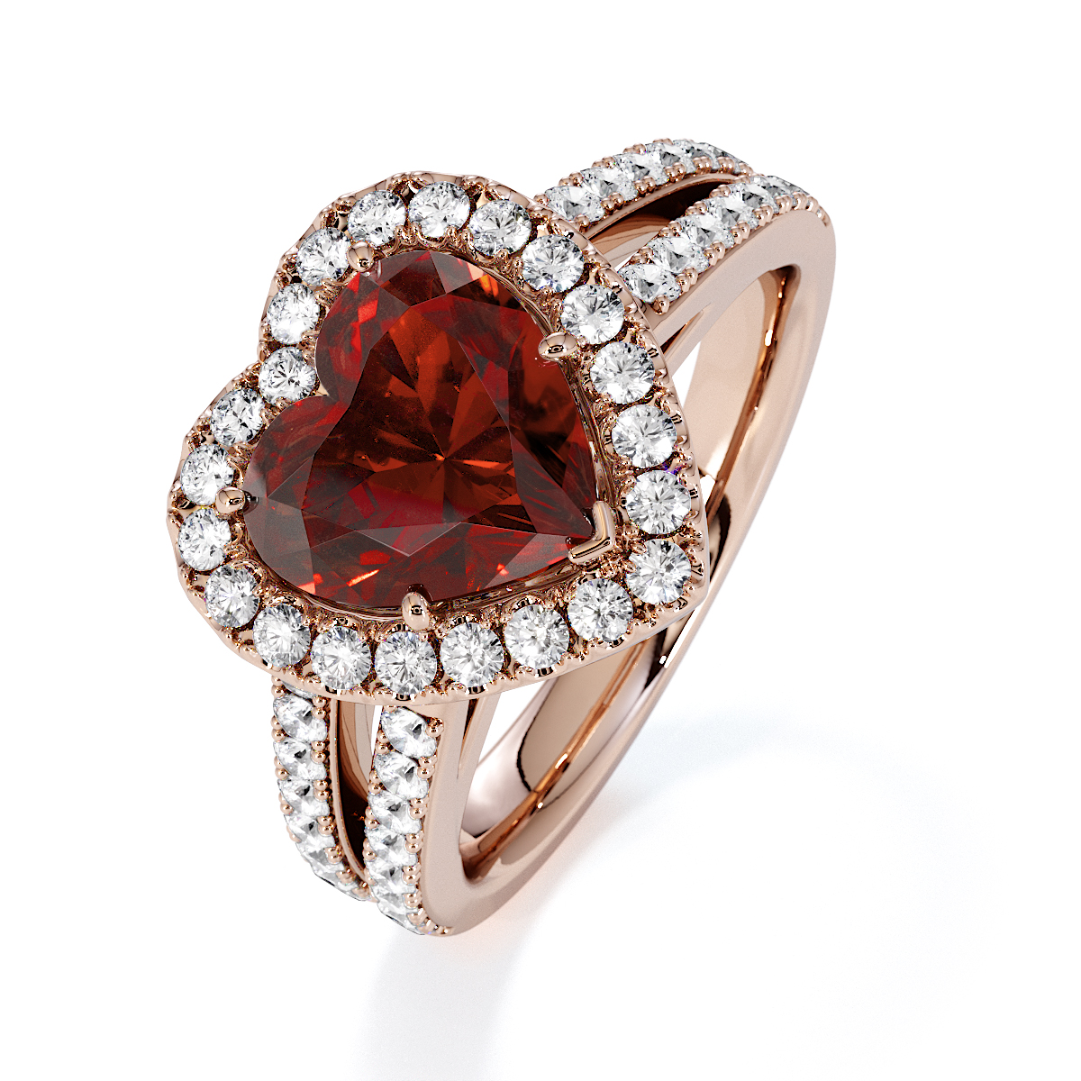 We are presenting our stunning Heart cut Garnet and Diamond Engagement Ring, featuring a sparkling halo of round-cut diamonds delicately set in prongs.