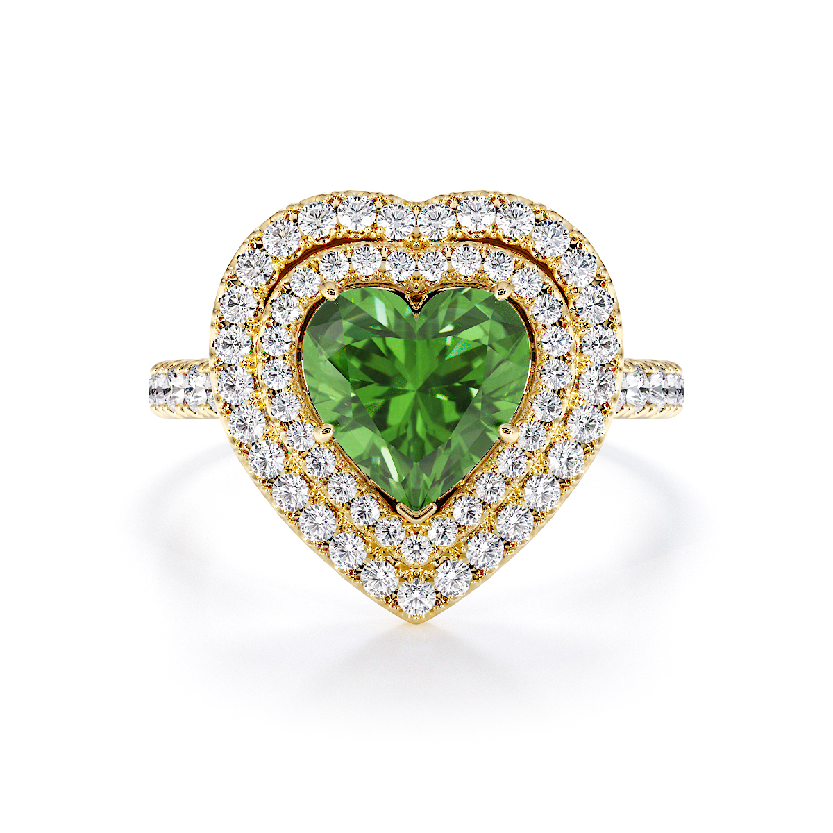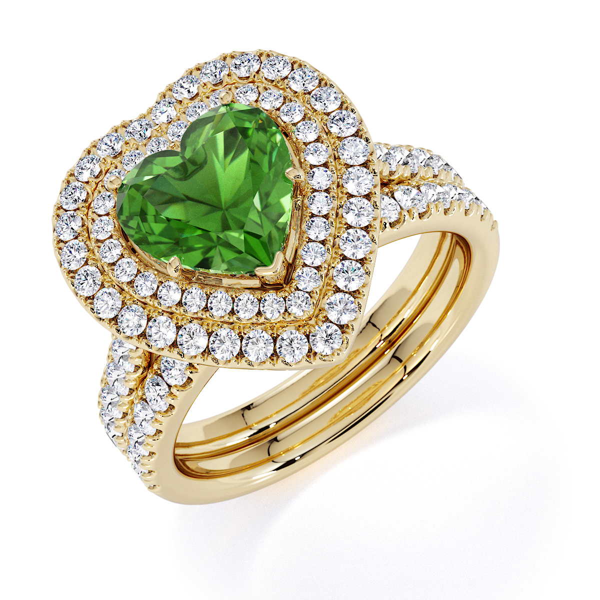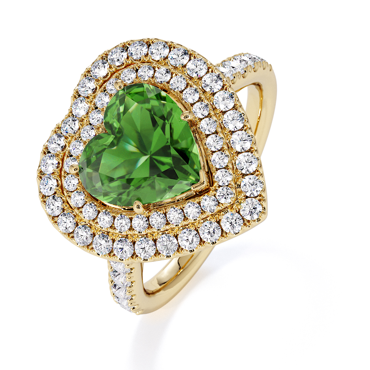 Introducing our dazzling heart-cut Green Tourmaline and Diamond Engagement Ring , featuring a captivating double halo of diamonds set in elegant prongs. It perfectly complements the wedding ring of your choice.