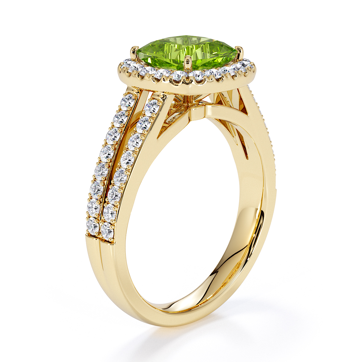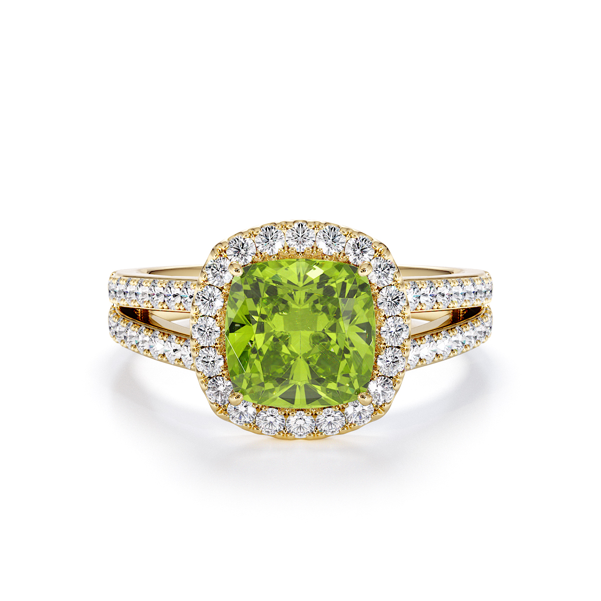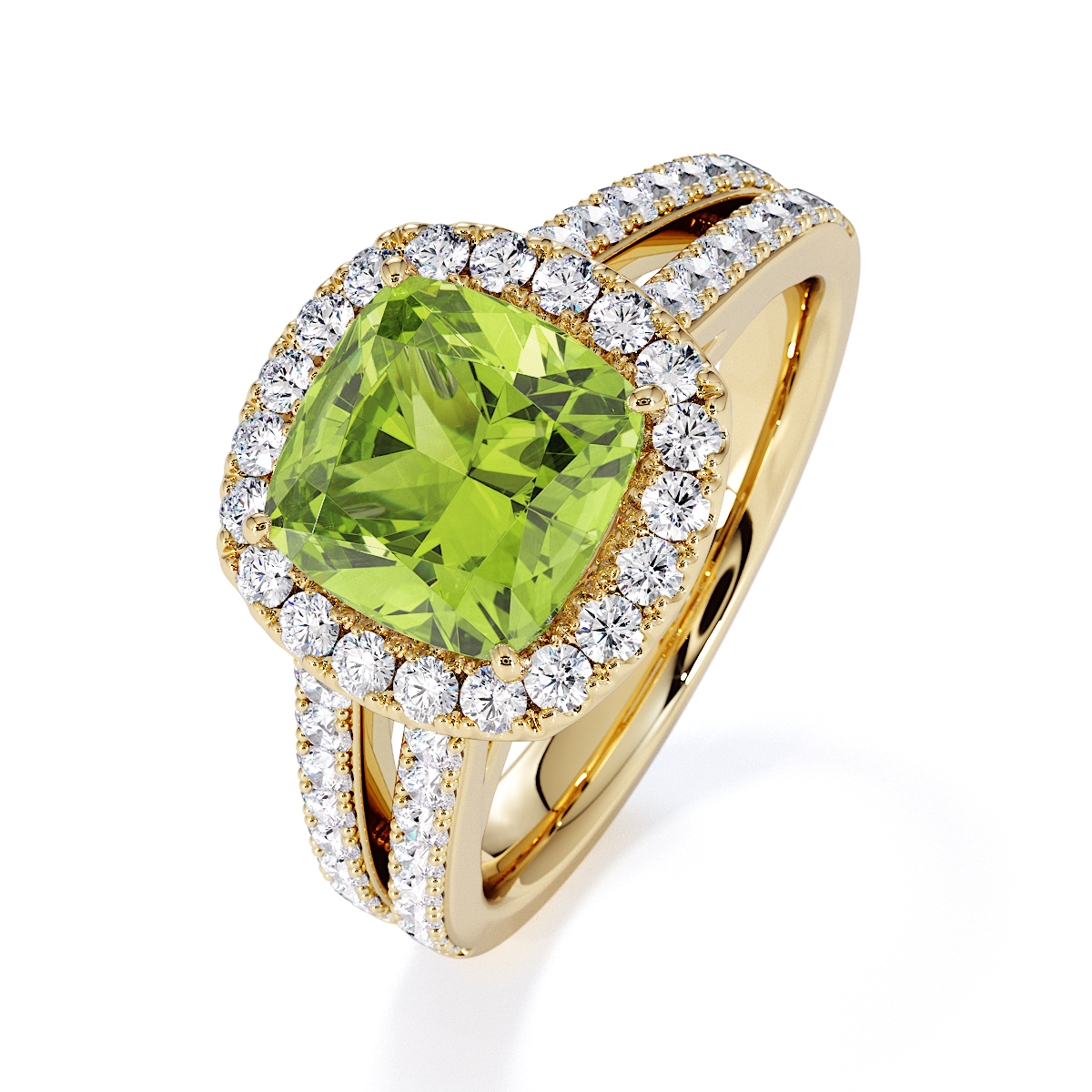 Introducing our mesmerizing Cushion Cut Peridot and Diamond Engagement Ring, boasting a breathtaking halo and split shank design.