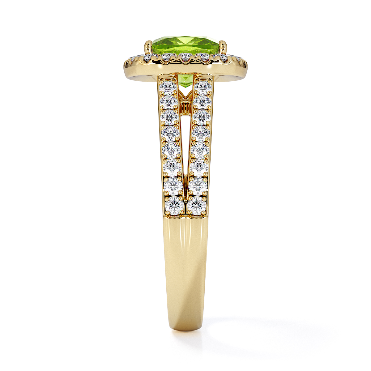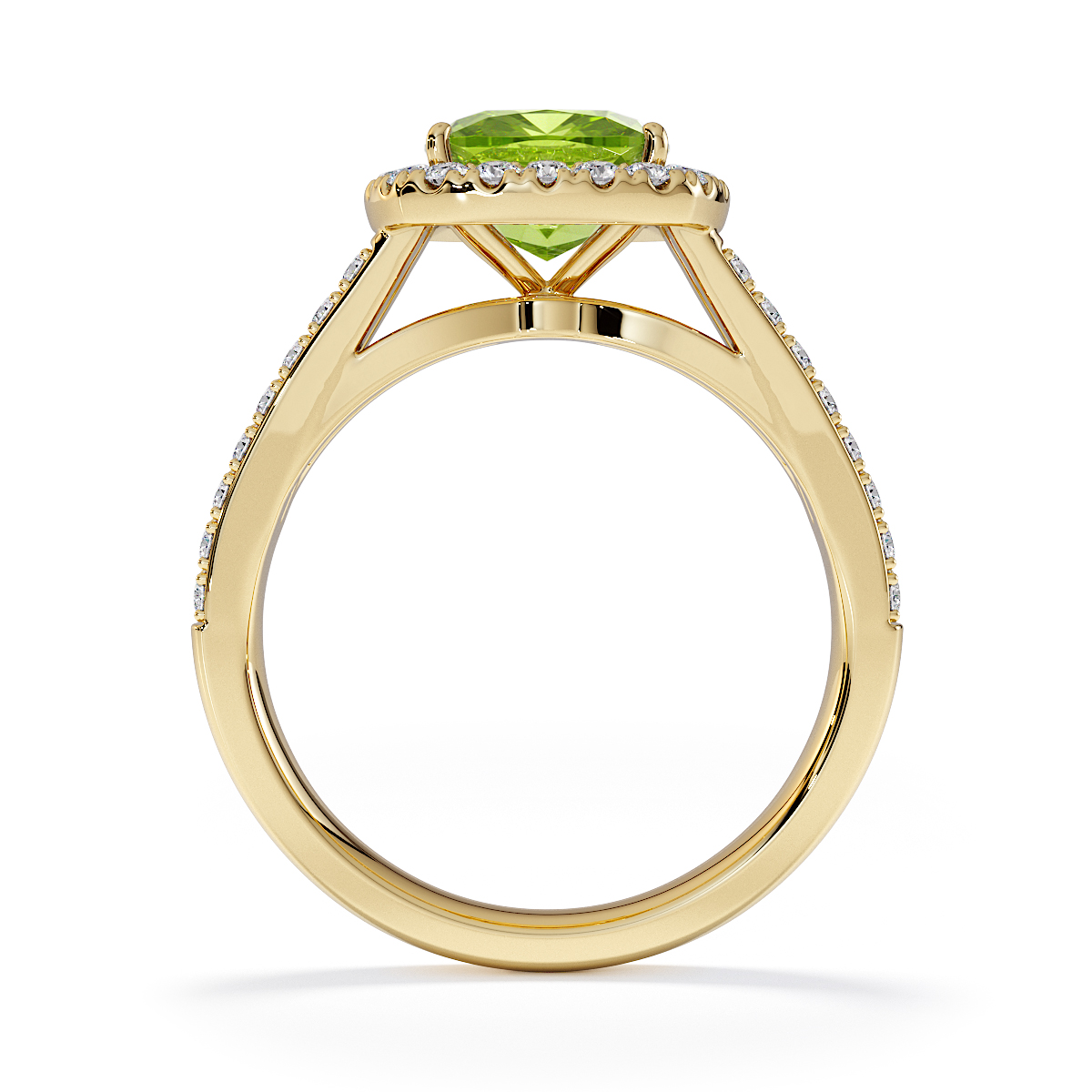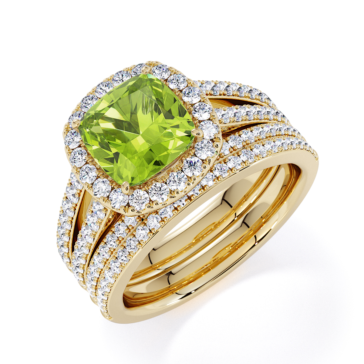 Introducing our mesmerizing Cushion Cut Peridot and Diamond Engagement Ring, boasting a breathtaking halo and split shank design.