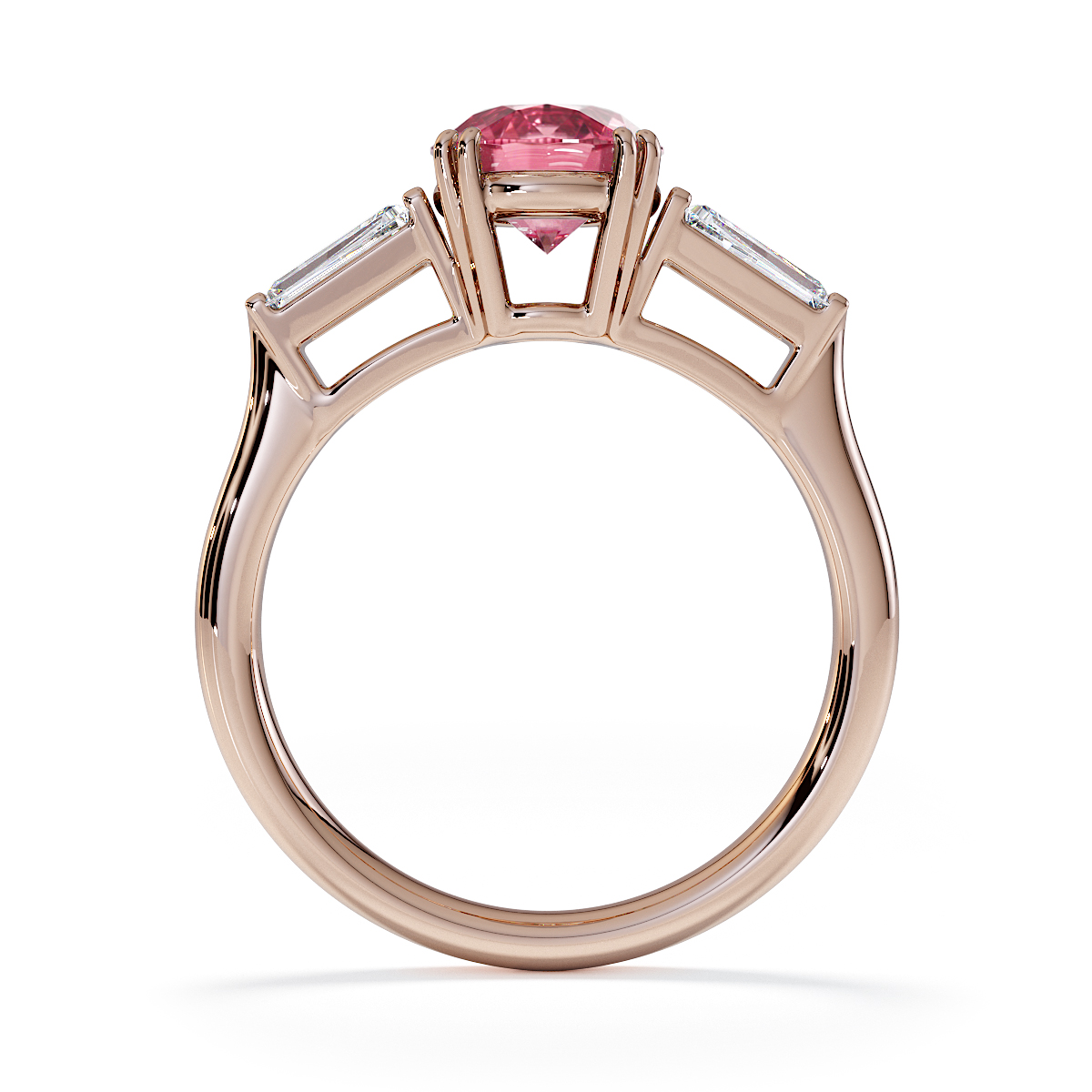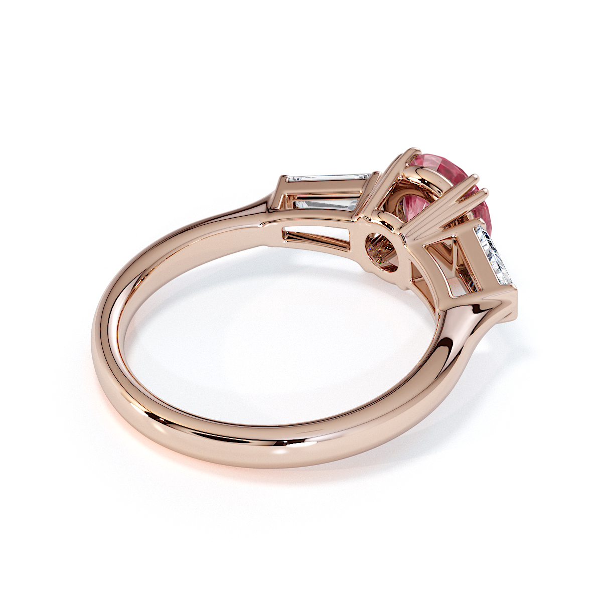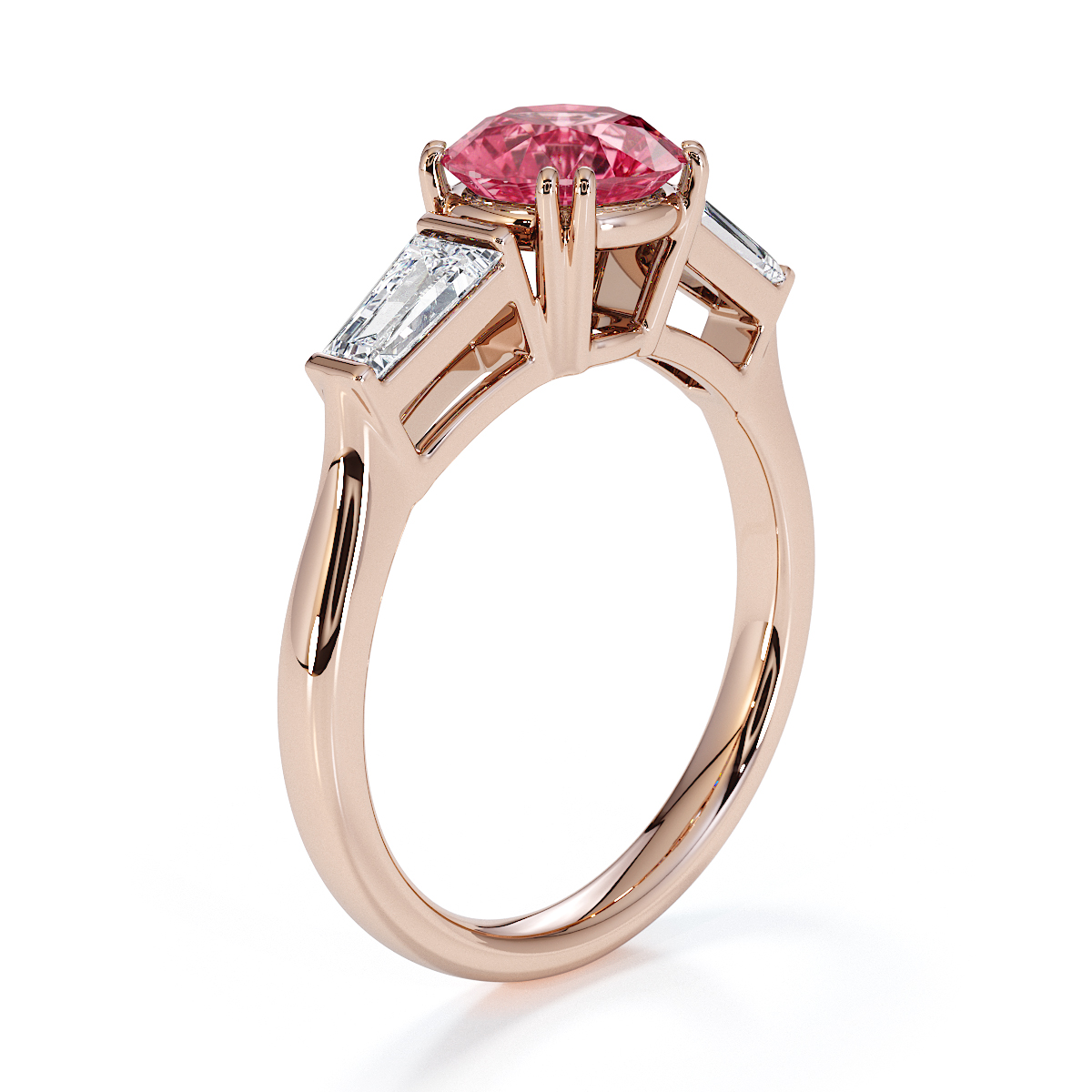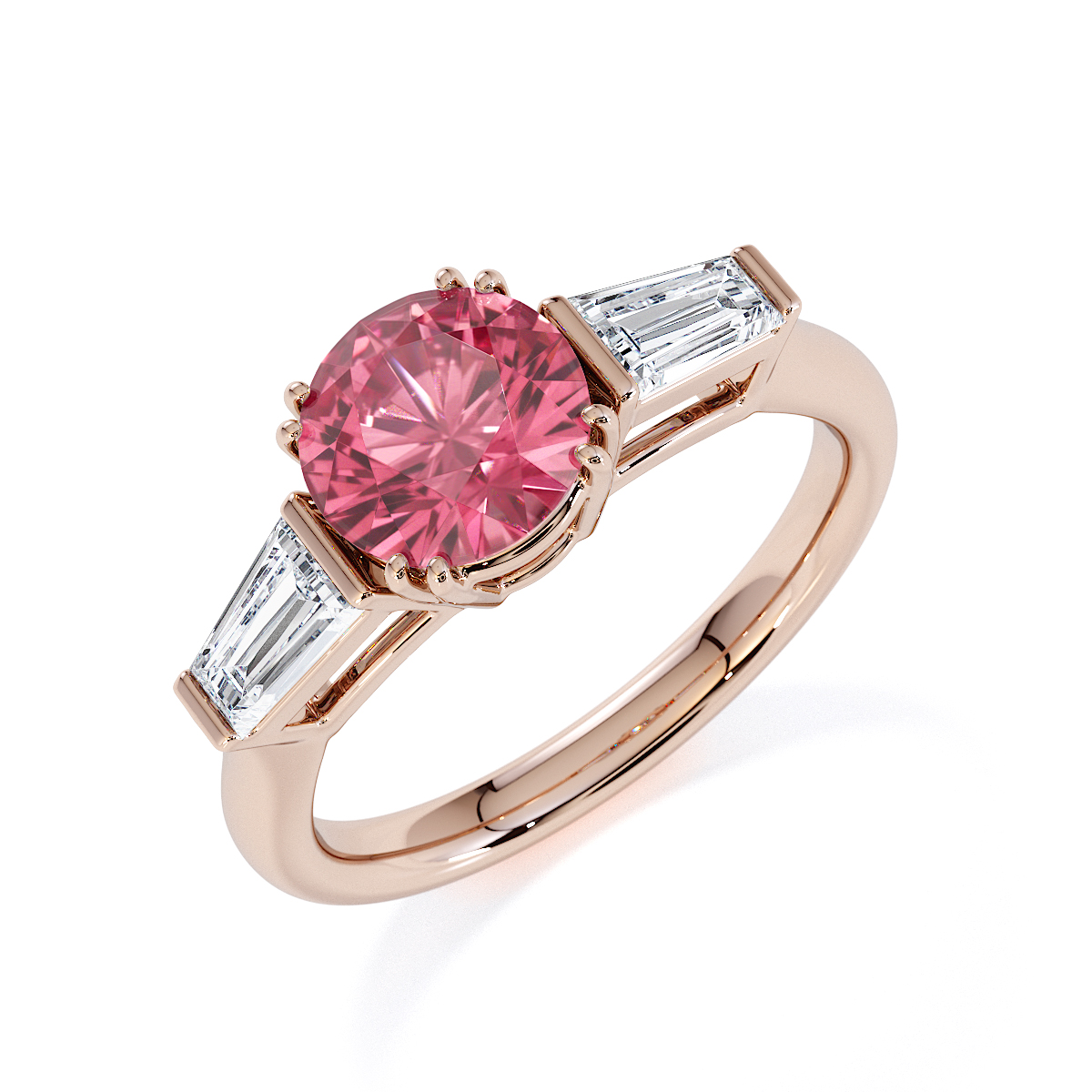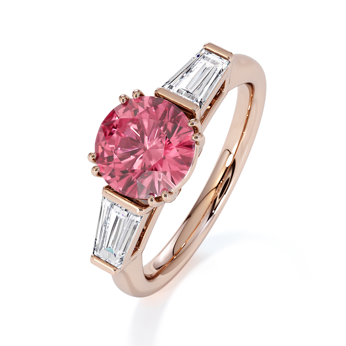 Introducing our exquisite round cut Pink Tourmaline and Diamond Engagement Ring, adorned with tapered baguette side stones delicately prong-set.