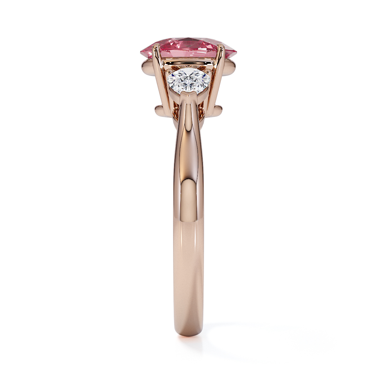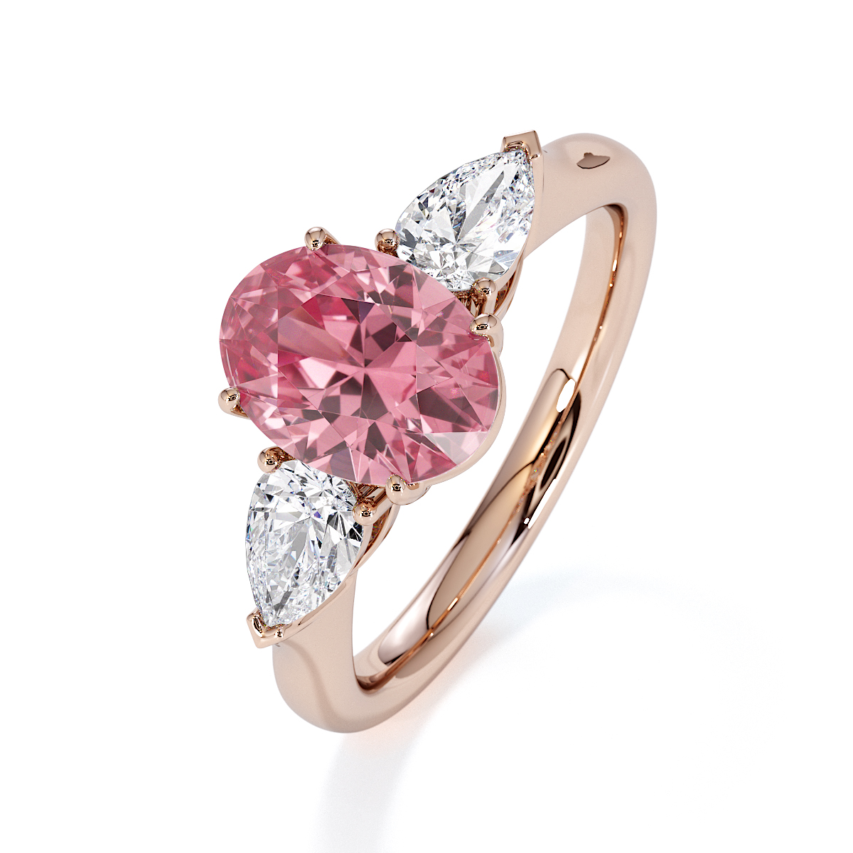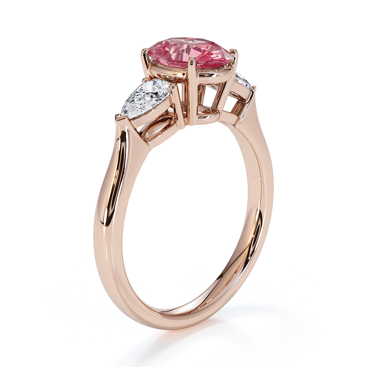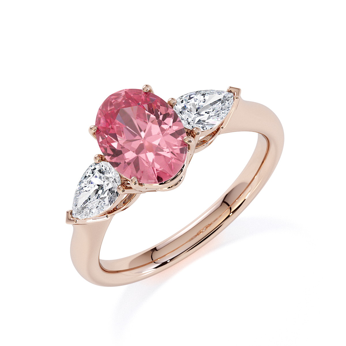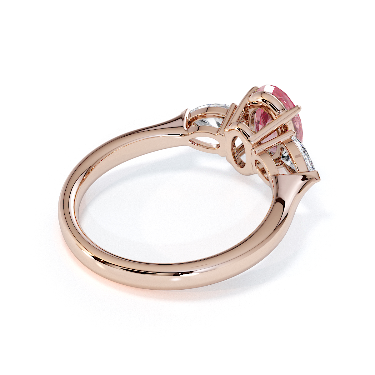 Introducing our exquisite oval-cut Pink Tourmaline and Diamond Engagement Ring, adorned with pear-shaped side stones delicately prong-set.
