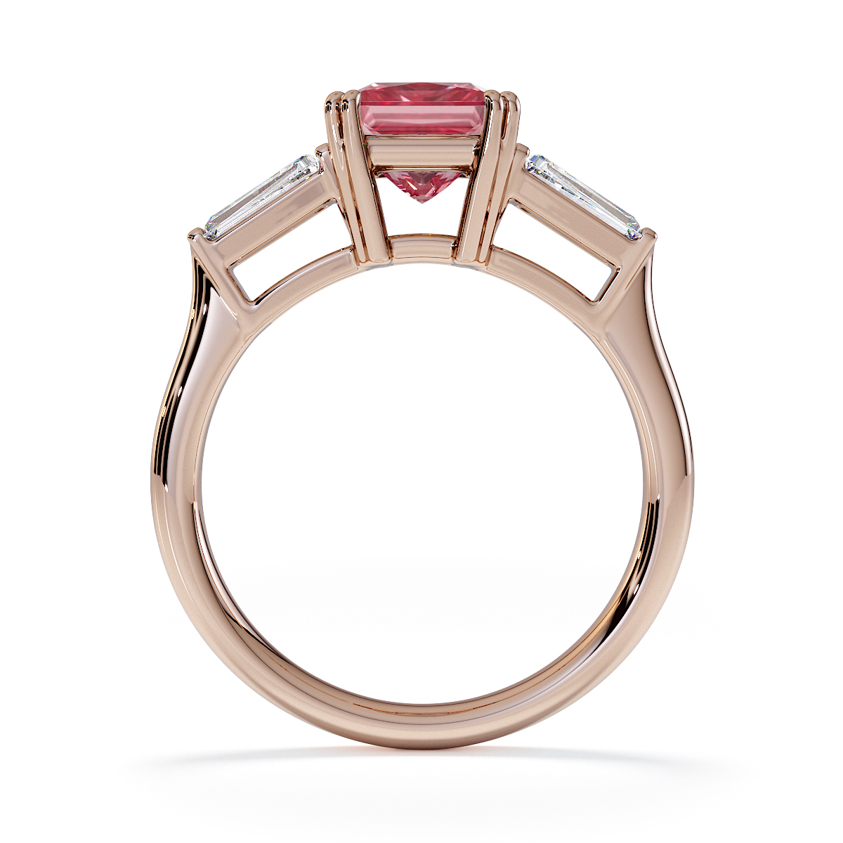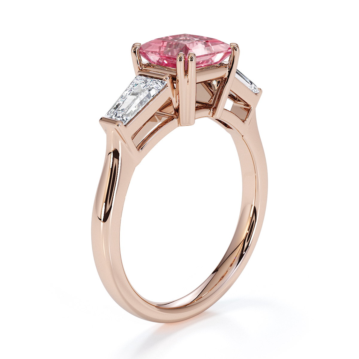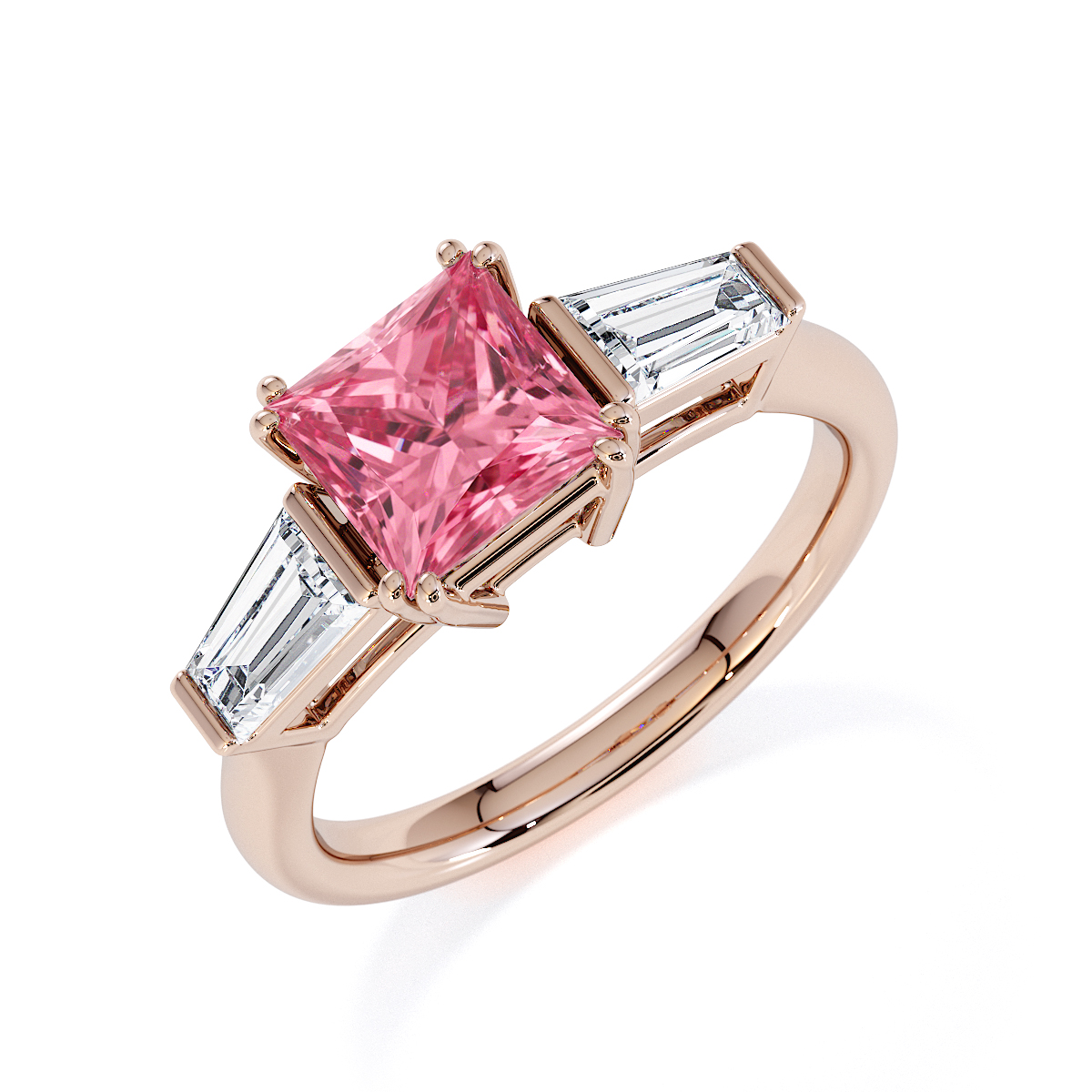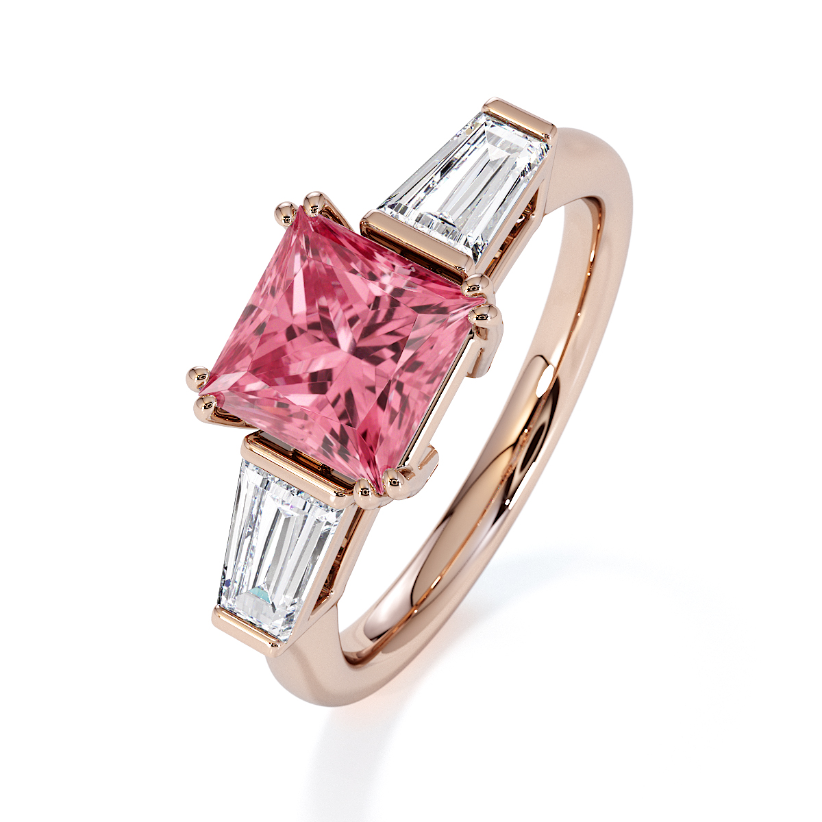 Introducing our exquisite Princess Cut Pink Tourmaline and Diamond Engagement Ring, featuring elegant side-tapered baguette diamonds intricately prong-set.