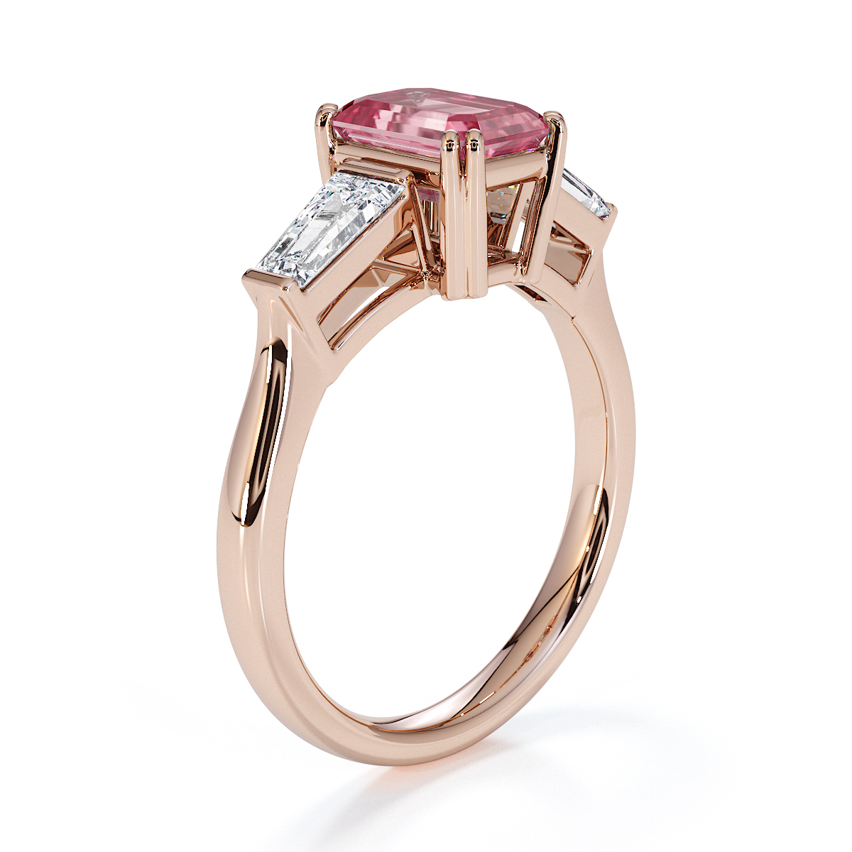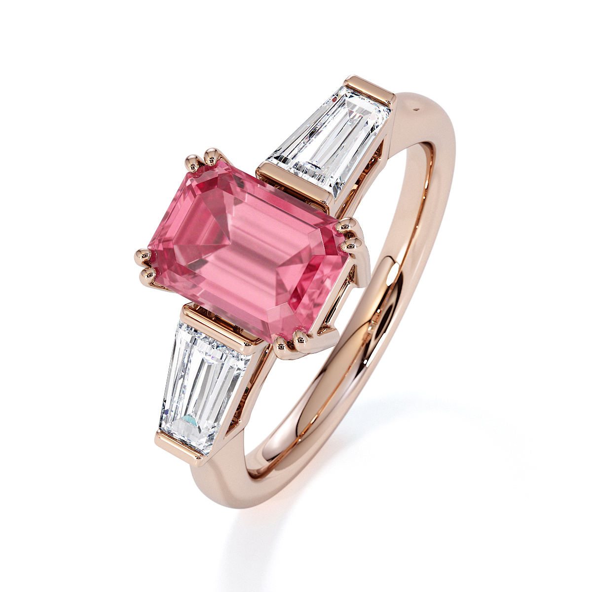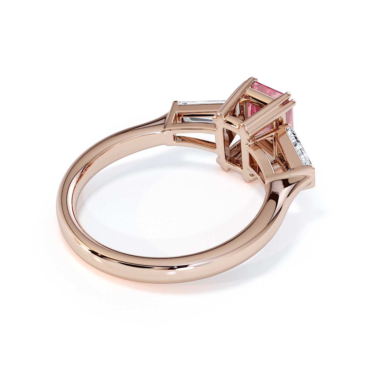Introducing our exquisite Emerald-Cut Pink Tourmaline and Diamond Engagement Ring, featuring elegant side-tapered baguette diamonds intricately prong-set.