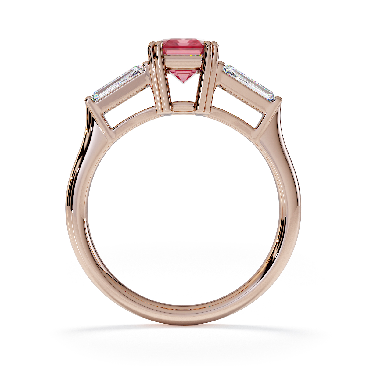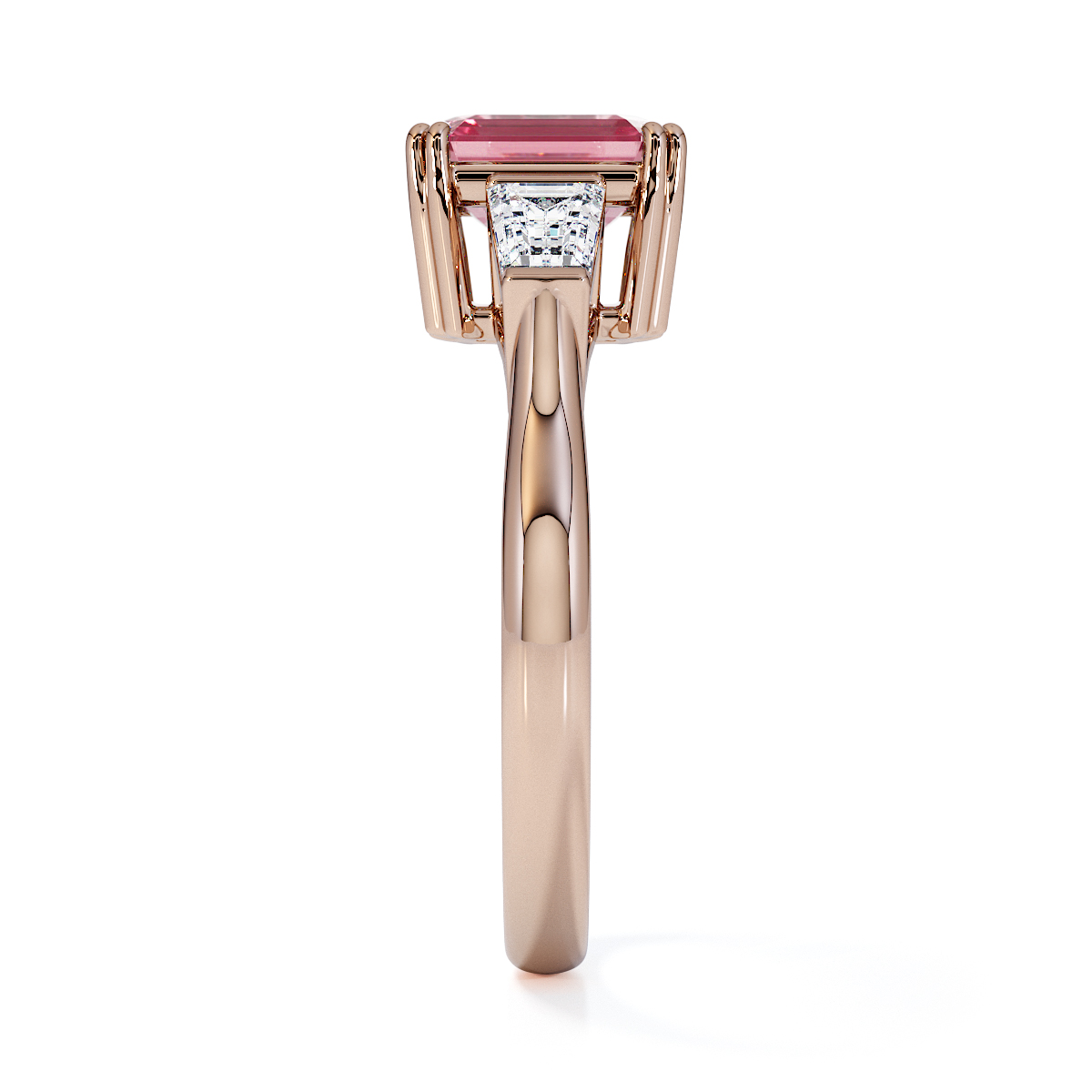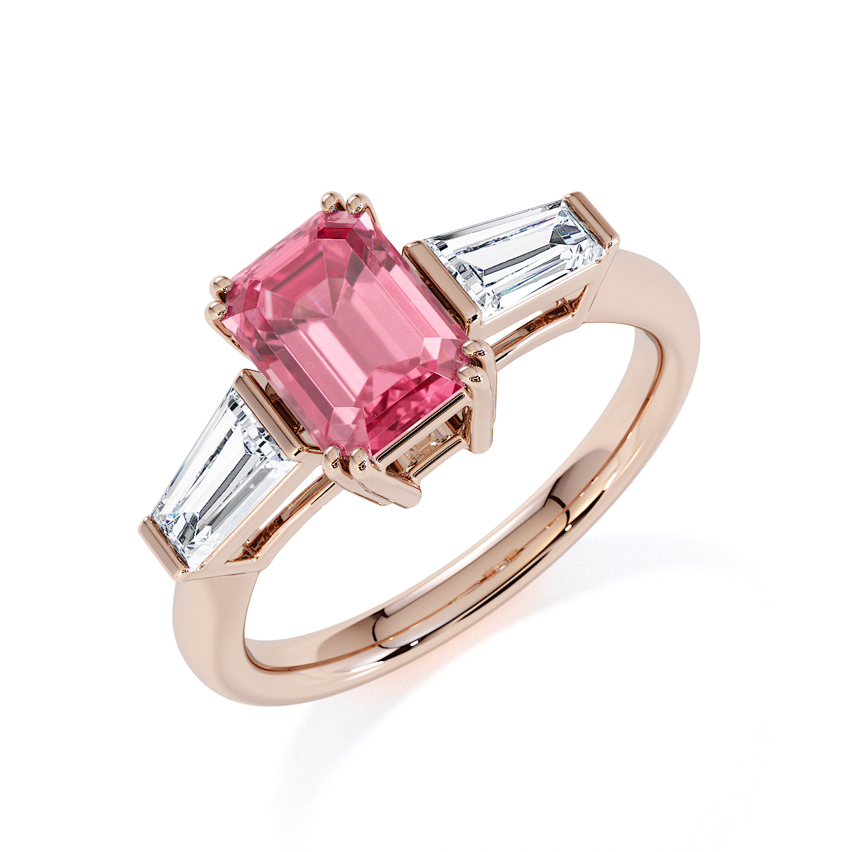Introducing our exquisite Emerald-Cut Pink Tourmaline and Diamond Engagement Ring, featuring elegant side-tapered baguette diamonds intricately prong-set.