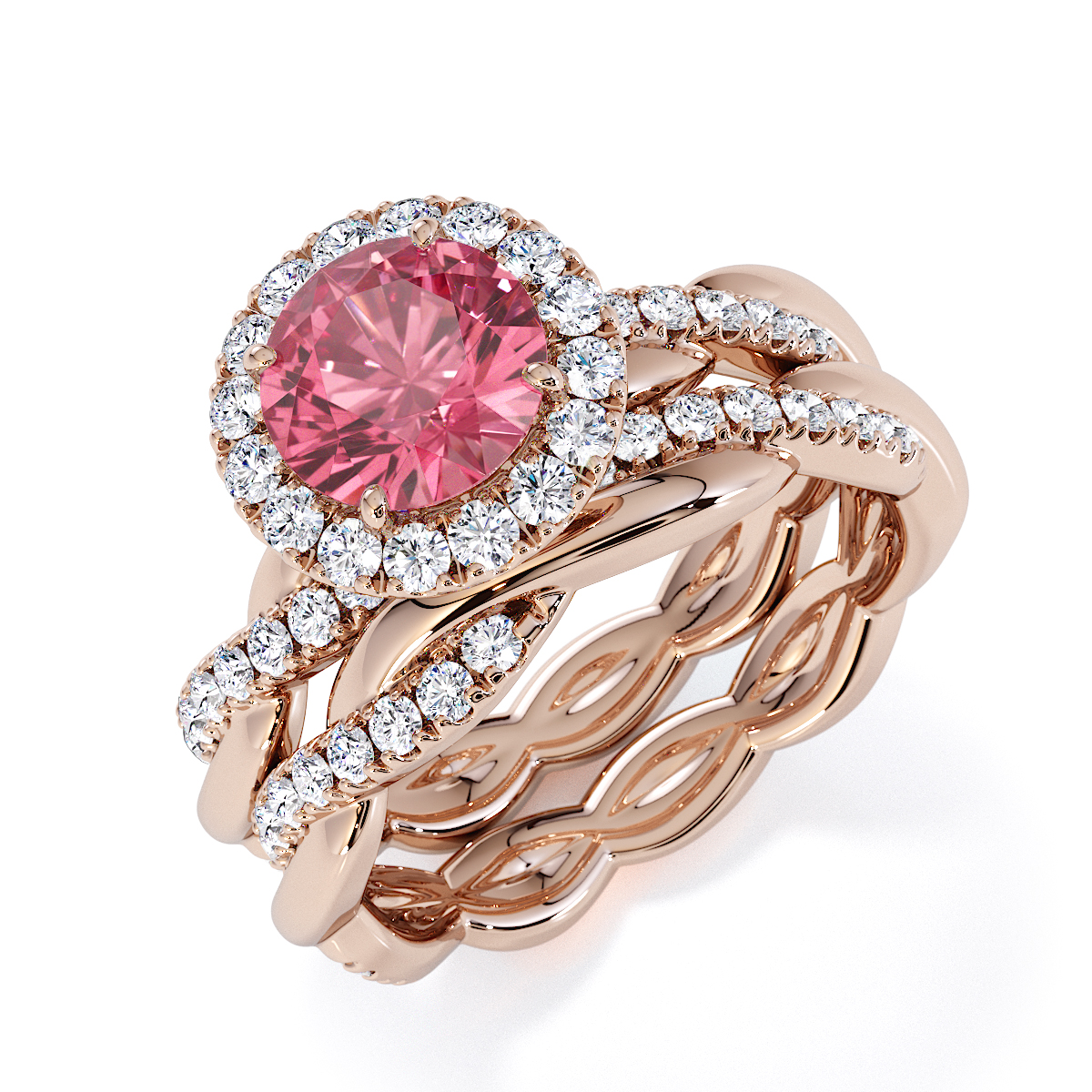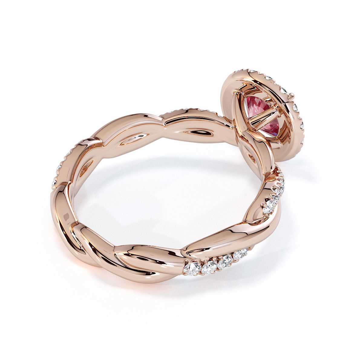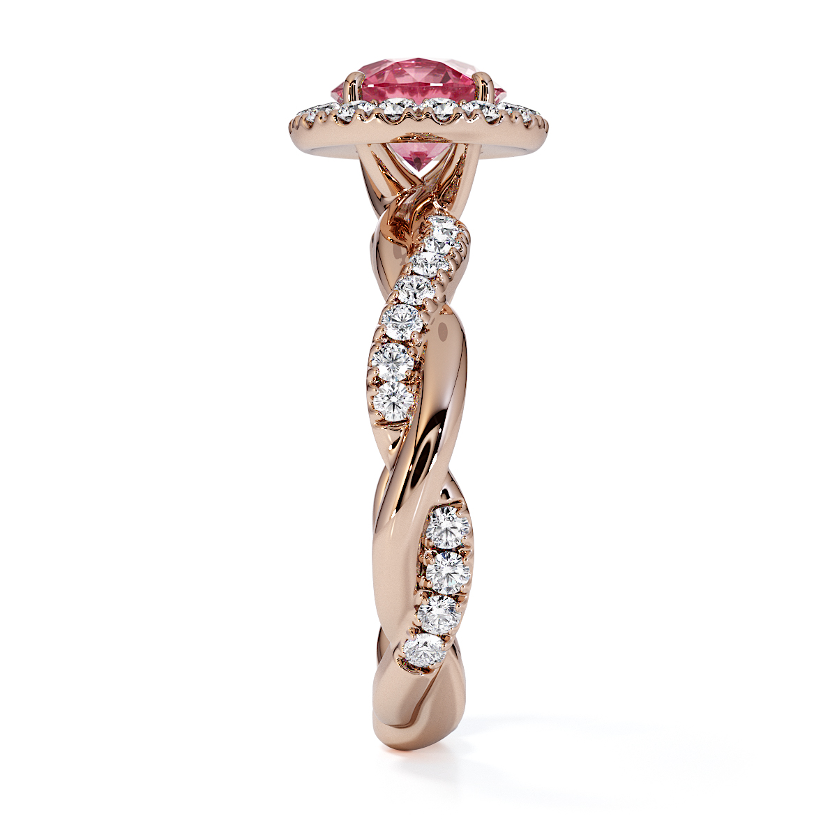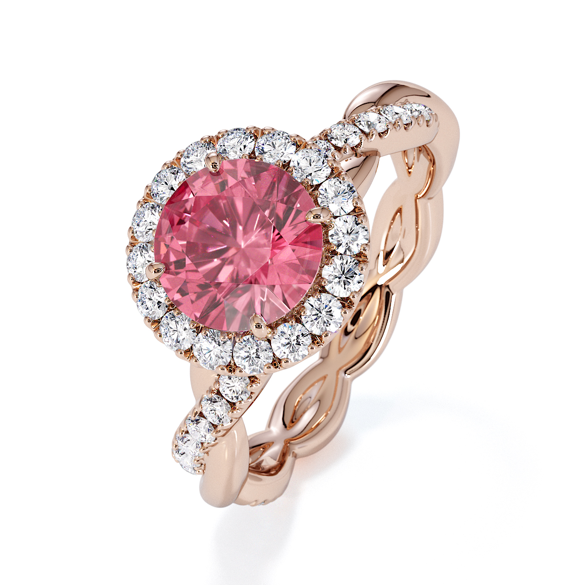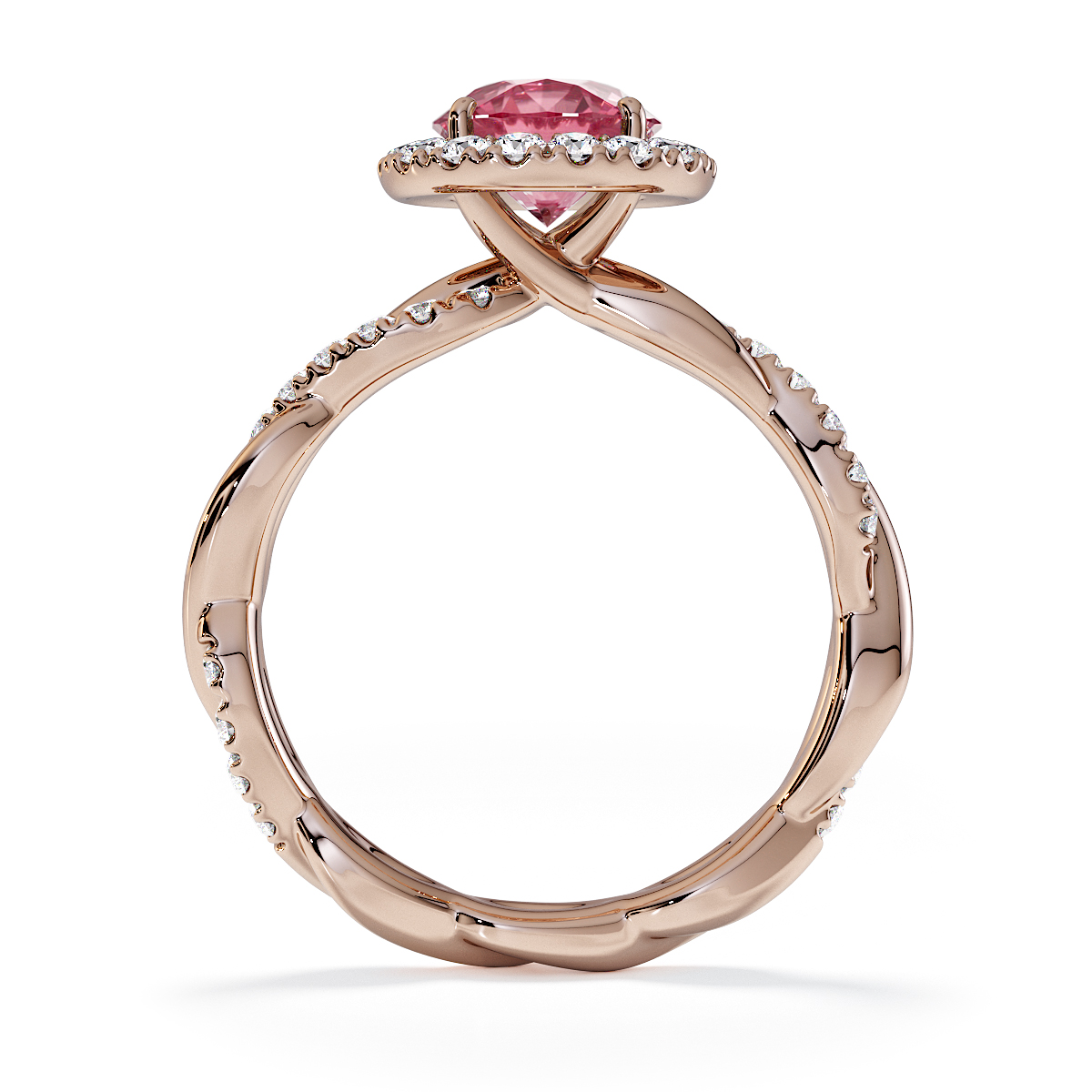 Presenting our stunning round cut Pink Tourmaline and Diamond Engagement Ring. The ring is further adorned with a halo and prong-set diamonds running up the twisted shoulders. It perfectly complements the wedding ring of your choice.
