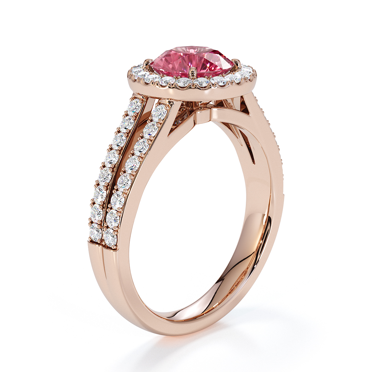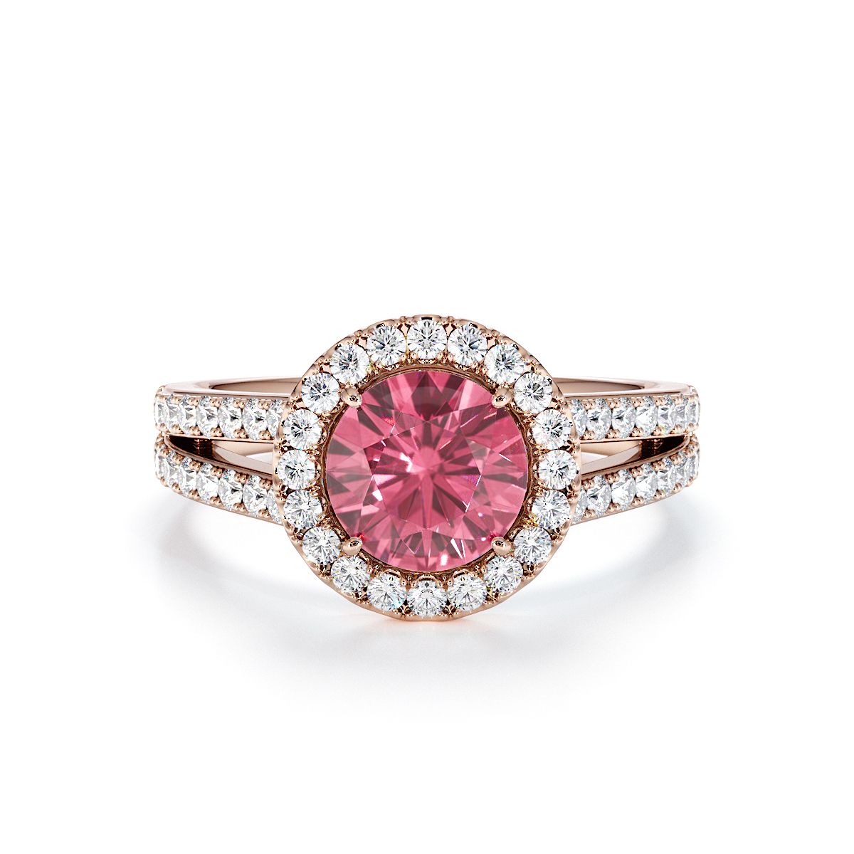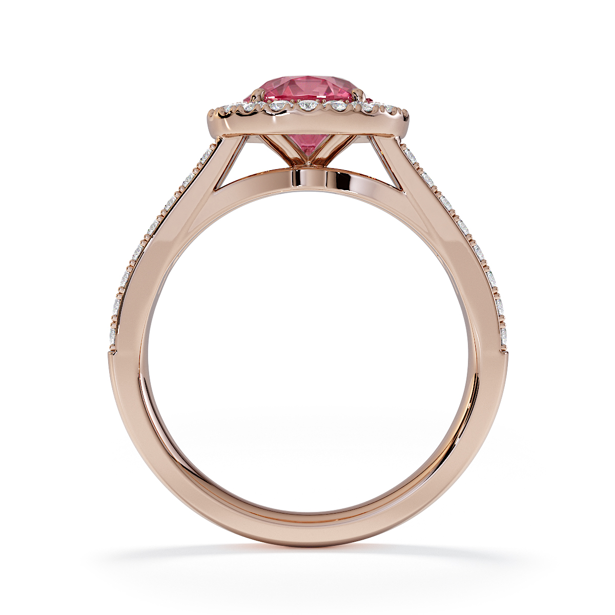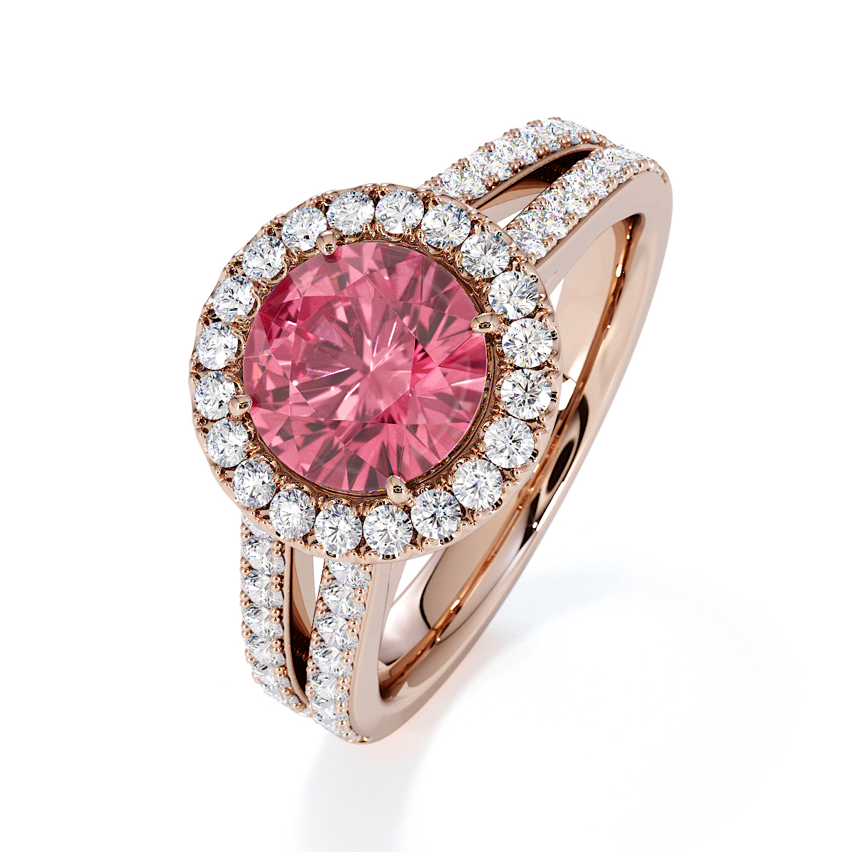 Featuring a gorgeous round-shaped Pink Tourmaline and Diamond Engagement Ring surrounded by a halo of round brilliant stones, the ring is further adorned with prong-set diamonds running up the split shank shoulders. This engagement ring beautifully complements the wedding ring of your choice.