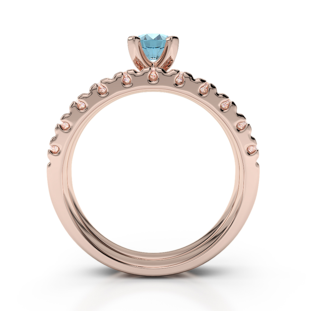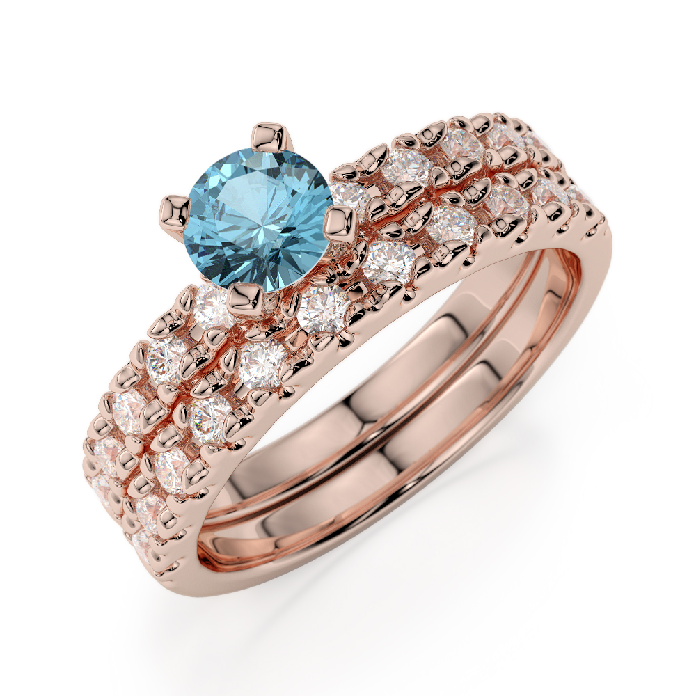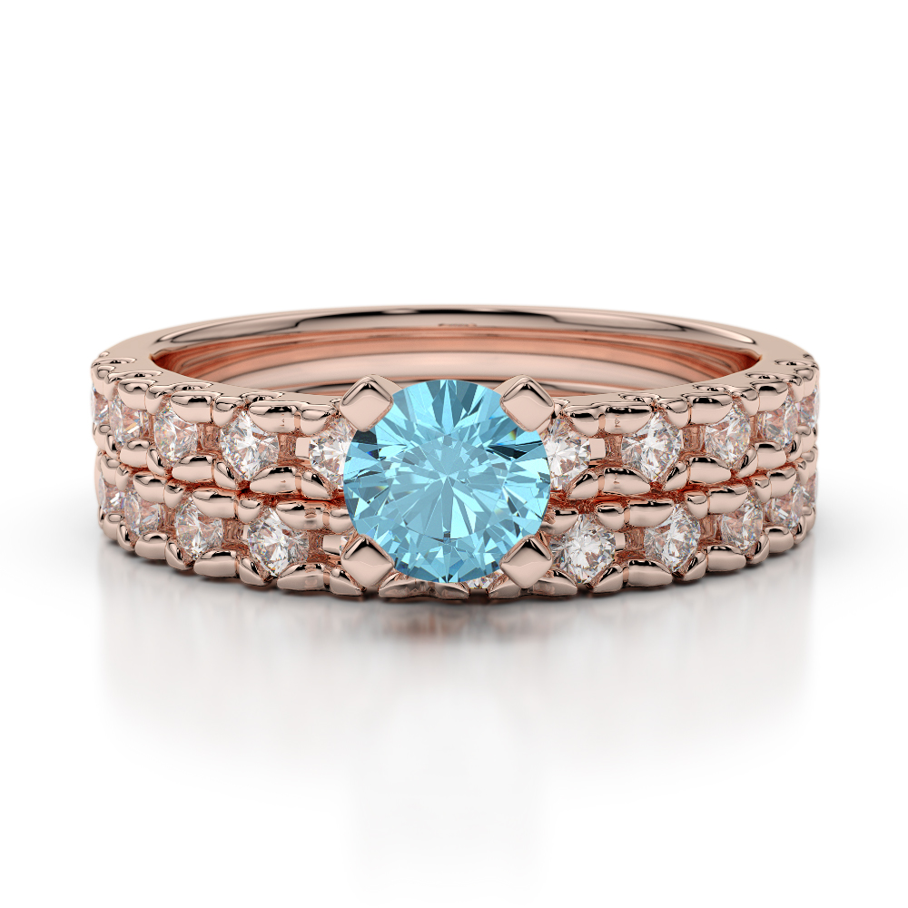 If you are looking for a truly breathtaking engagement ring and wedding ring, this gorgeous gold Aquamarine and diamond bridal band set is the perfect choice. These bridal set rings feature an engagement ring set with a striking Aquamarine at the centre and round brilliant cut diamonds adorn the engagement ring and wedding ring to stunning effect. The engagement ring will look exquisite when worn on the finger alone, and the look completed with the fabulous wedding ring on your special day. If you are looking for bridal set rings that are made to last forever, these are the rings to choose.