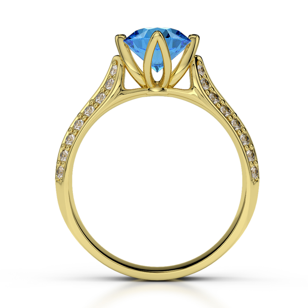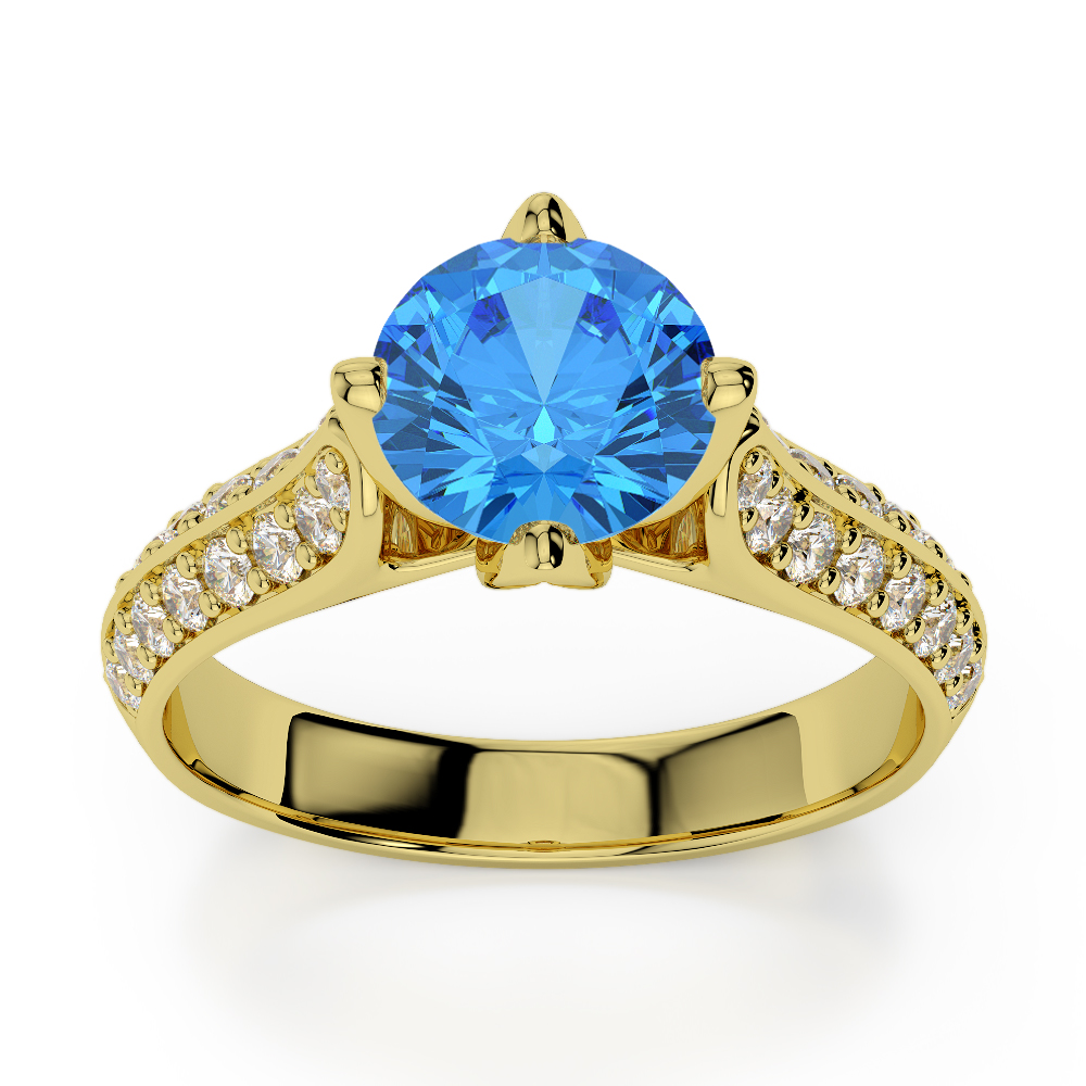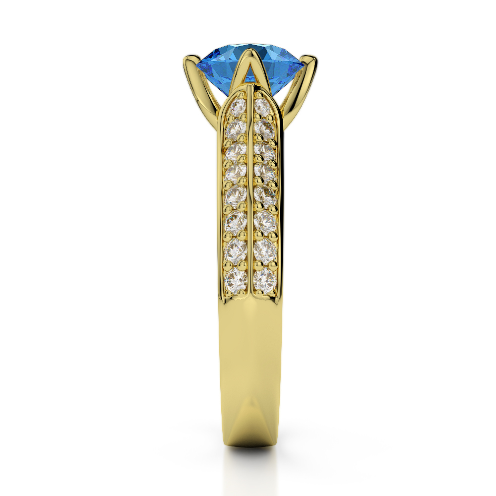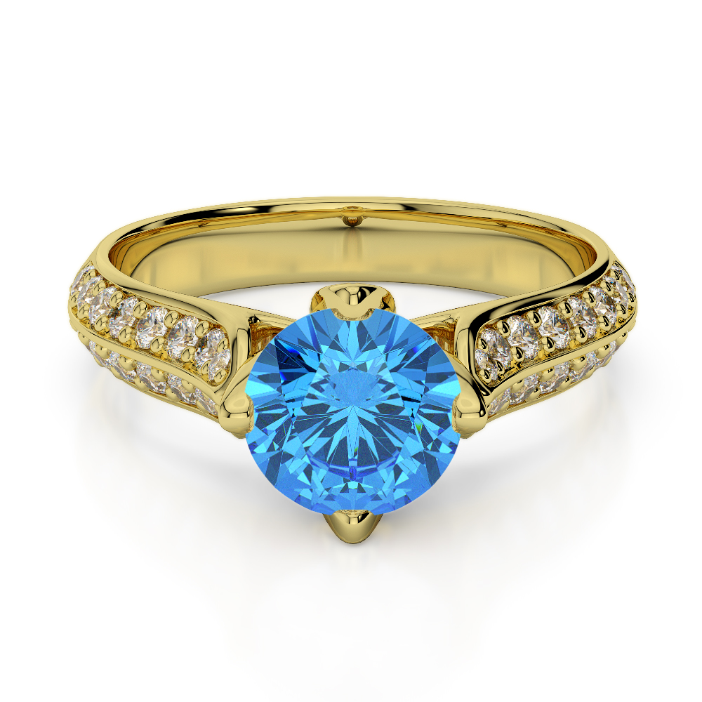A beautiful Yellow Gold Diamond and Blue Topaz Engagement Ring studded with naturally mined conflict free Diamonds. Beautifully designed to fit your love finger adding comfort with style to your look.