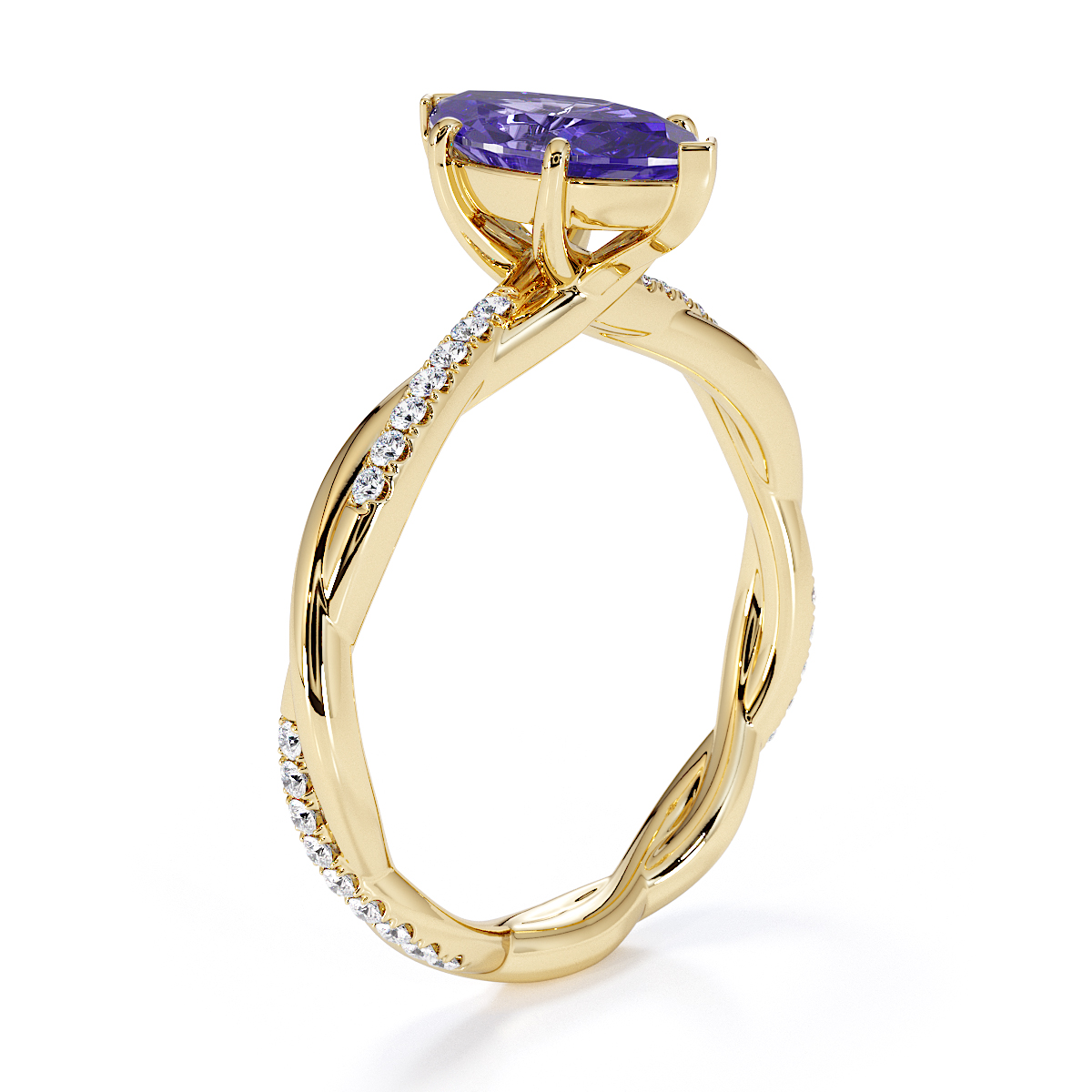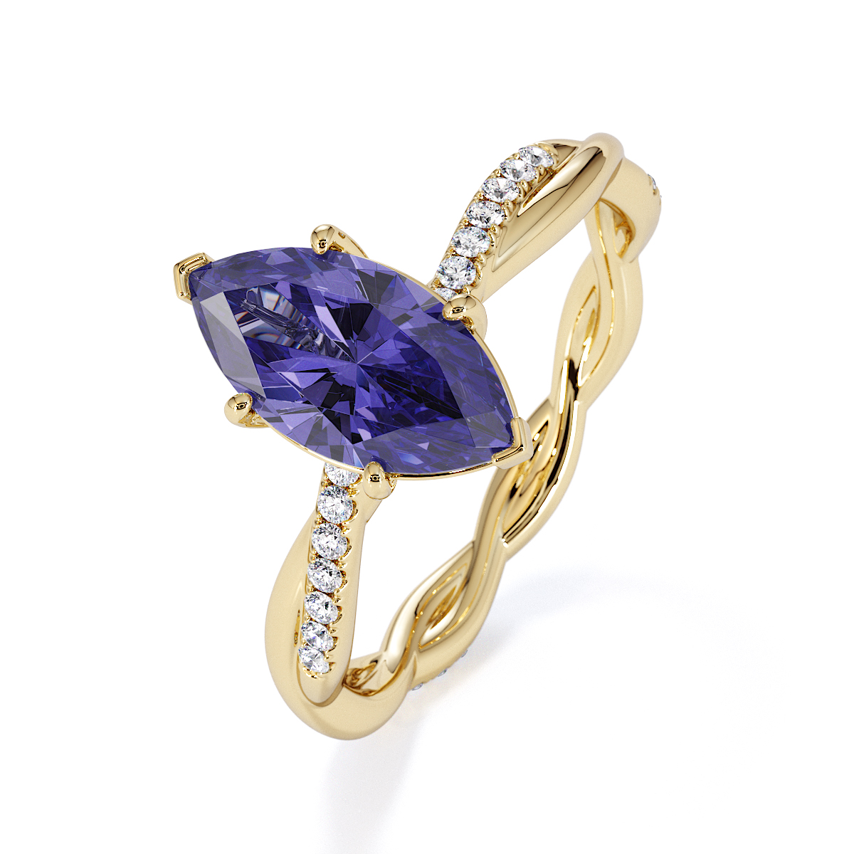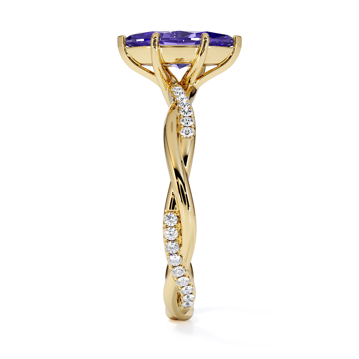 Presenting our stunning Marquise Cut Tanzanite and Diamond Engagement Ring. The ring is further adorned with prong-set diamonds running up the twisted shoulders. It perfectly complements the wedding ring of your choice.