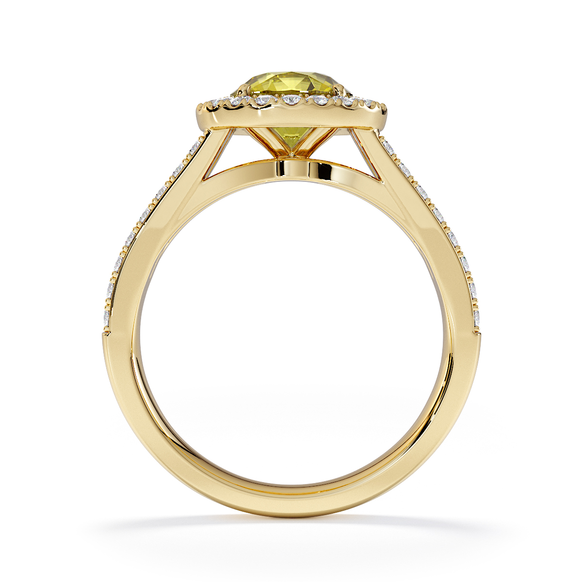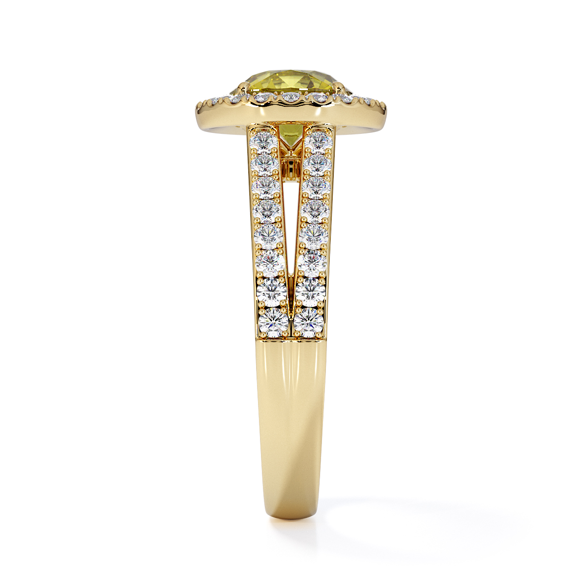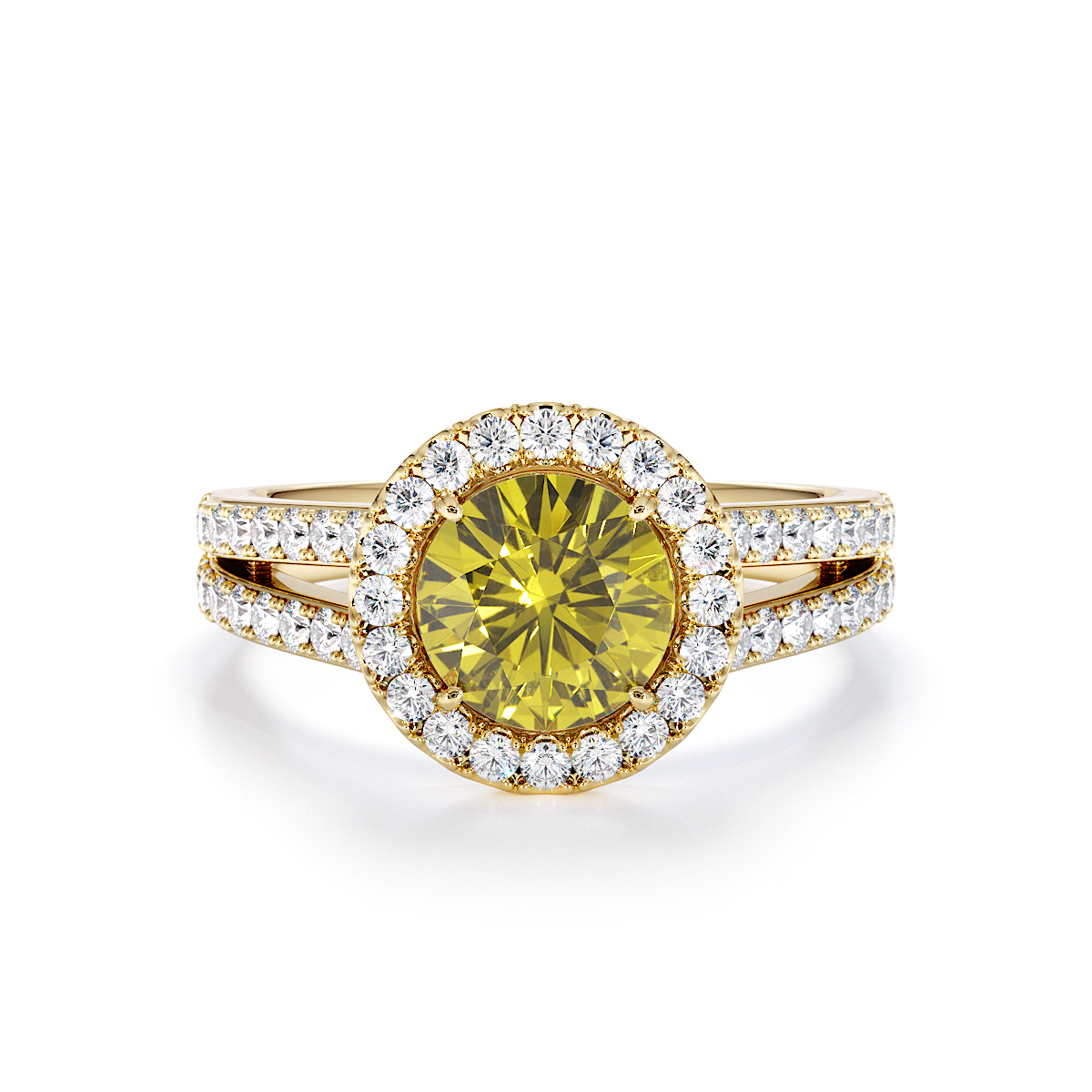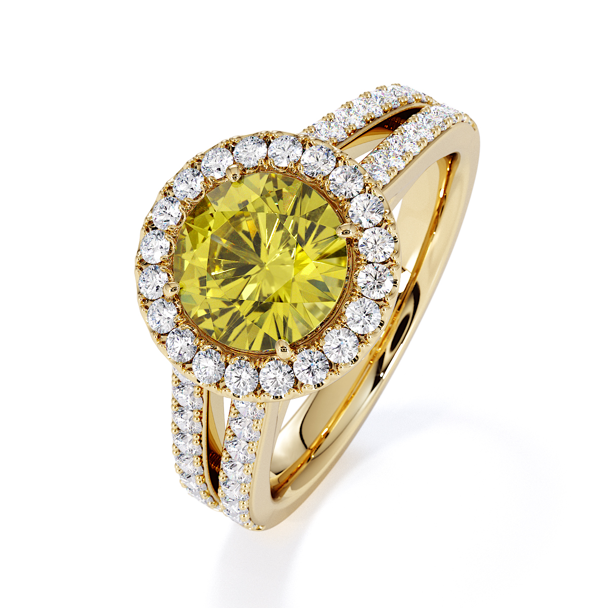 Featuring a gorgeous round-shaped Yellow Sapphire and Diamond Engagement Ring surrounded by a halo of round brilliant stones, the ring is further adorned with prong-set diamonds running up the split shank shoulders. This engagement ring beautifully complements the wedding ring of your choice.